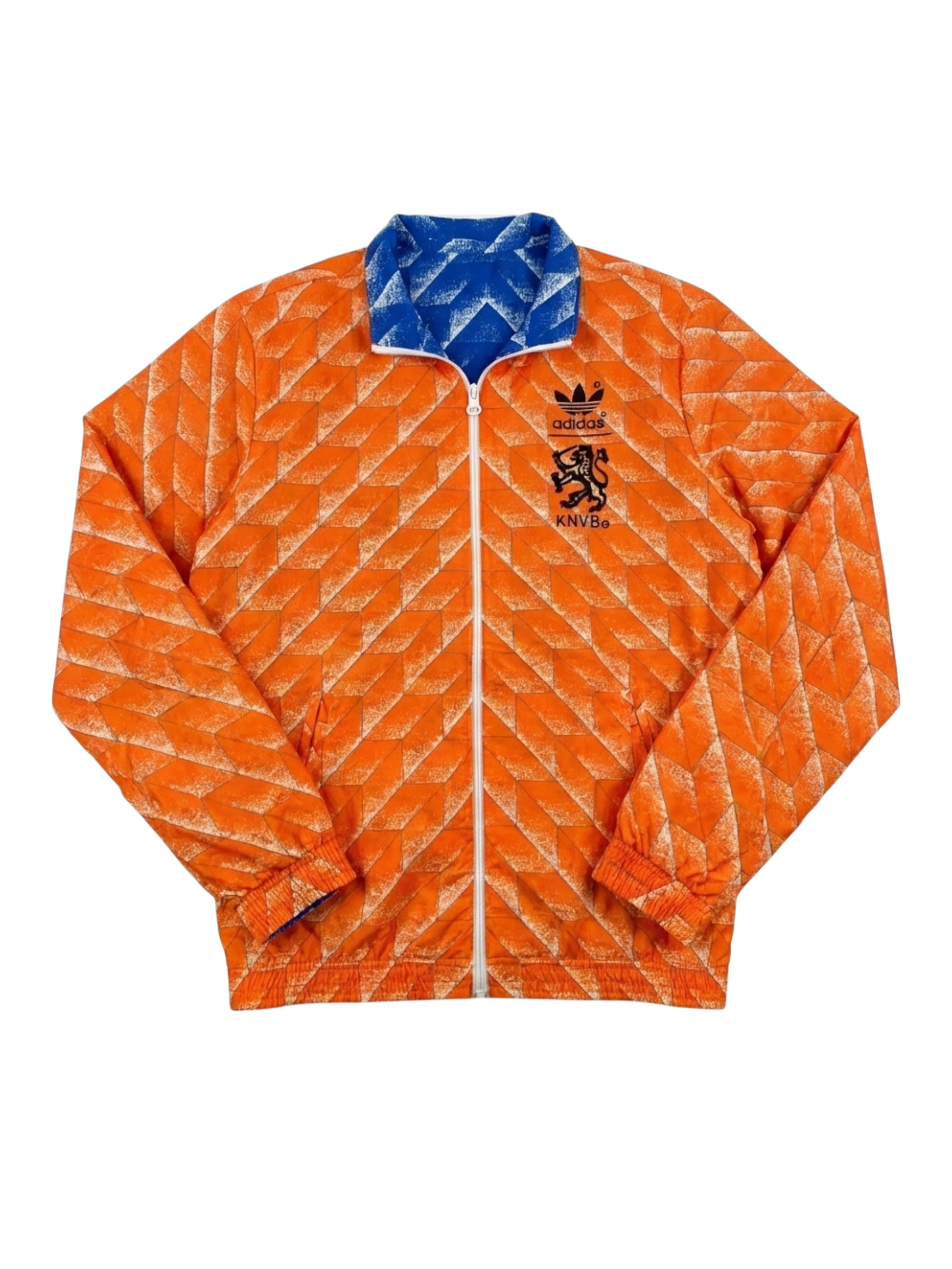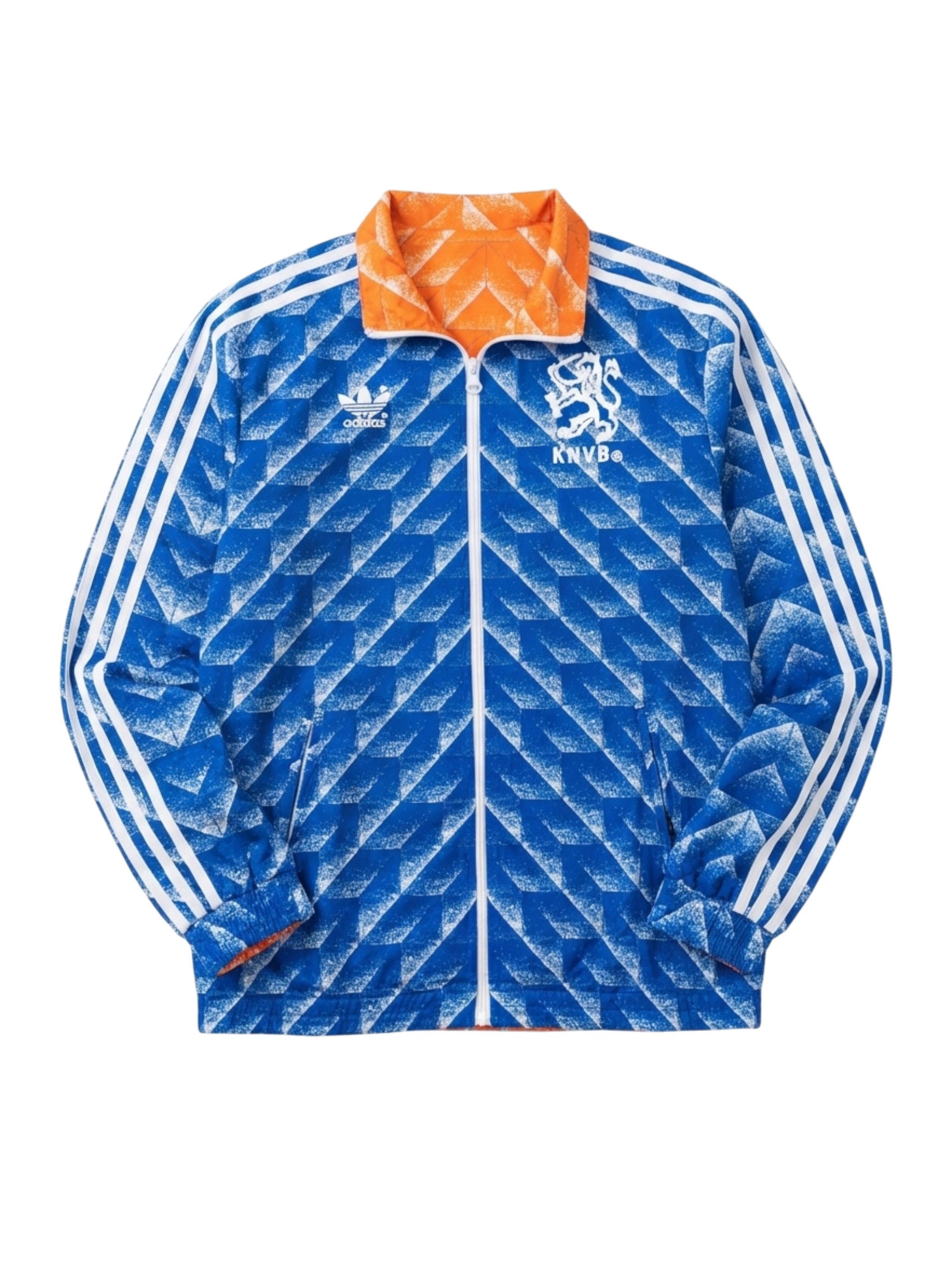 EURO88優勝期の象徴的シャード柄を再現し、オレンジ面とブルー面を切り替え可能な1988年復刻仕様のリバーシブルトラックジャケット。
