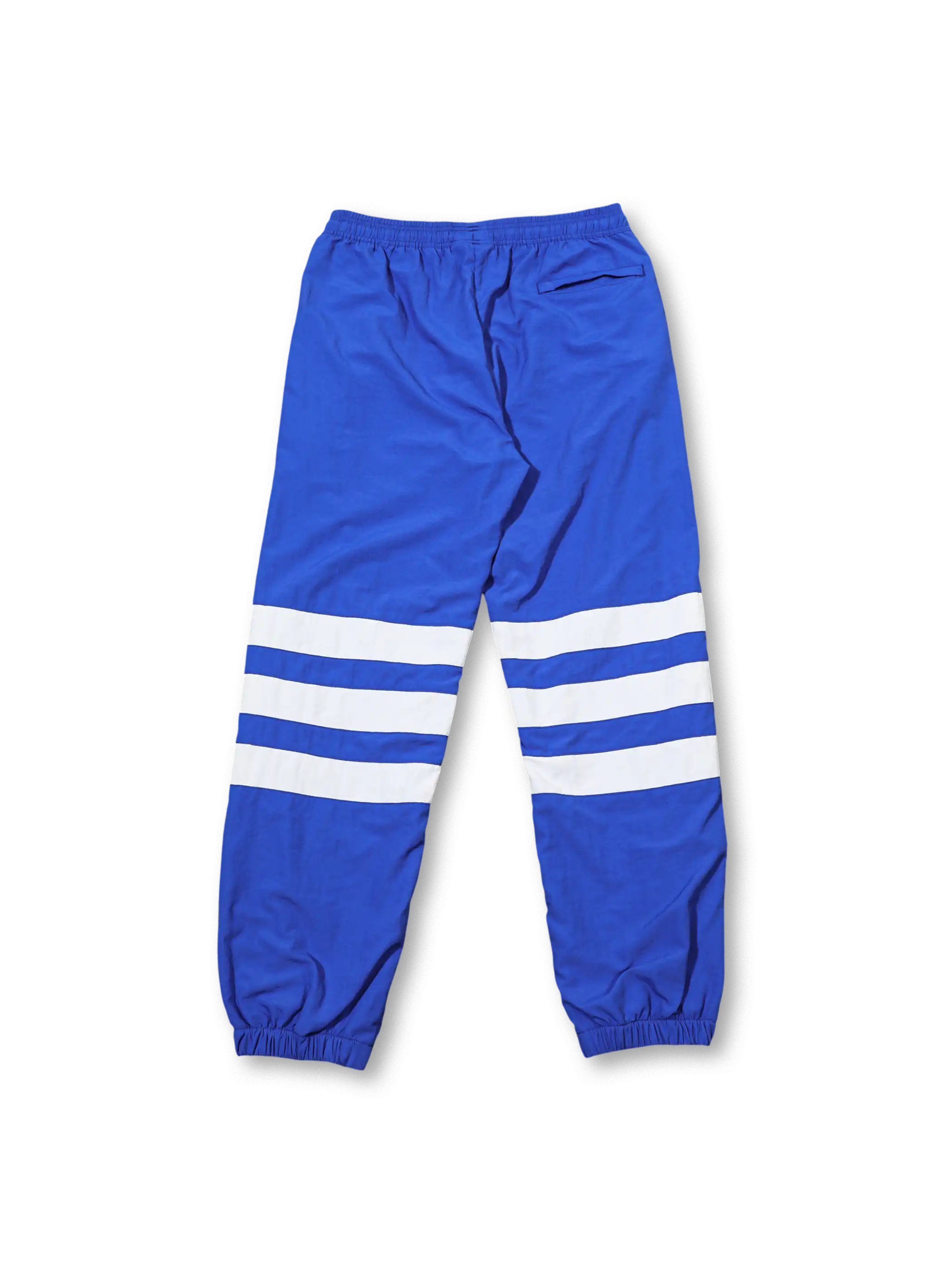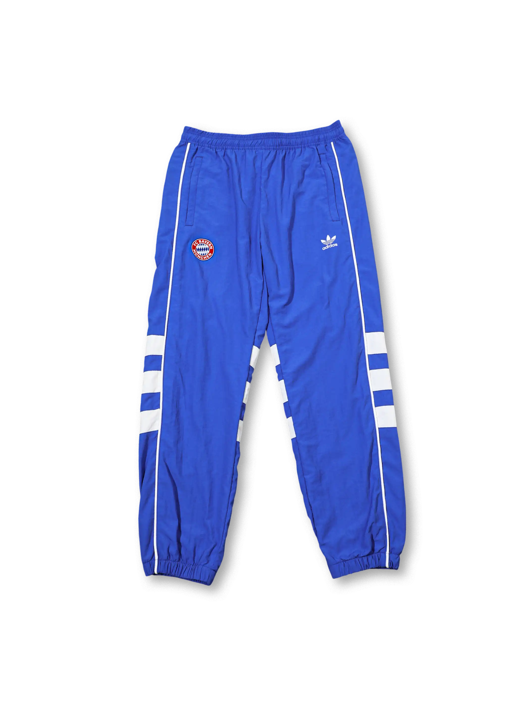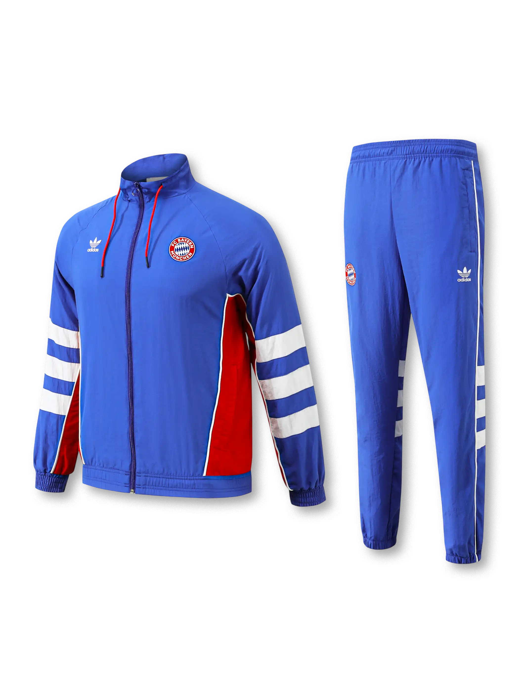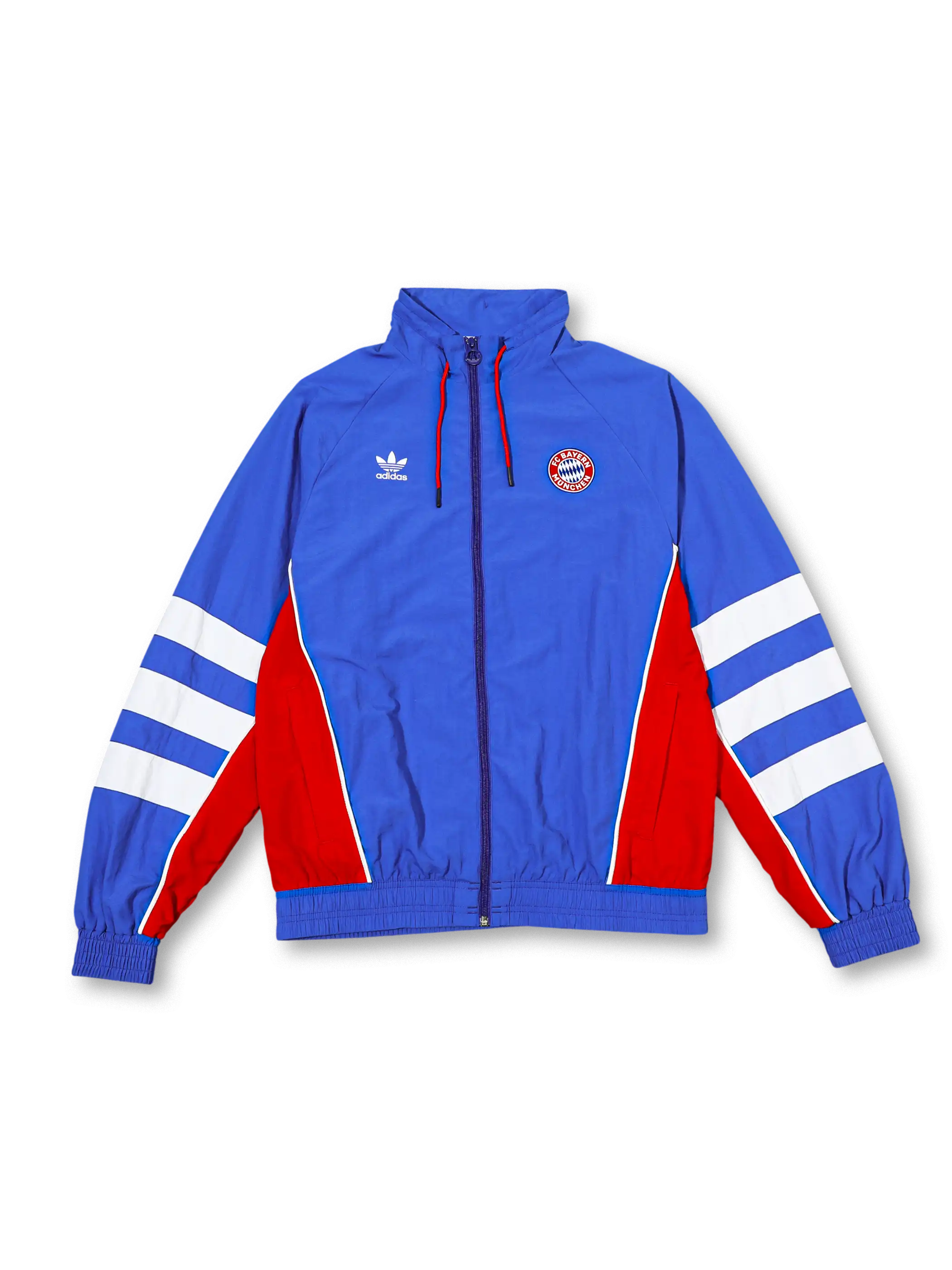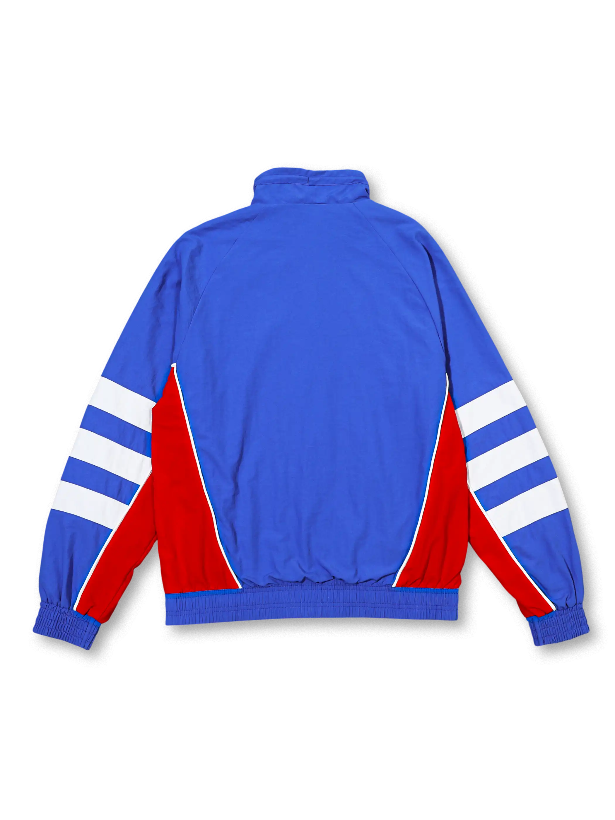 鮮やかなブルーを基調にレッドとホワイトラインを配した90年代特有のトリコロール構成で、胸元にはアディダスのトレフォイルとクラブエンブレムを刺繍配置し、軽量生地とゆとりあるシルエットにより当時のトレーニングウェアらしいクラシックな構造を再現した復刻セット。