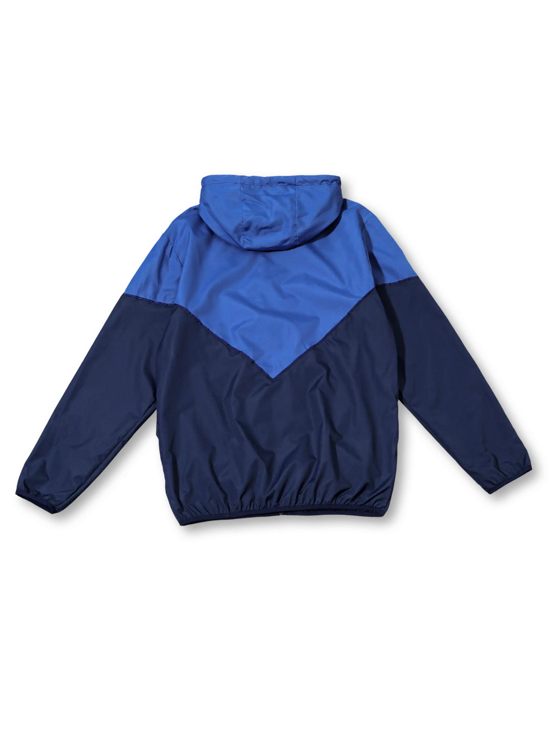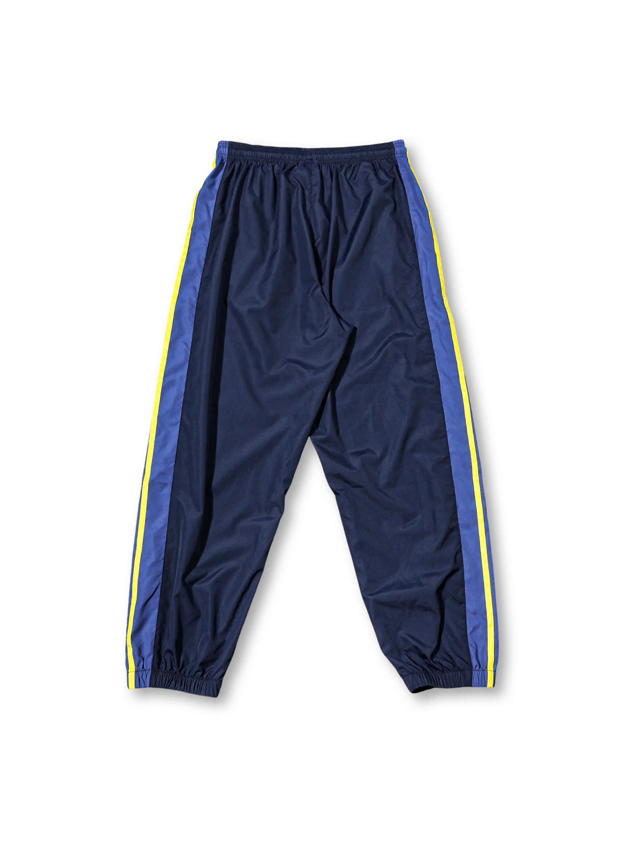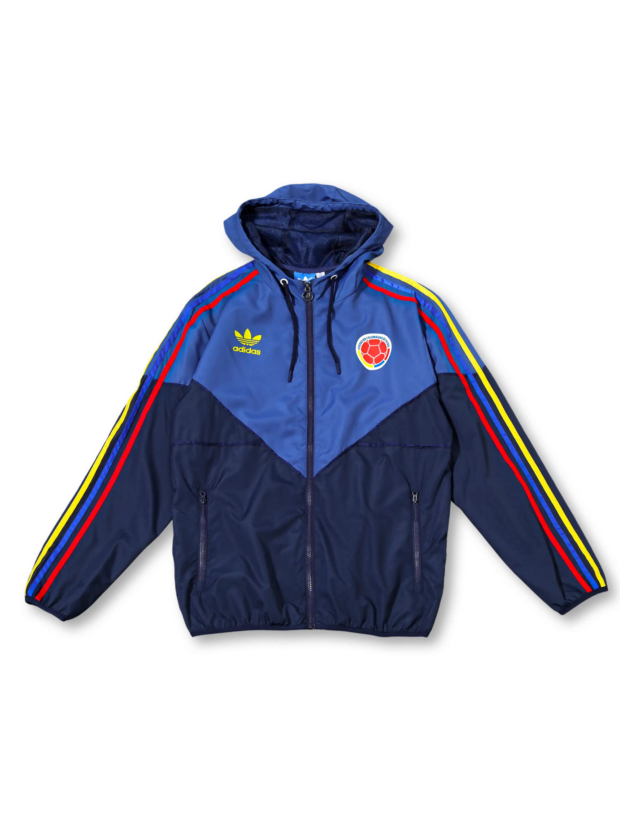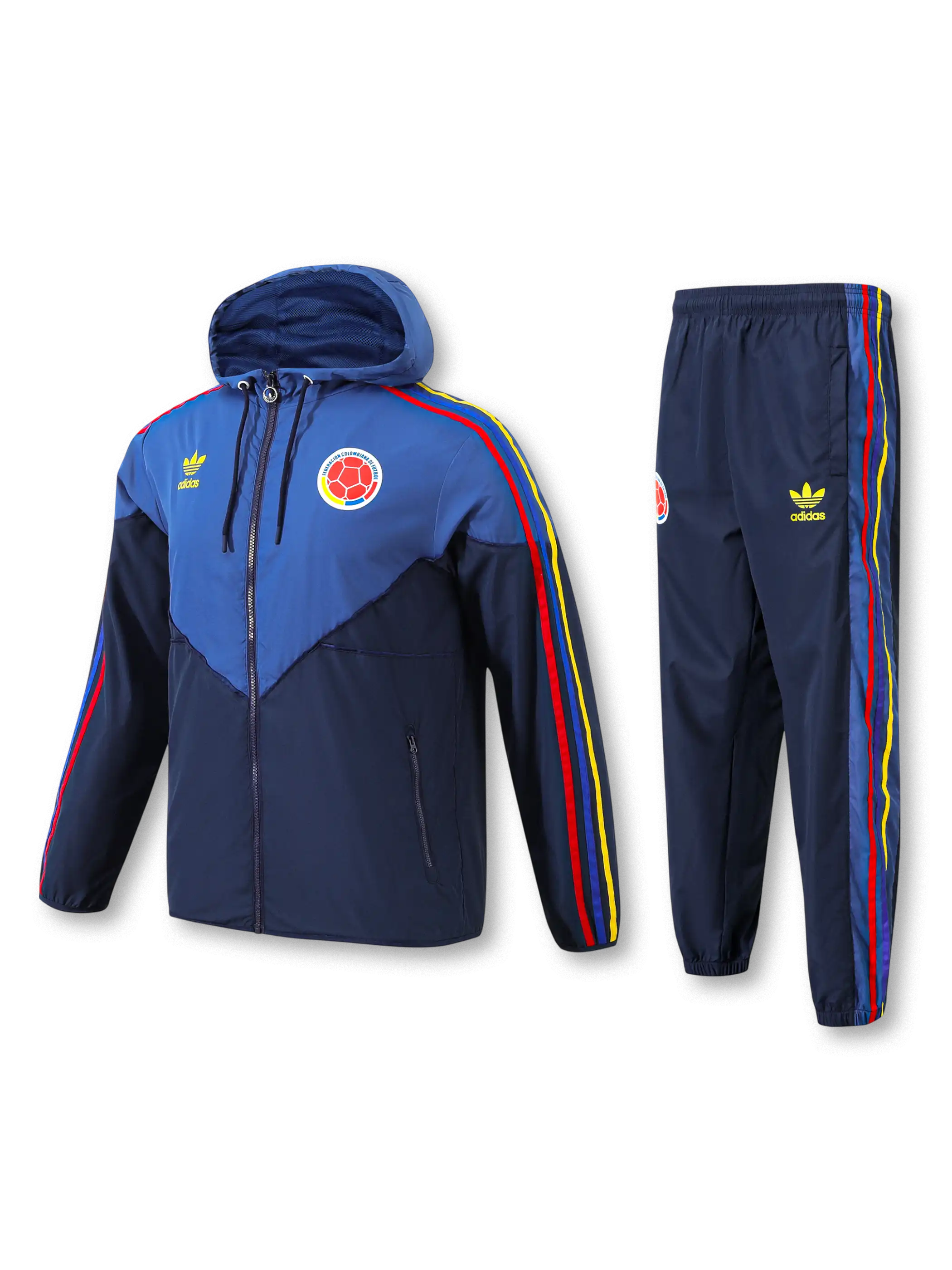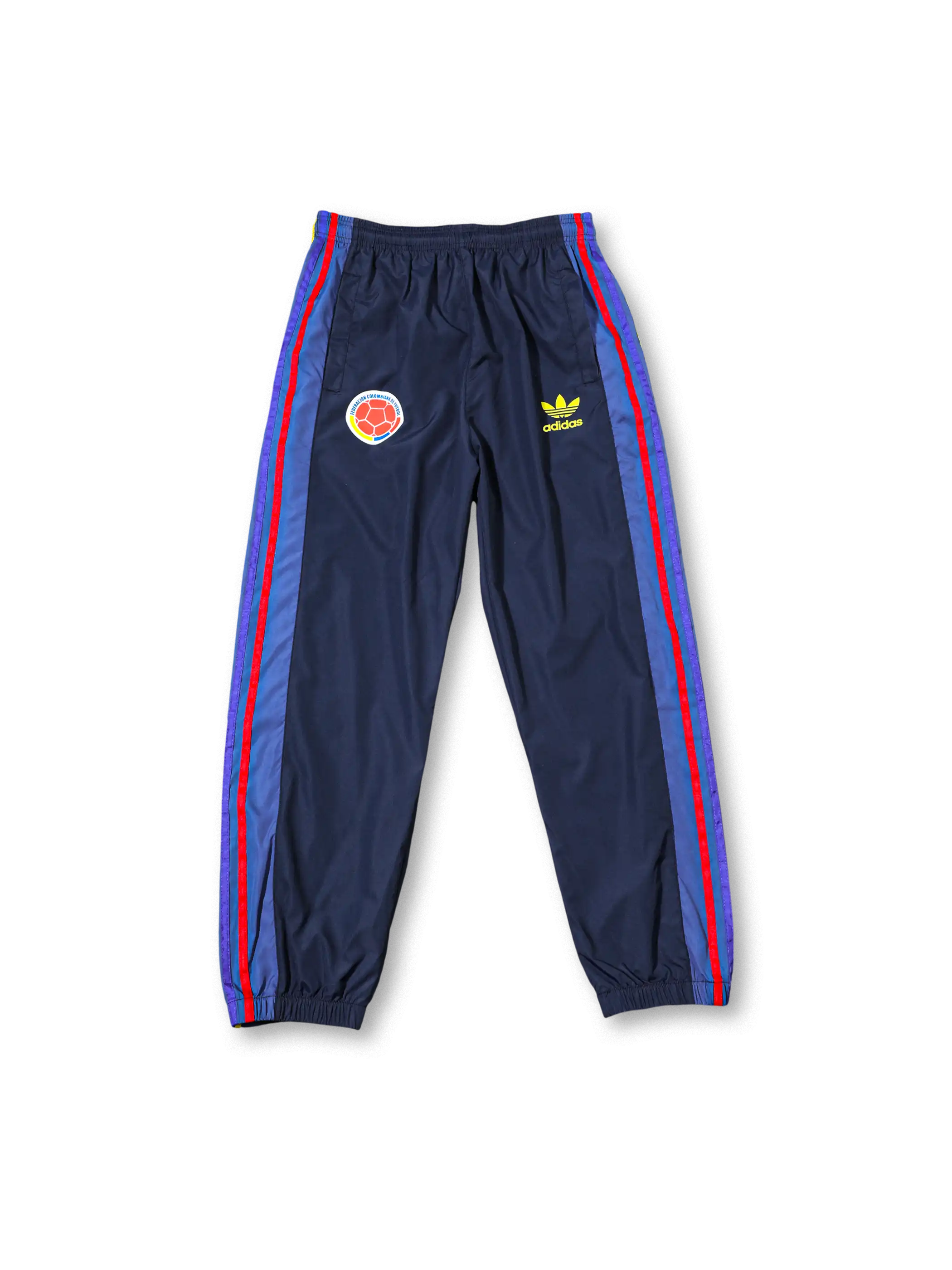 ミッドナイトネイビーを基調にブルー、レッド、イエローの三色ラインを配し、胸のトレフォイル刺繍とコロンビア代表エンブレムが際立つ構成で、軽量ナイロン生地とゆったりしたシルエットにより90年代特有のトレーニングウェアのディテールを忠実に再現した復刻セット。