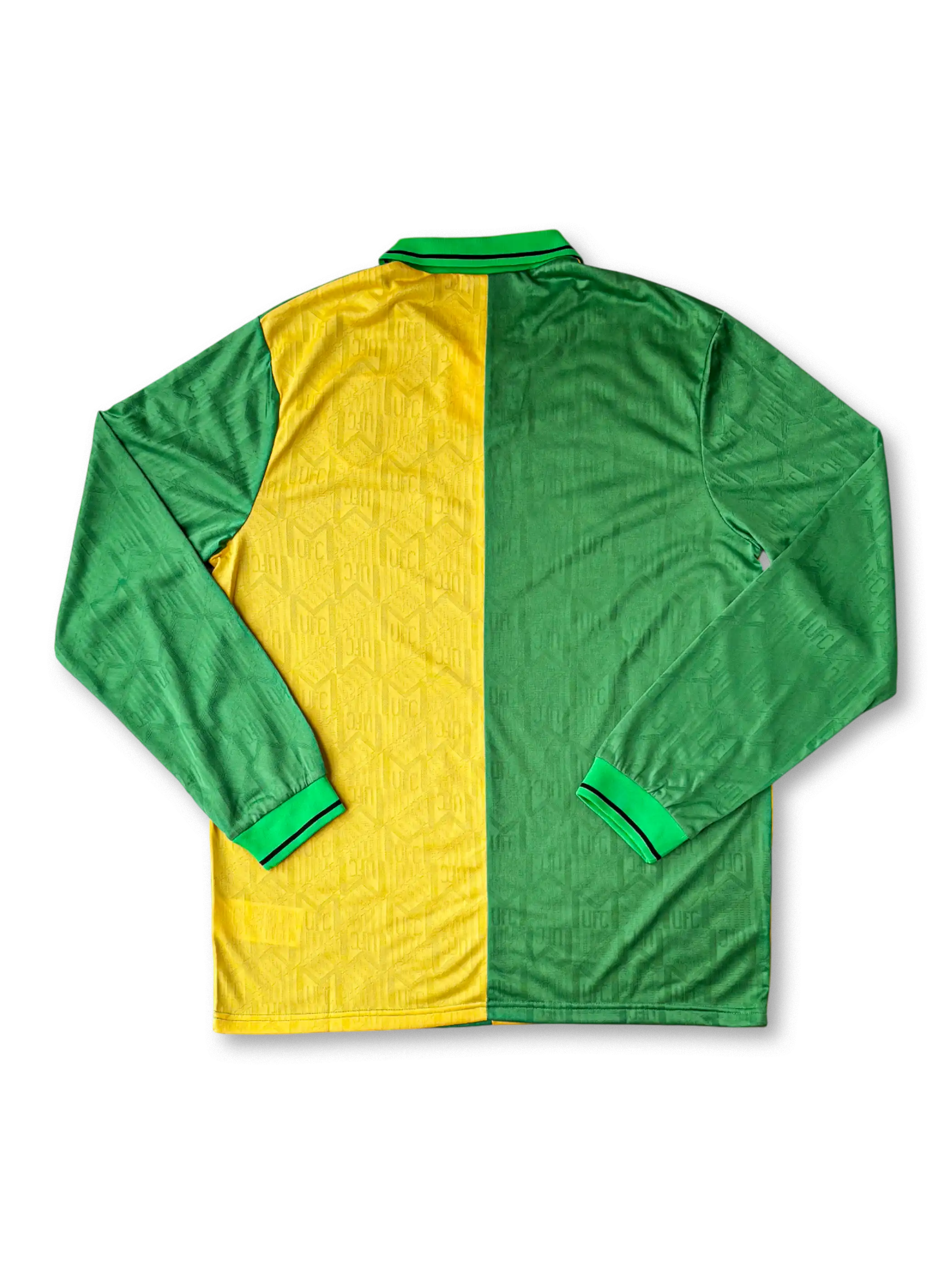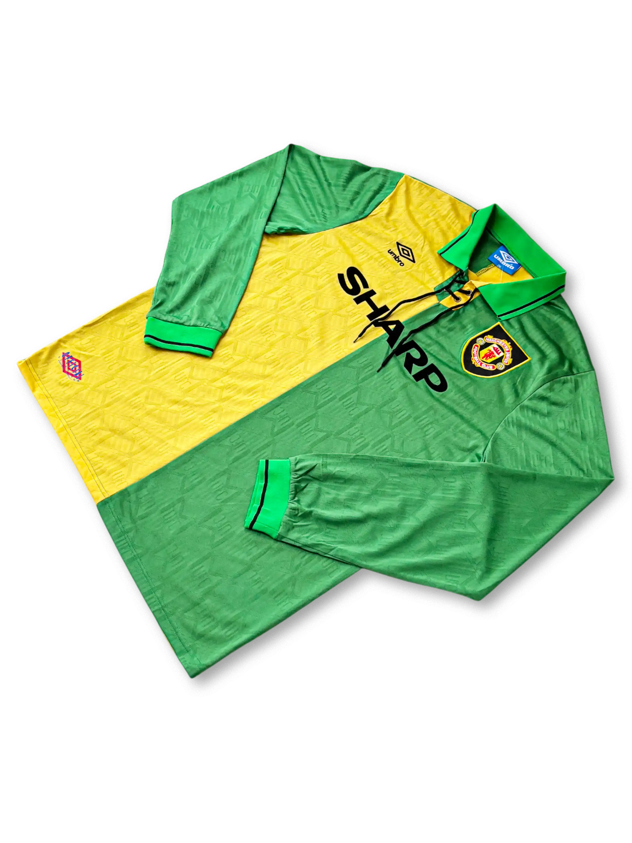 緑×黄のハーフ&ハーフ配色が象徴的な92-94アウェイモデル。プレミア創設期のユナイテッドを象徴する希少な一着。