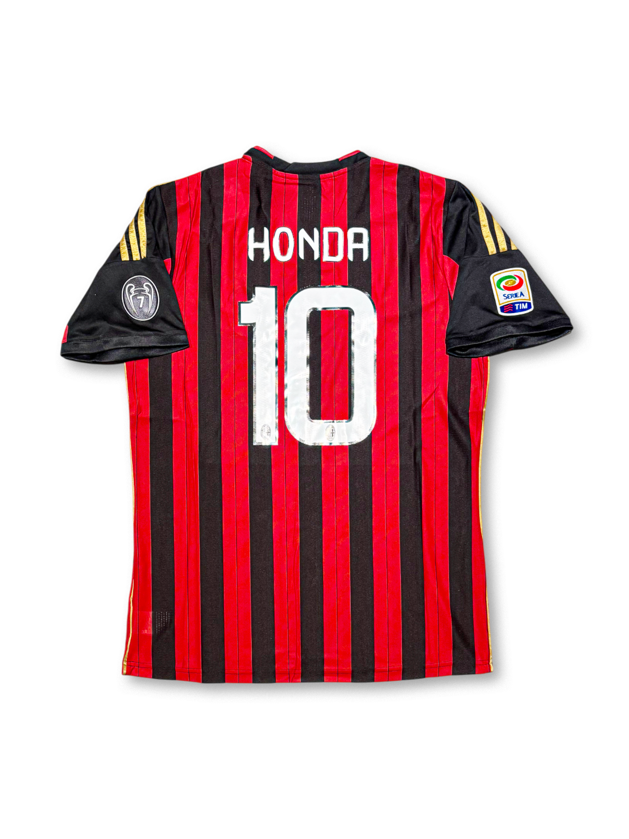 クラブ伝統のロッソネロ縦ストライプを基調に、肩へ配されたゴールドのスリーストライプがアクセントとなるデザインで、胸のスターとエンブレム刺繍が精緻に再現されている。背面には「HONDA 10」のマーキングが施され、袖にはSerie Aパッチが付属する象徴的な一着としてコレクション性も高い。
