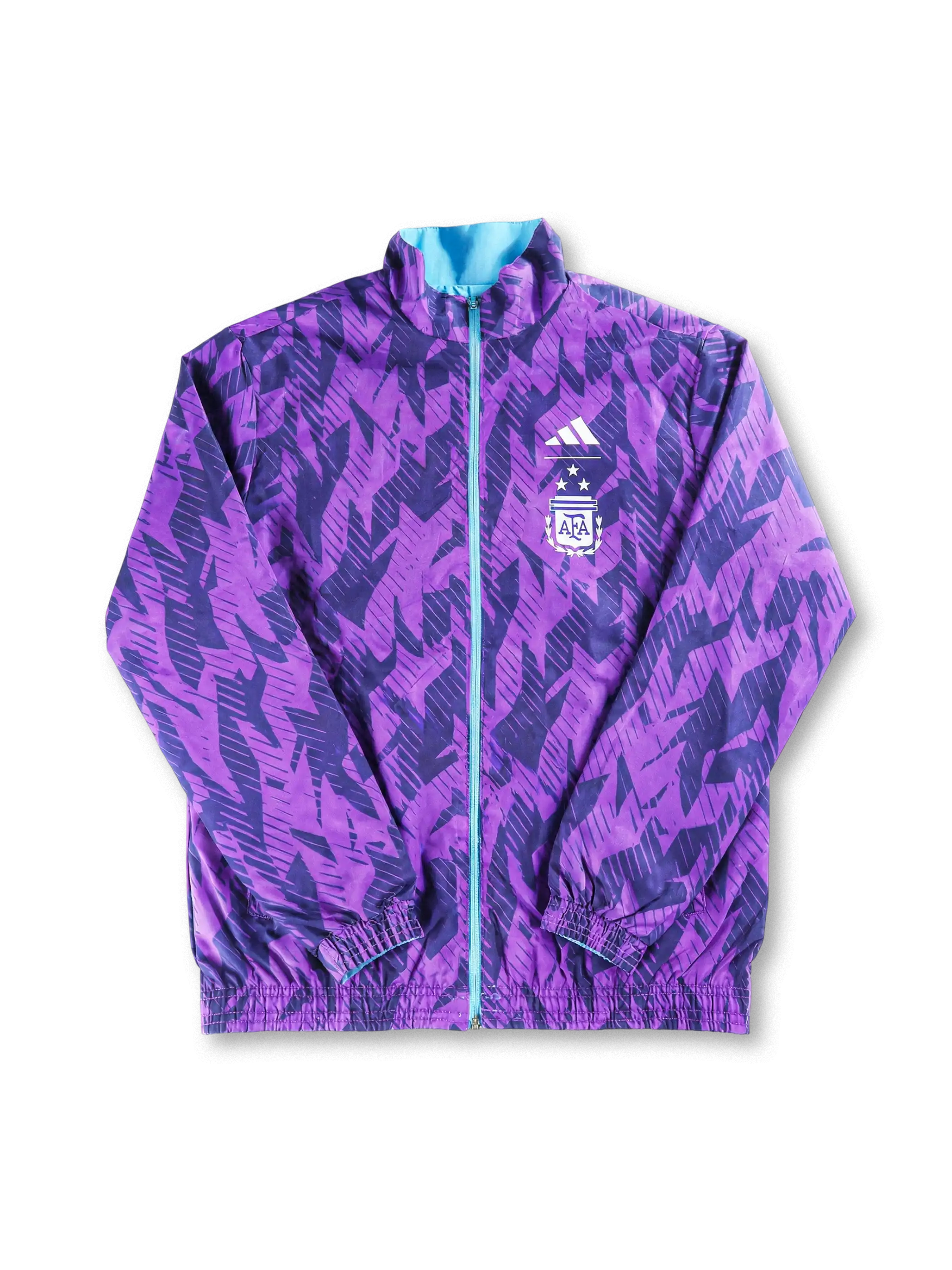 アルゼンチン代表の象徴色で仕上げたブルー面と、ダイナミックなパープルグラフィック面を備えた刺繍エンブレム仕様のリバーシブルウィンドブレーカー。