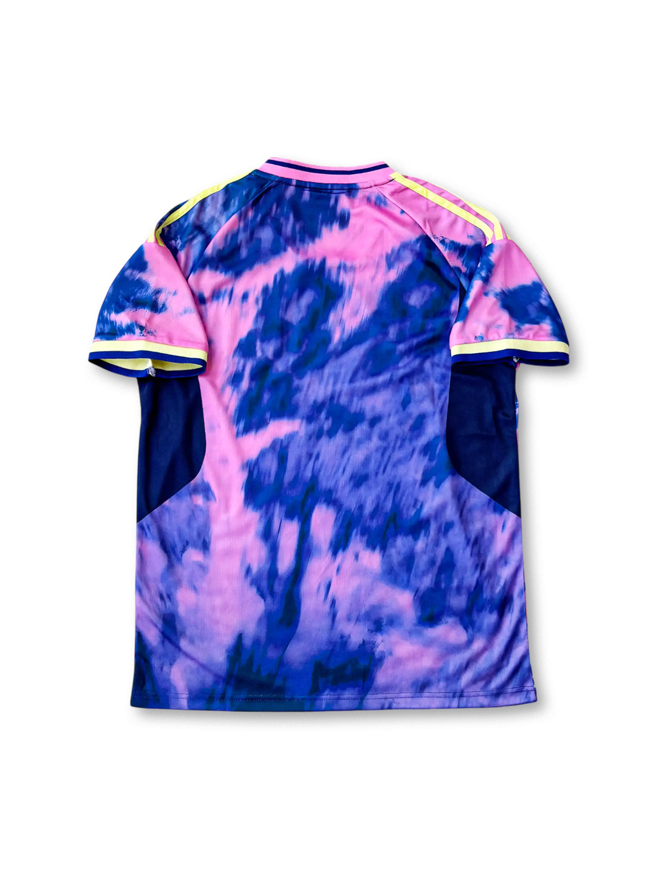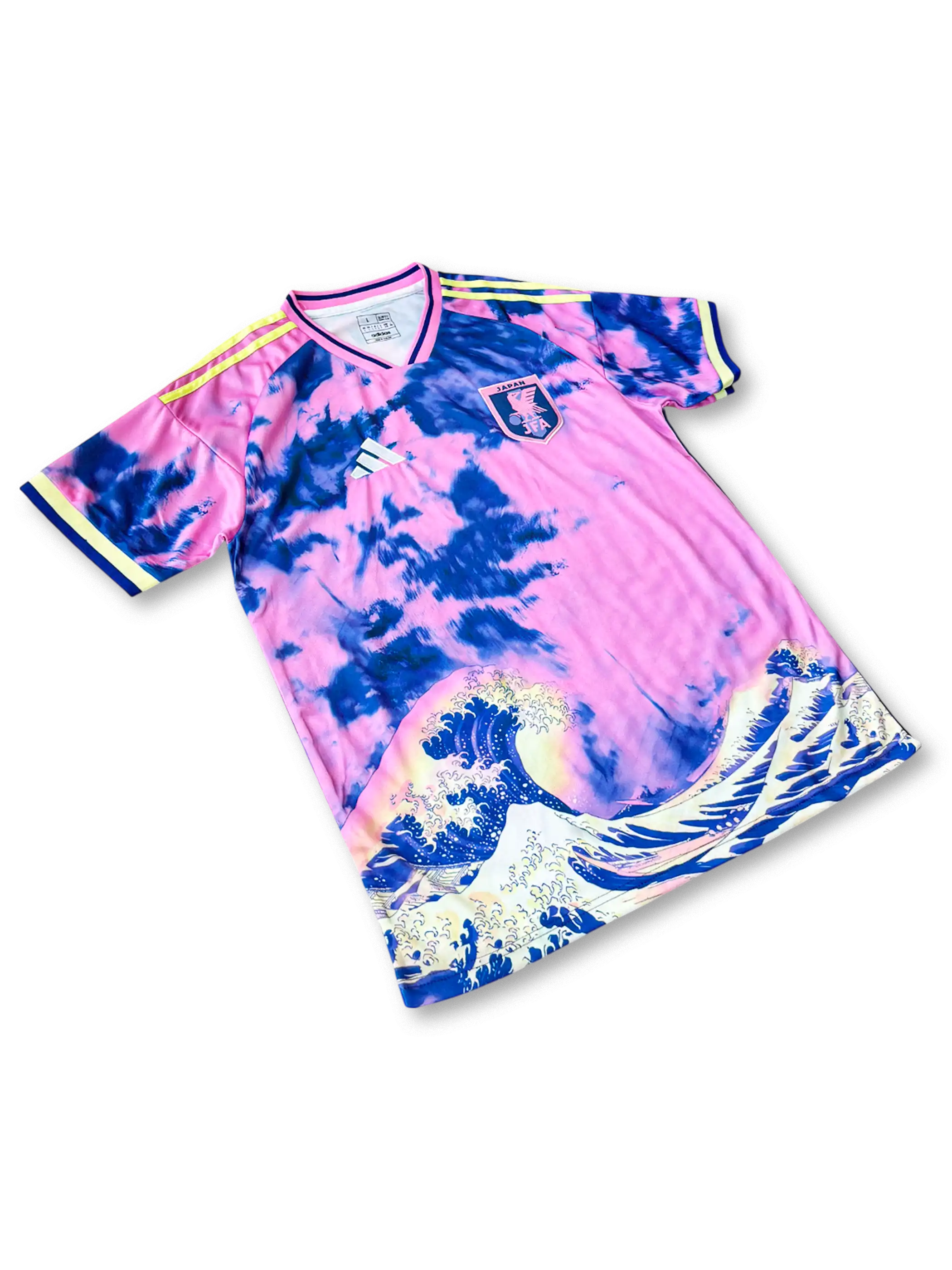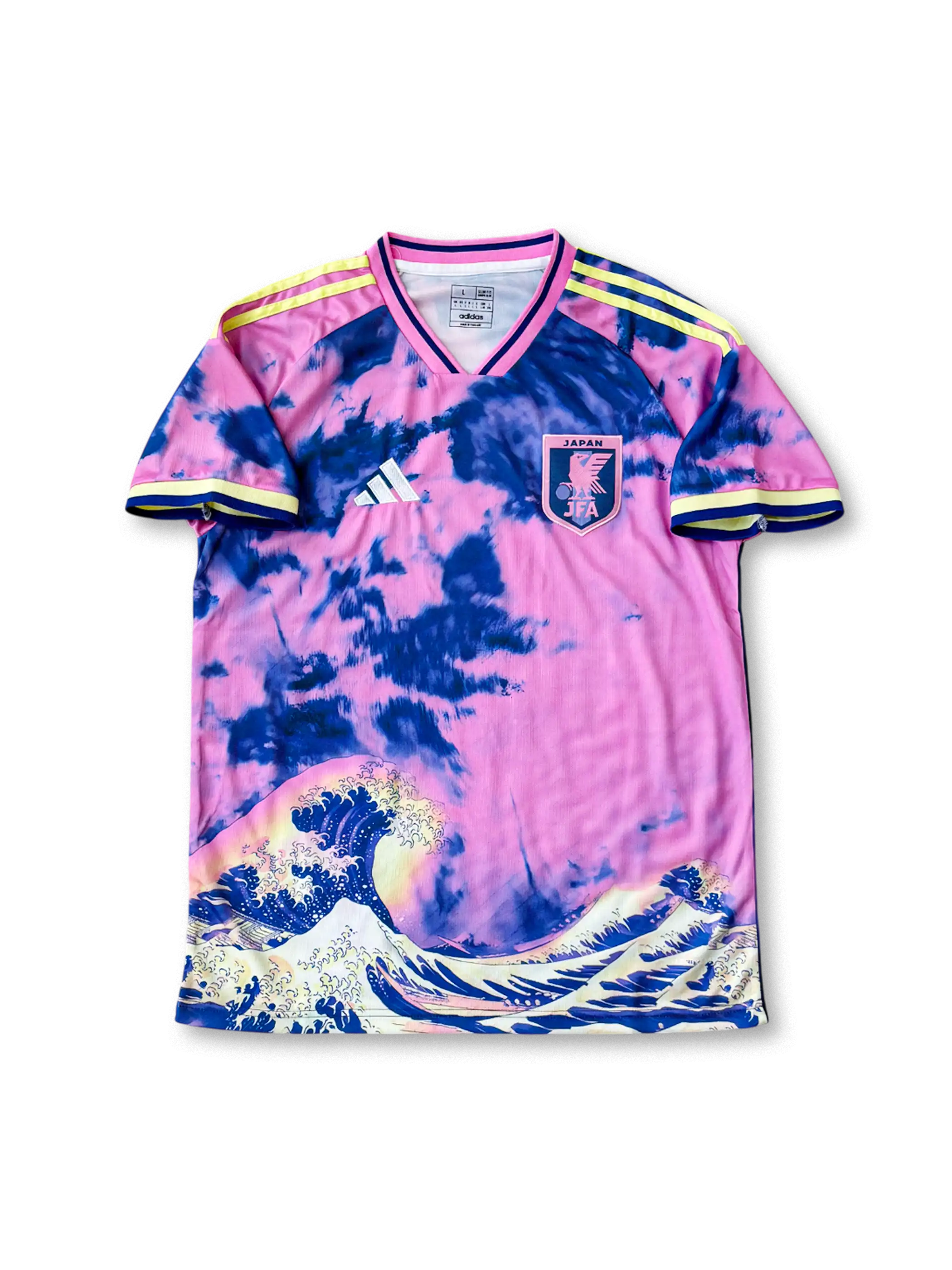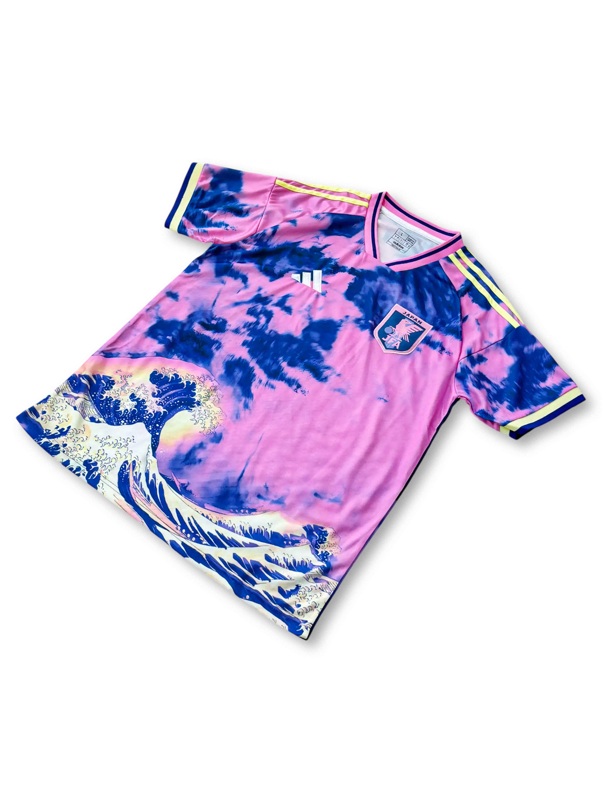 葛飾北斎の波をモチーフとしたグラフィックを再構築し、ピンクとネイビーのタイダイ染め調デザインと組み合わせたコンセプト仕様で、胸にはピンク基調にアレンジされた日本サッカー協会エンブレム、肩には蛍光イエローのスリーストライプスを配置。和の象徴と現代的な配色を融合した視覚的インパクトの高い特別モデル。