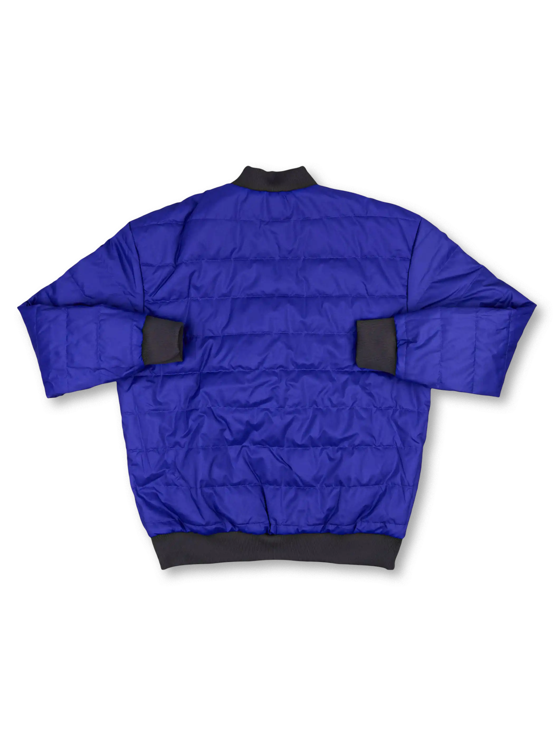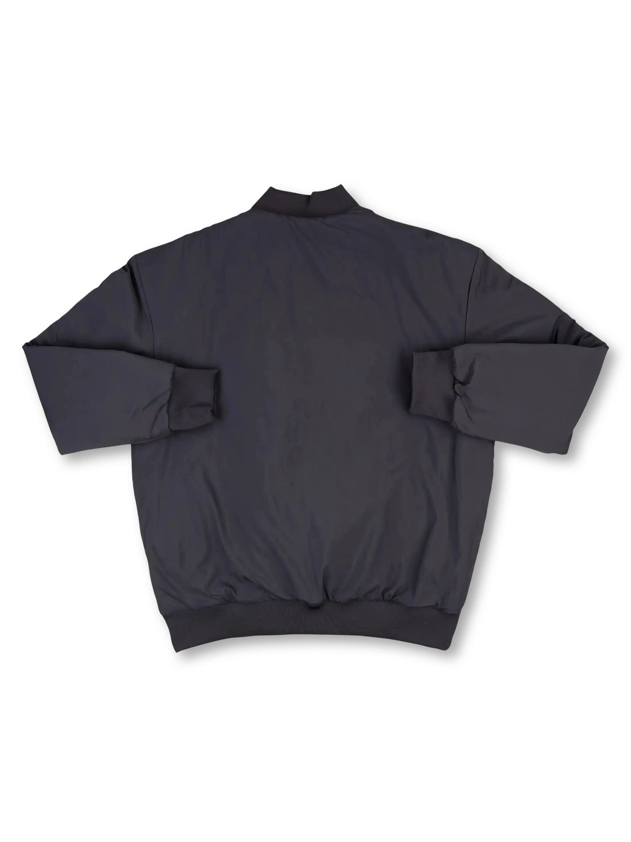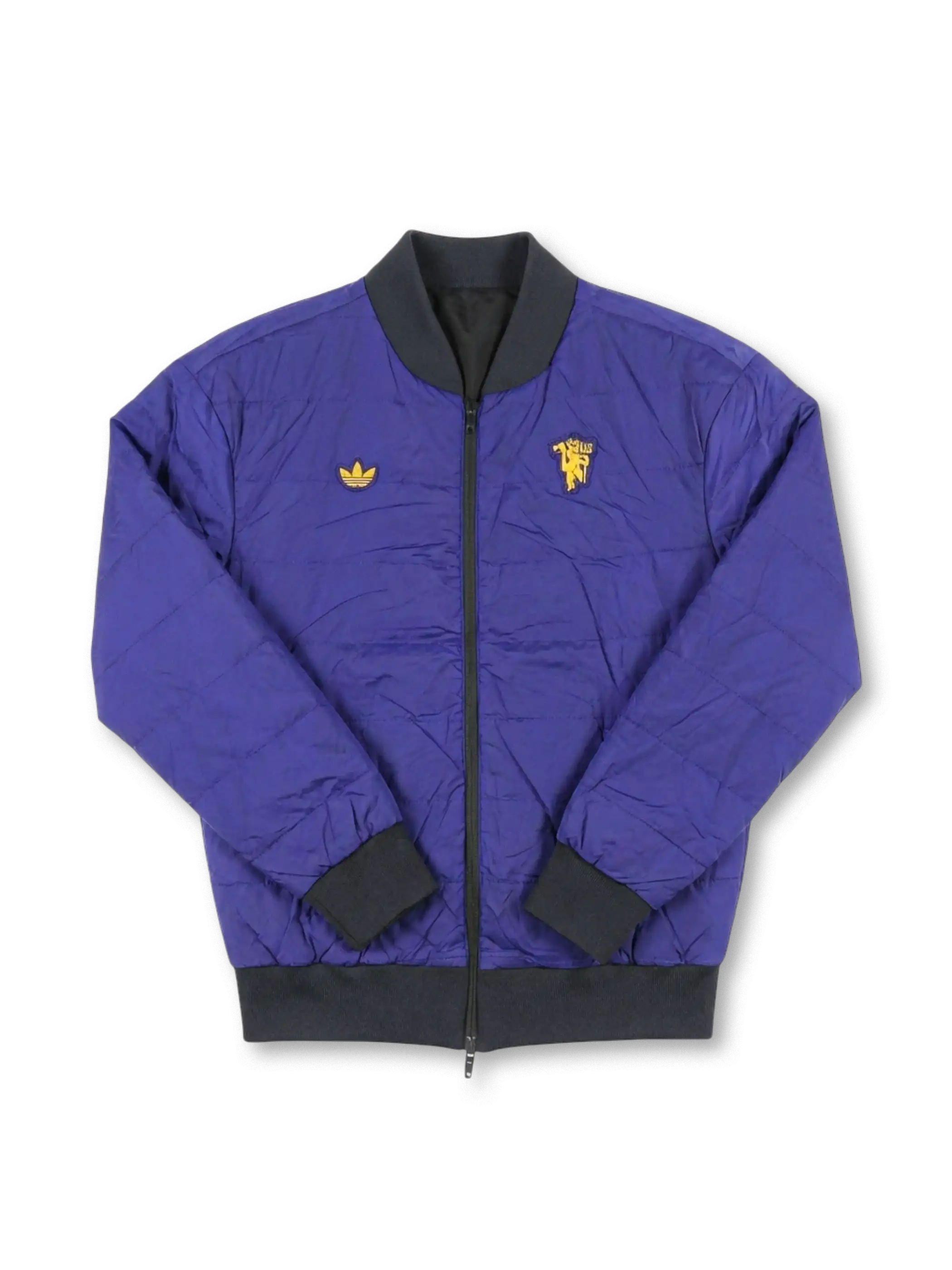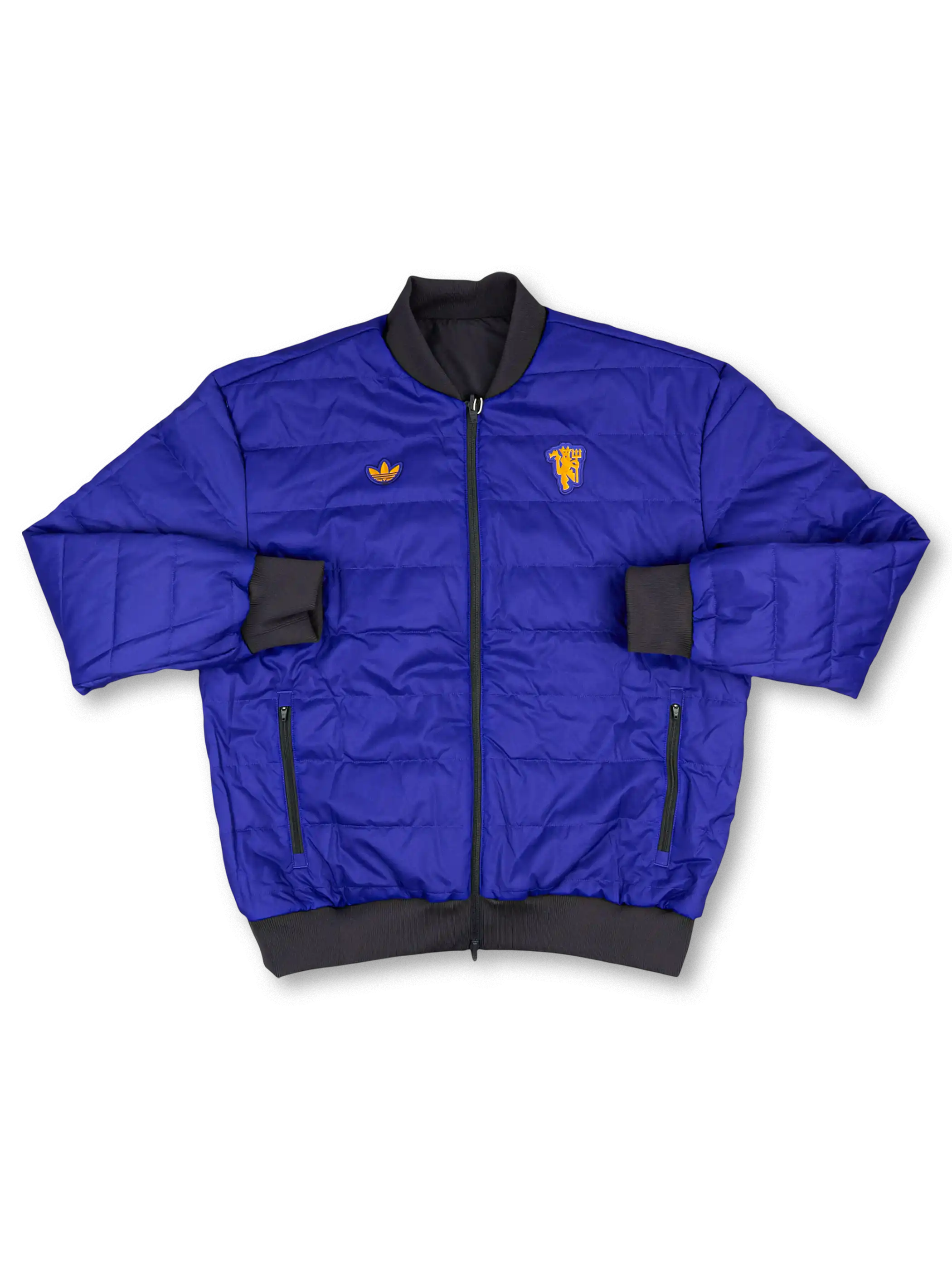 クラブクレストとトレフォイルロゴを同色刺繍でまとめたミニマルデザインが特徴で、表面はマットなブラック、裏面は鮮やかなブルーのキルティング構造を採用し、軽量中綿による保温性と都会的なシルエットを両立するリバーシブル仕様。ポケットにはジップを備え、アディダス オリジナルスのタグディティールが存在感を加える。