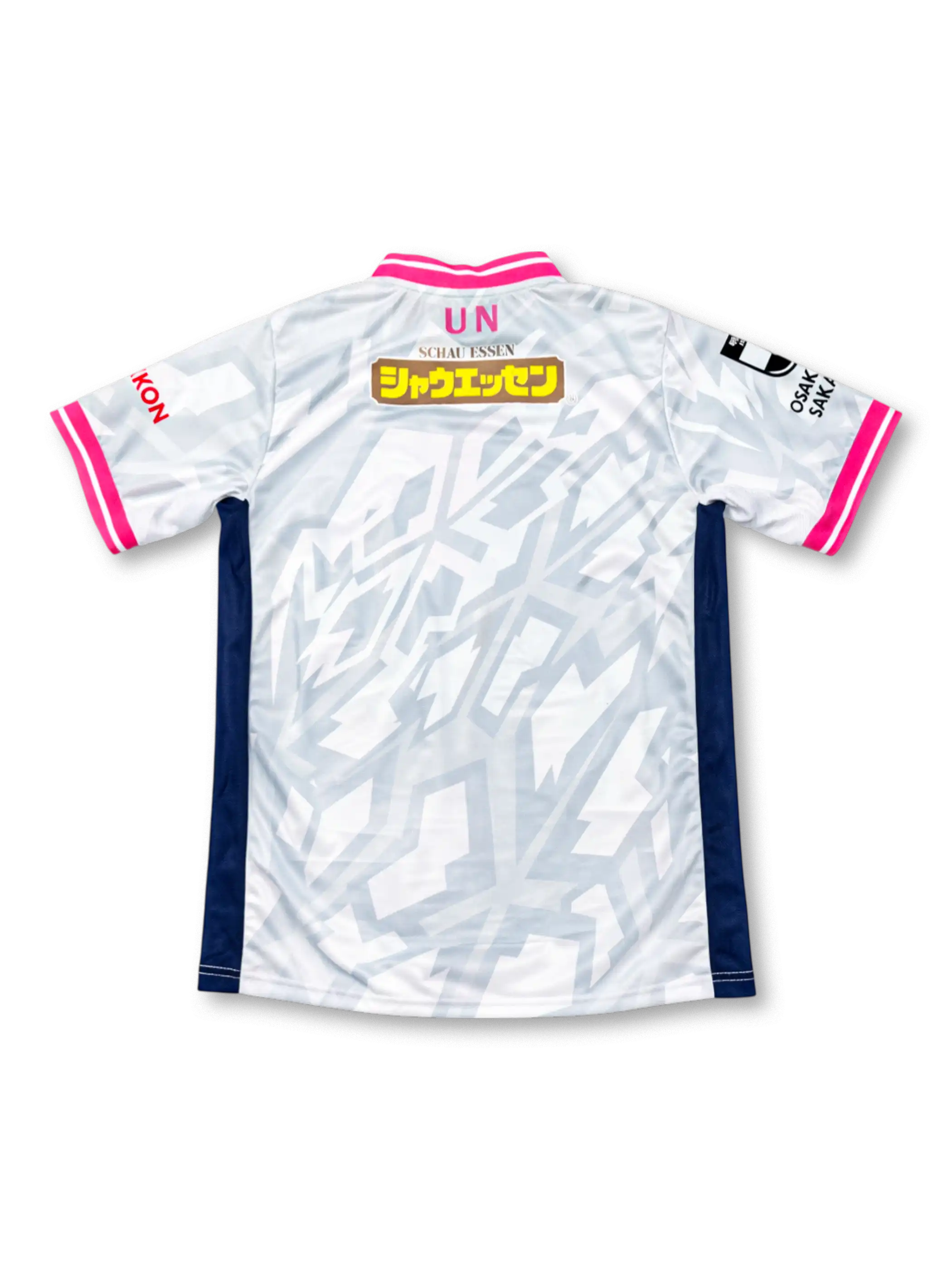 ホワイトベースに淡いブルーの幾何学パターンを全面配置し、中央部から裾にかけてピンクグラデーションで桜の花びらが舞い落ちる視覚効果を演出。メインスポンサーYANMARを赤で強調し、胸部にCAPCOM、左胸にヨドコウロゴ、背面にシャウエッセン・国連(UN)ロゴを配置。襟と袖口にピンクストライプ、サイドパネルにネイビーを採用したMizuno製高機能素材モデル。
