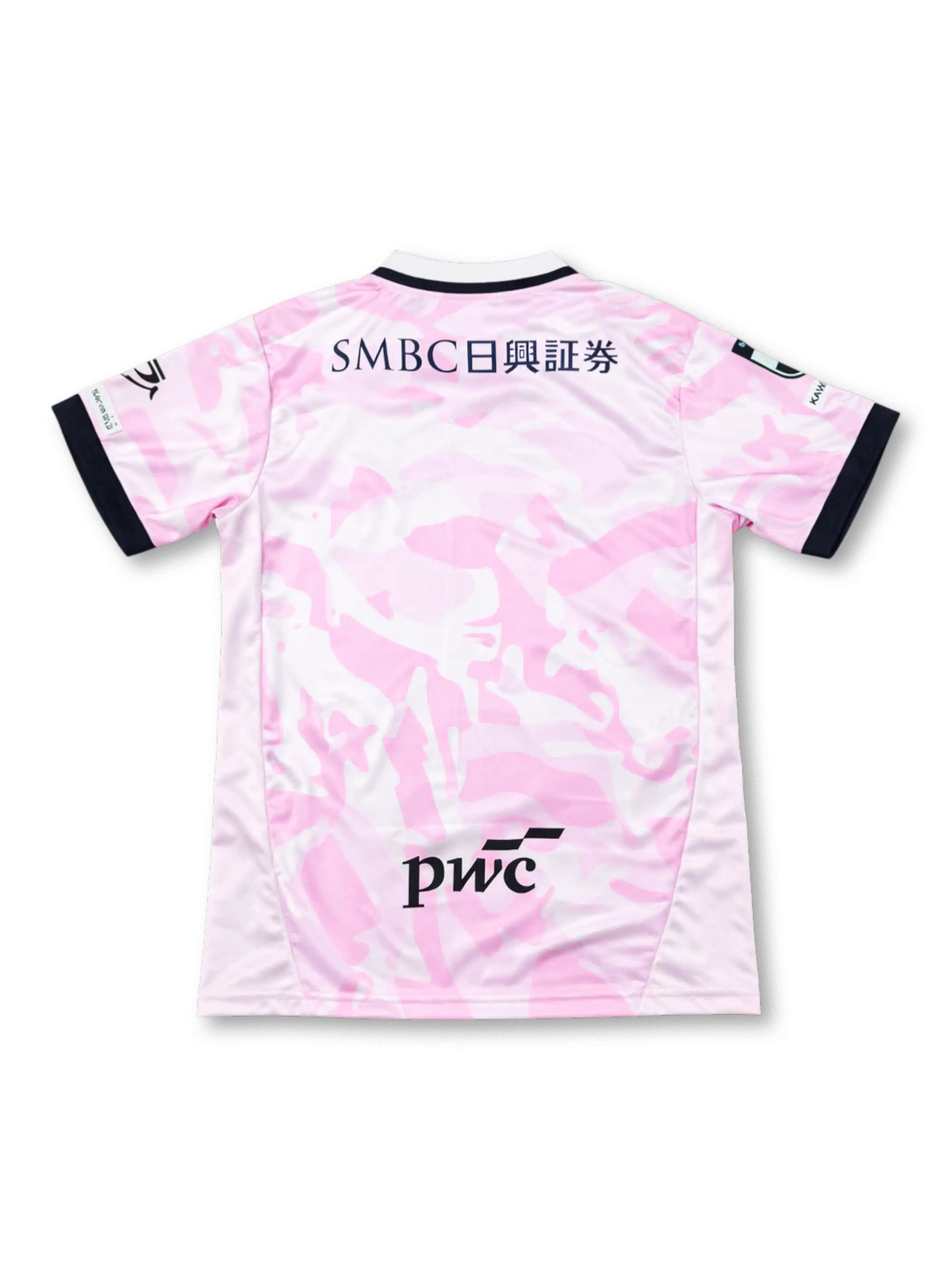 ホワイトベースにライトピンクの抽象的マーブルパターンを全面配置し、桜をモチーフとした迷彩風デザインを採用。メインスポンサーFUJITSU(富士通)を中央に配し、胸部にANKER・RENOSY、背面にSMBC日興証券・PwC、袖にCityロゴを配置した多層スポンサー構成。ネイビーの襟と袖口でアクセントを加え、PUMA製の高機能素材を使用した企業連携型デザインモデル。