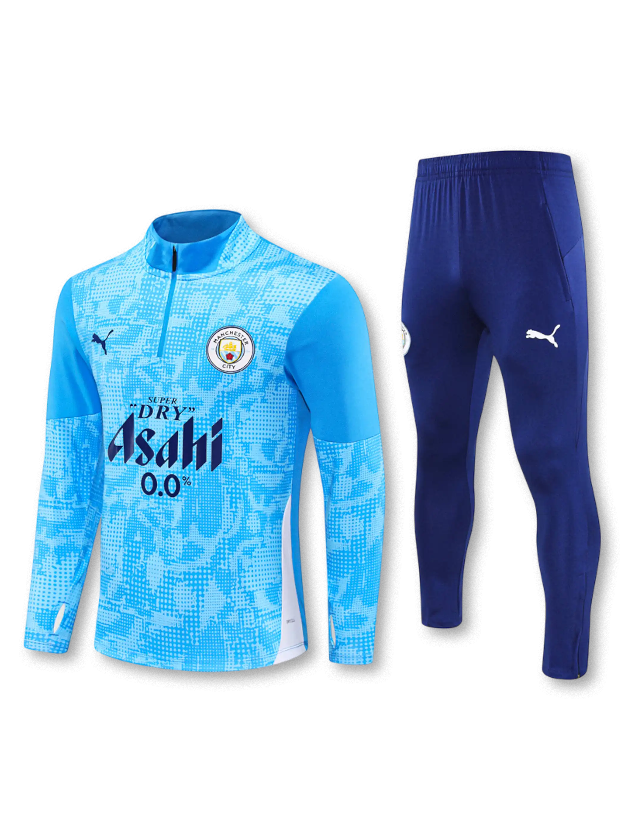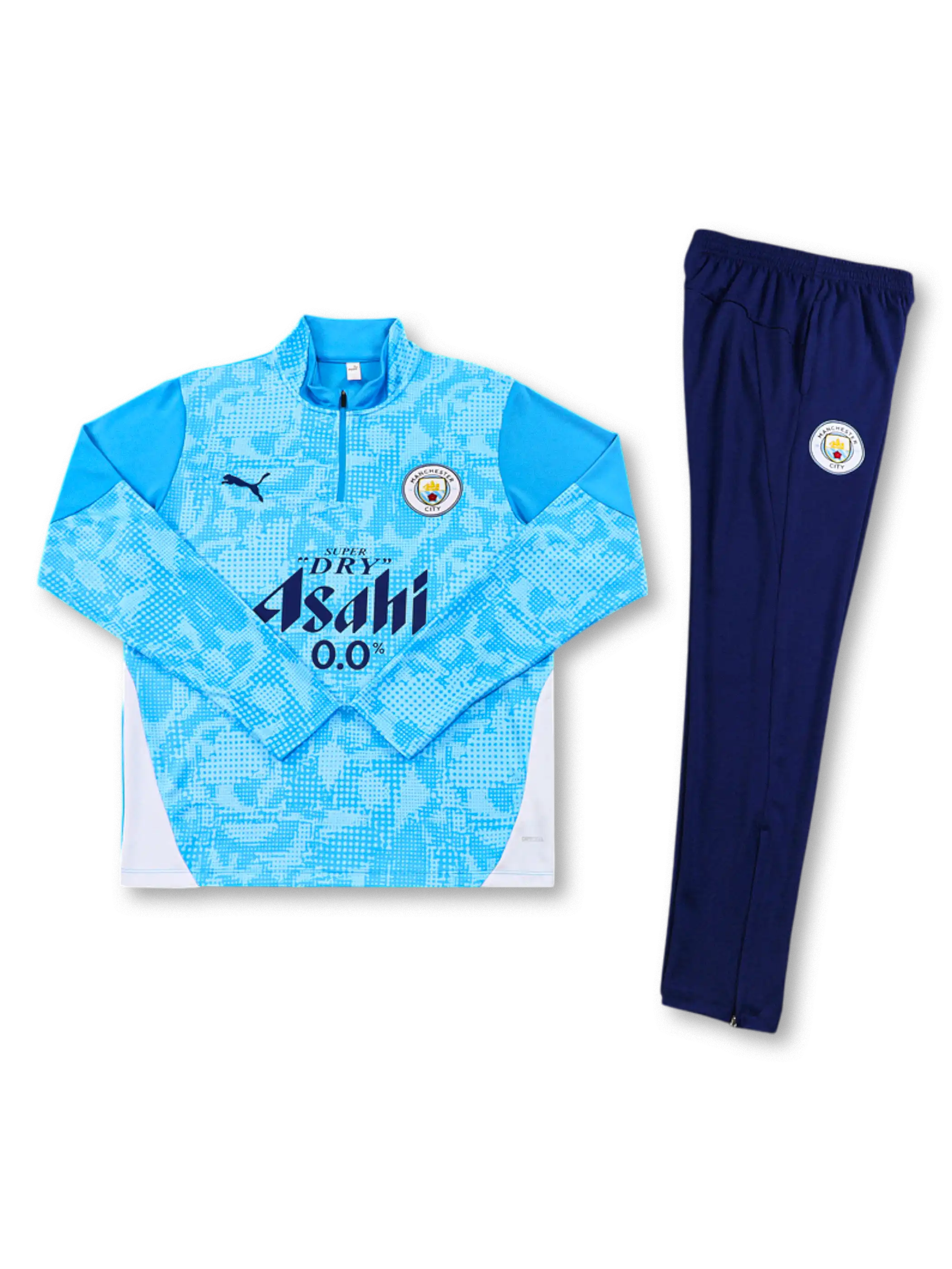 デジタル調パターンを採用した2026年マンチェスター・シティ選手仕様トレーニングスーツ。AsahiスポンサーとPUMA設計を組み合わせた機能モデル。