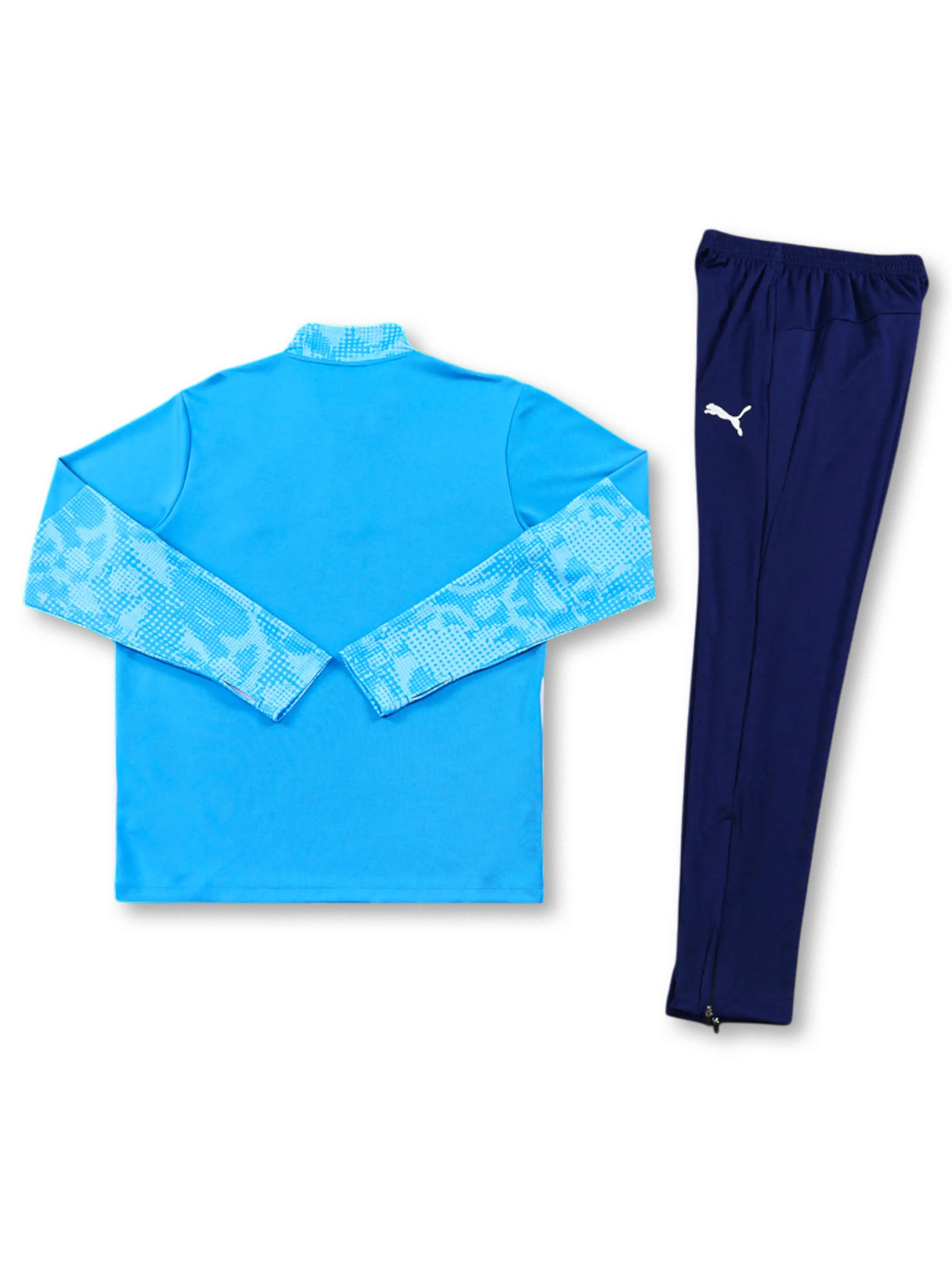 鮮やかなデジタルブルーの総柄パターンが特徴で、胸のAsahi「SUPER DRY 0.0%」ロゴとPUMAロゴをネイビーで統一し視認性を高めている。肩と脇下に切り替えたブルーのパネル構造が可動域を補助し、選手仕様の軽量ストレッチファブリックはトレーニング時の俊敏な動作に適応する実戦向け設計となっている。