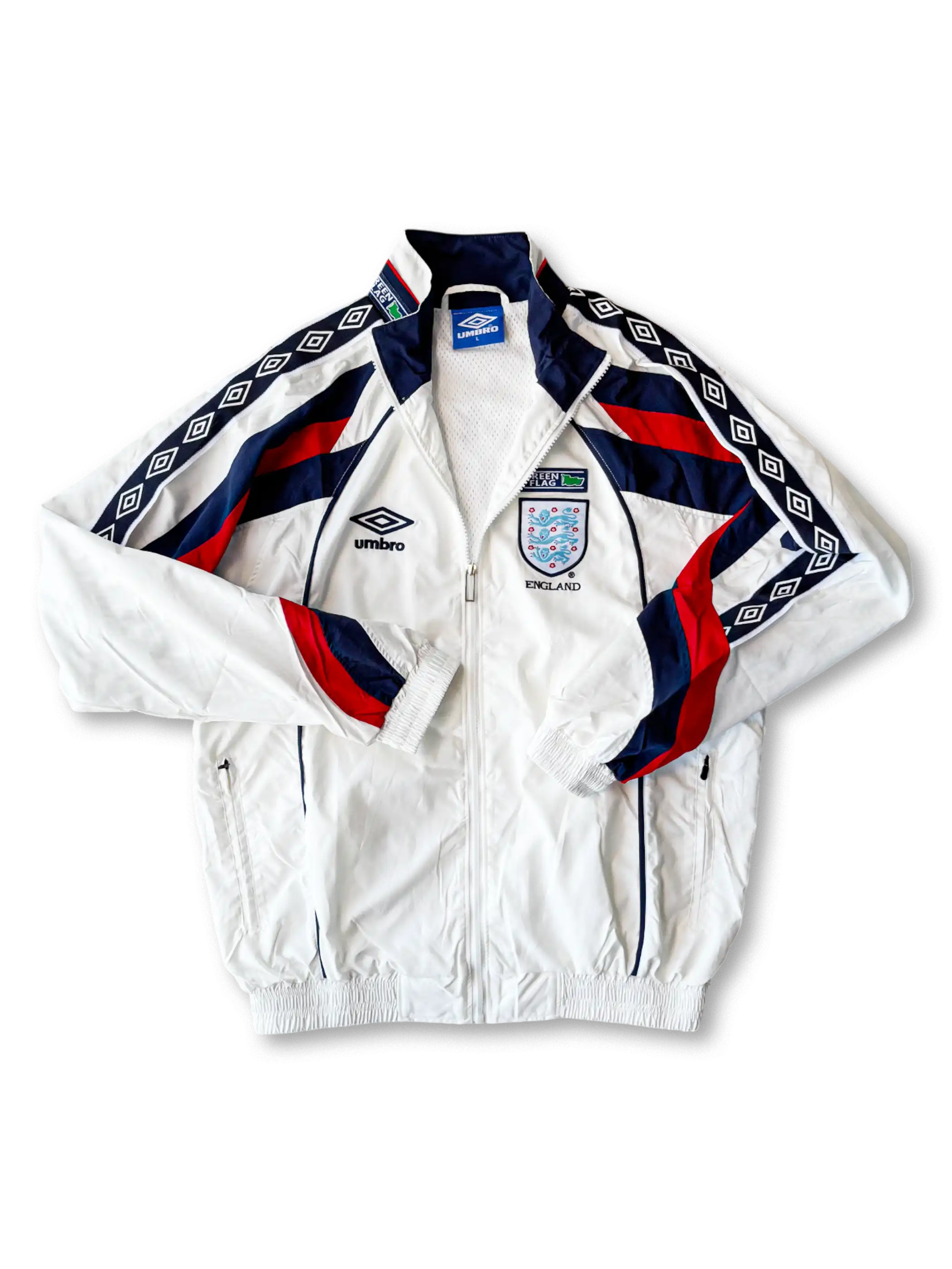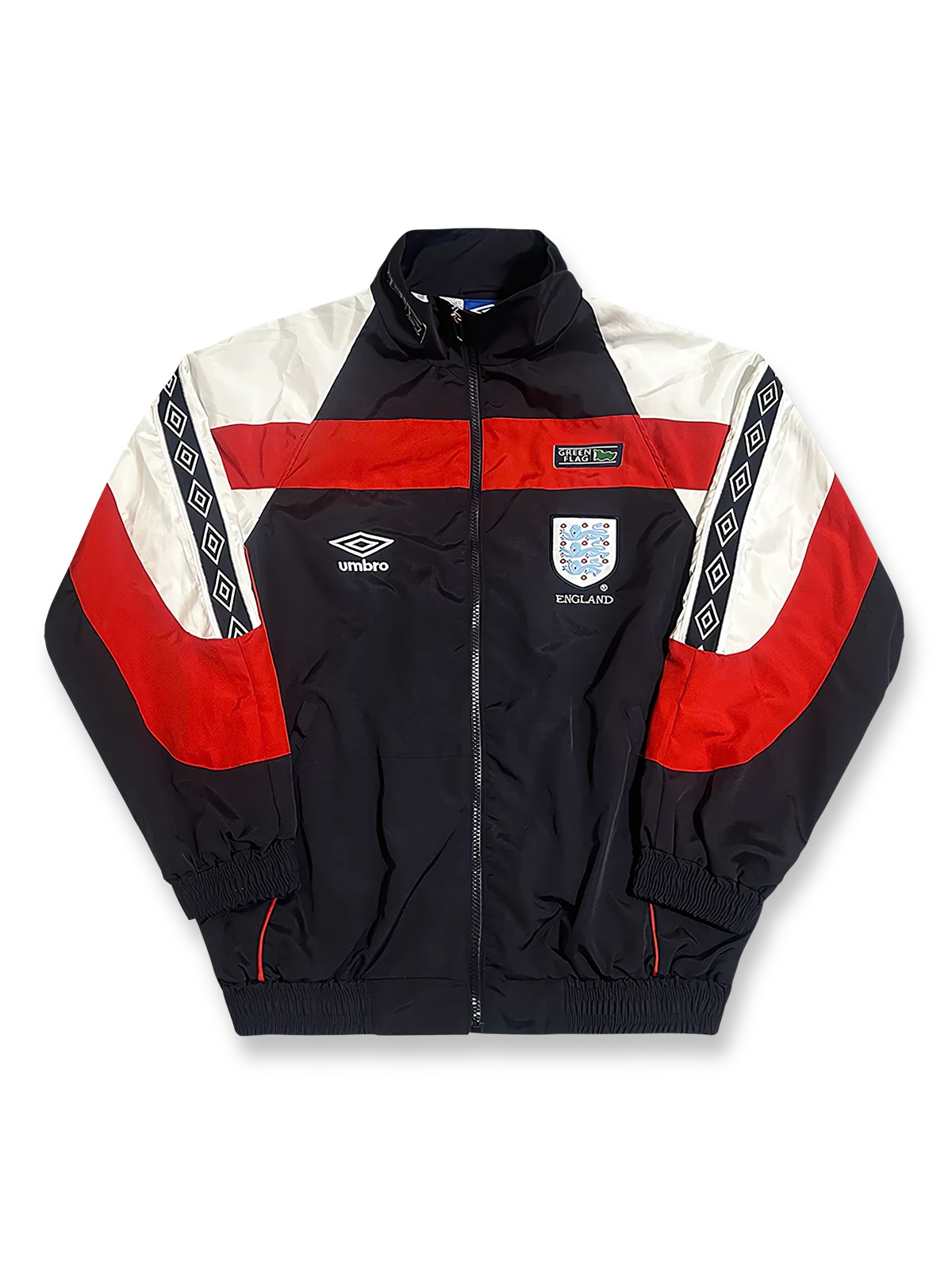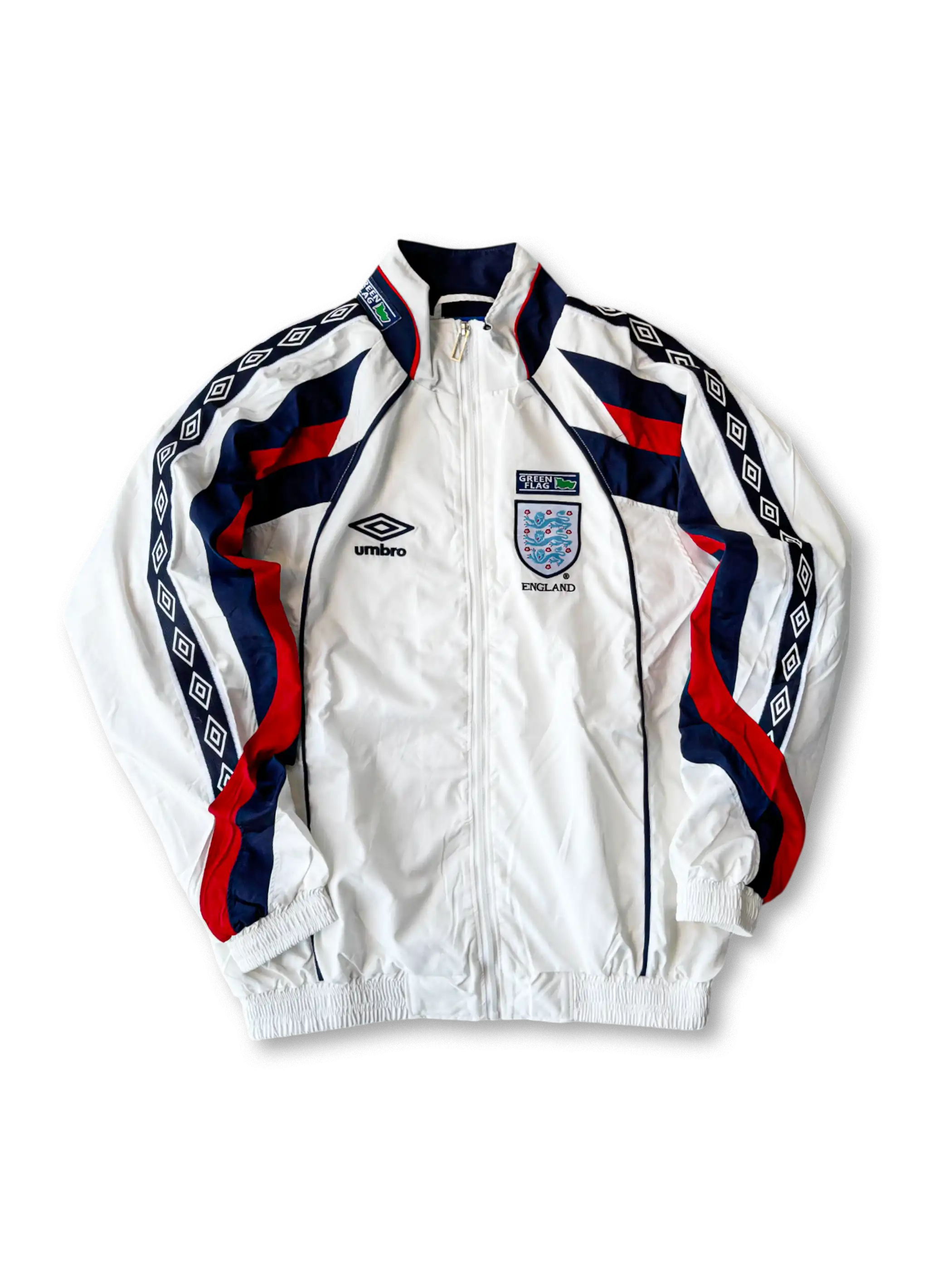 このトレーニングウェアは、イングランド代表の象徴的なホワイトを基調としたベースに、レッドとブルーの細部デザインを採用しています。胸元には高品質刺繍で精密に施されたイングランド代表エンブレムとUmbroロゴが配置され、クラブの歴史と栄光を強調します。袖部にはUmbroの象徴であるダイヤモンドパターンがデザインされており、クラシックとモダンが融合したスタイルを演出します。ウェアは軽量防風素材を採用し、スポーツ中の快適性と通気性を確保します。フルジップ仕様を採用することで、着脱が容易となり利便性を向上させます。日常使いやコレクションとしても最適であり、イングランドサッカー文化を象徴しつつレトロなトレンドを反映した一着です。