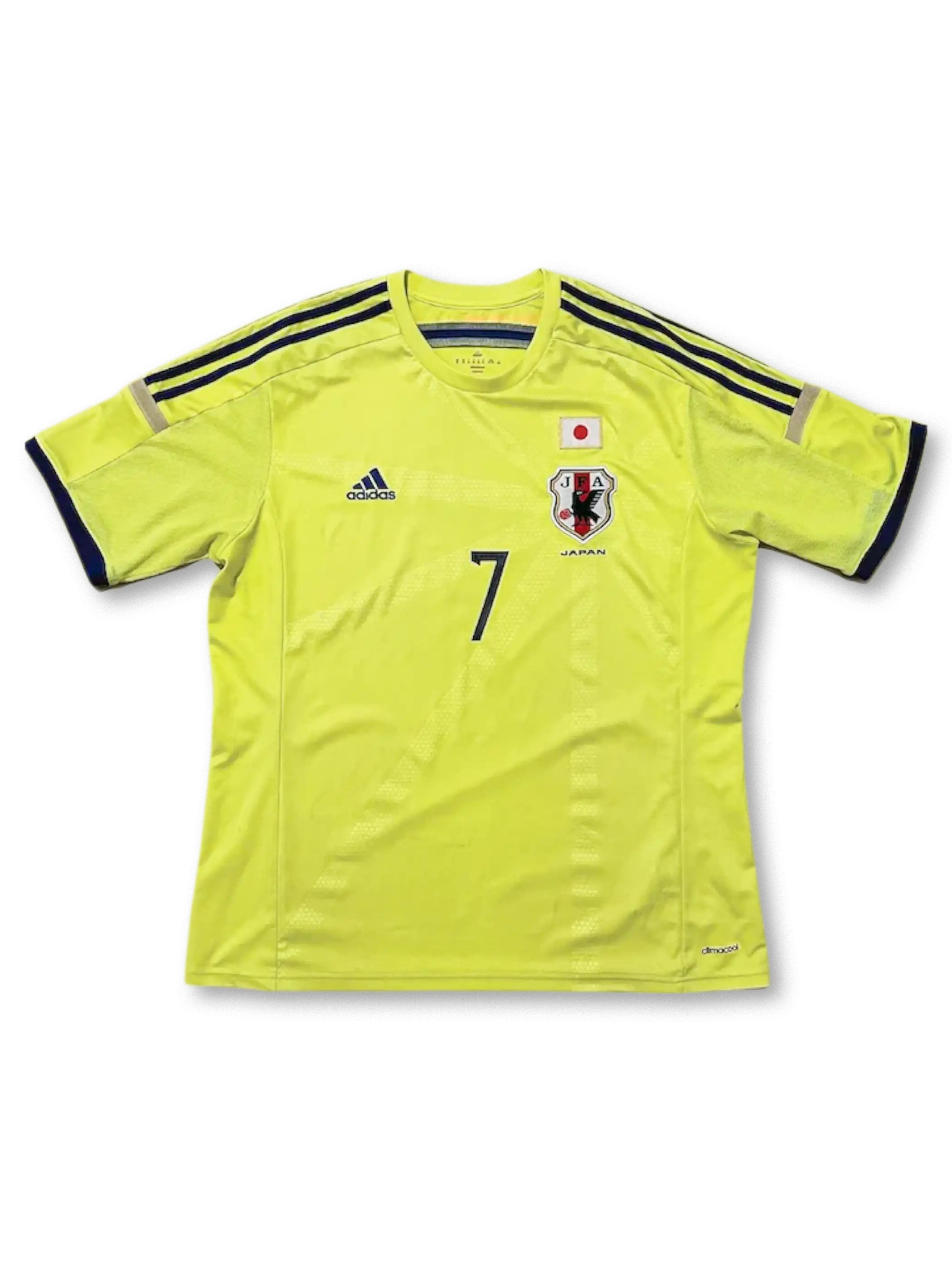 この2014–2015日本代表アウェイプレイヤーイシュージャージは、ほのかな蛍光イエローベースに、肩と胸に配されたグラフィックなレッド&ネイビーブルーのブラシストロークパターンが印象的。折り襟のポロカラーがクラシカルな雰囲気を演出し、袖口と裾は同色リブでシャープに仕上げられています。サイドと脇下のクライマクールメッシュパネルが通気性を強化し、ピッチ上での快適さを確保。遠藤のネームと7番ナンバーはダークネイビーでプリントされ、公式マッチクオリティを裏付ける“Japan Football Unites”エンブレムが裾に施されています。