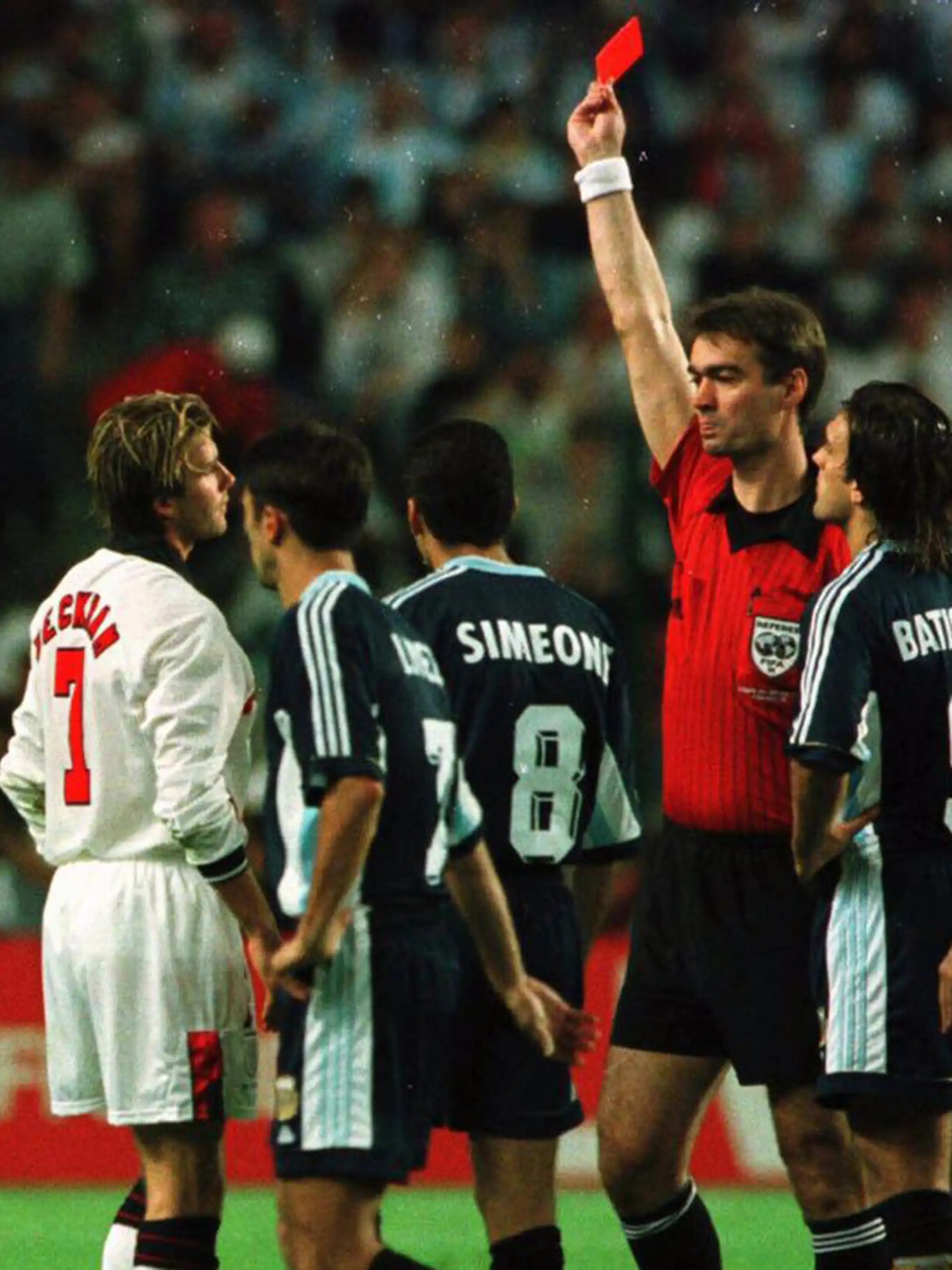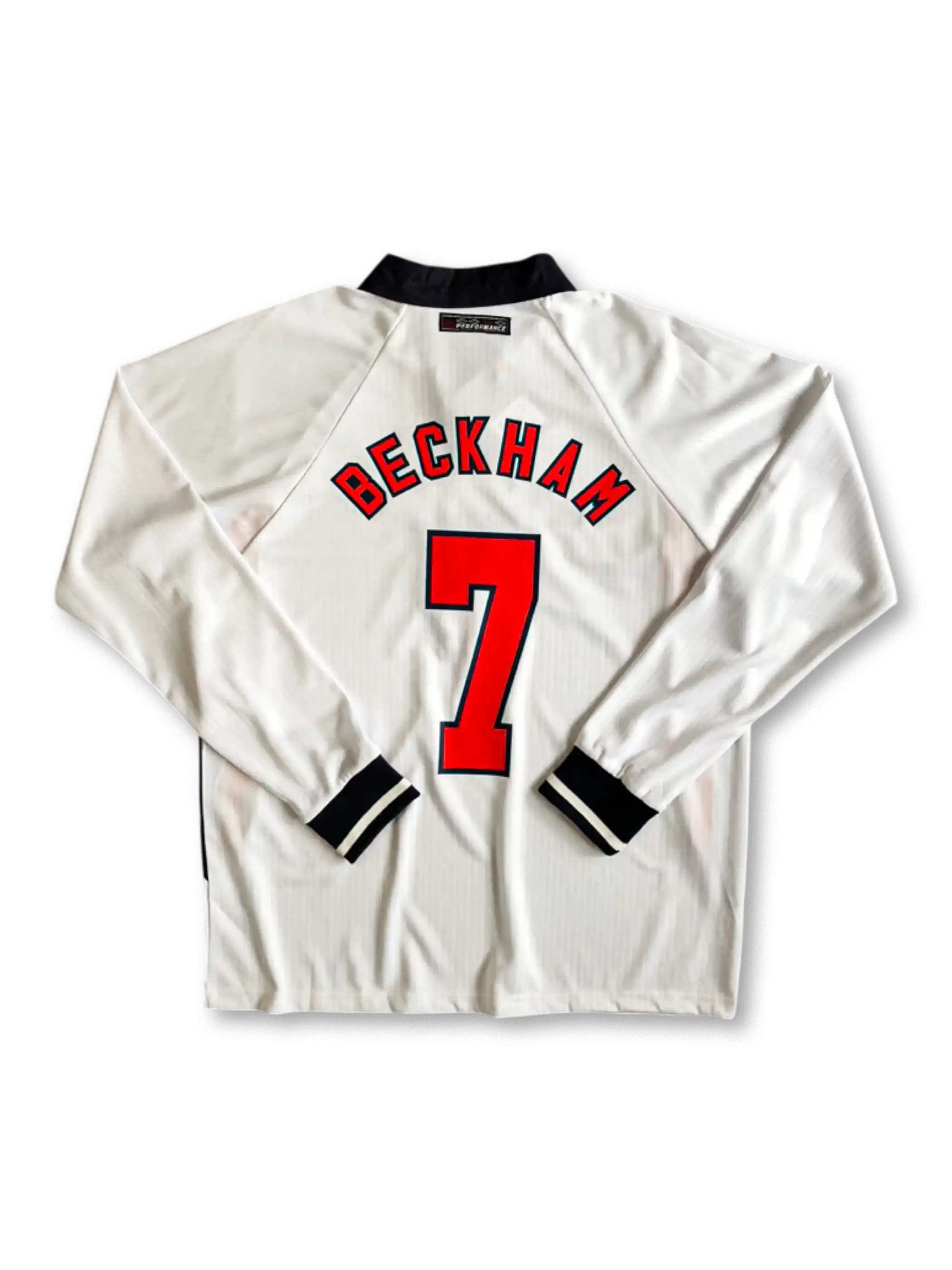 フランスW杯1998、アルゼンチン戦での退場劇と共に記憶されるベッカムの象徴的なイングランド代表ホームユニフォーム。