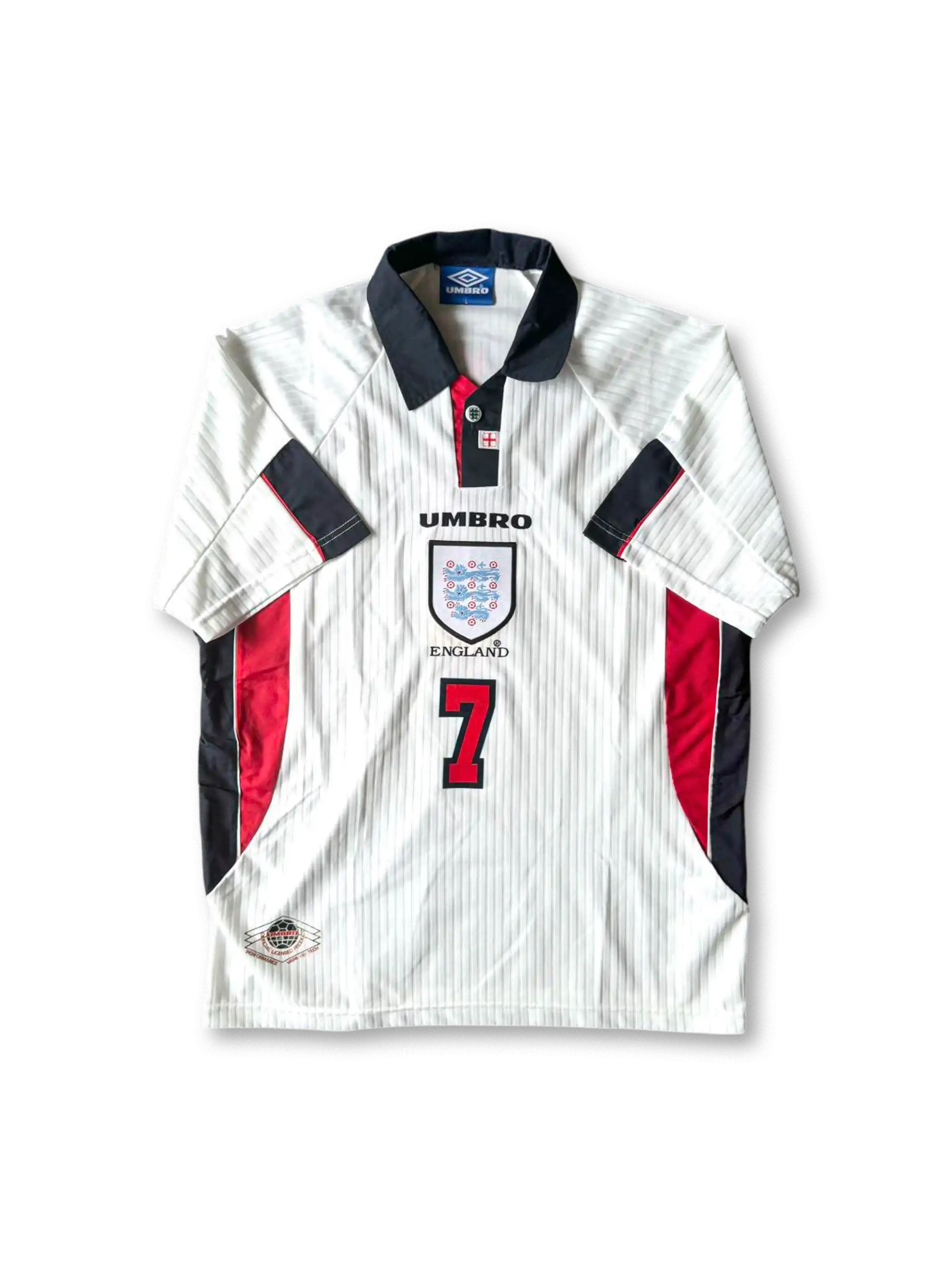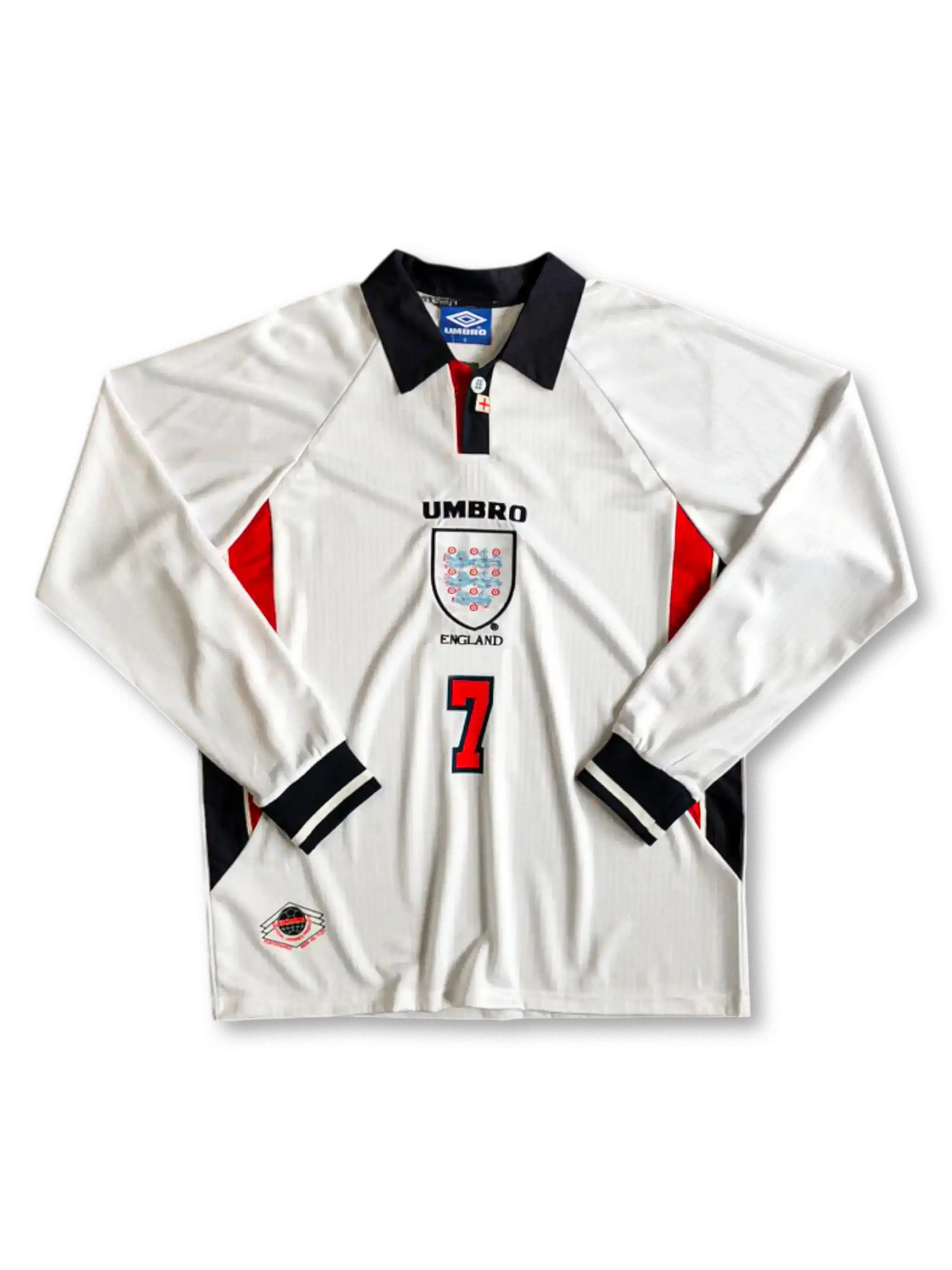 UMBRO製、ホワイトを基調にネイビーとレッドをアクセントにしたクラシカルなデザイン。胸には伝統のスリーライオンズエンブレムが刺繍され、背番号「7」とネーム「BECKHAM」がマーキングされた公式仕様。軽量かつ速乾性のある素材を採用し、実用性とコレクション価値を兼備。ベッカムのキャリア初期を象徴するアイコニックなモデル。