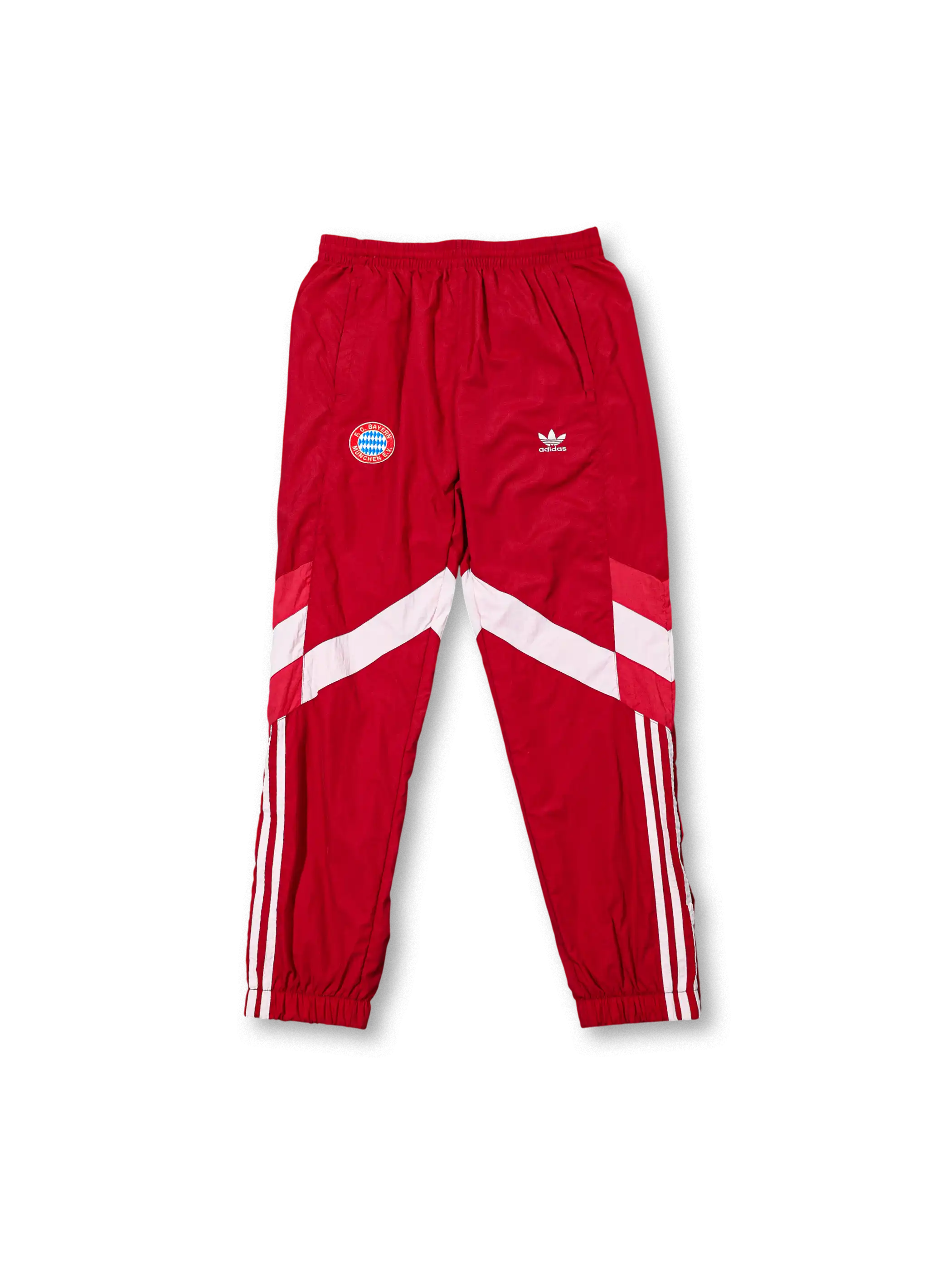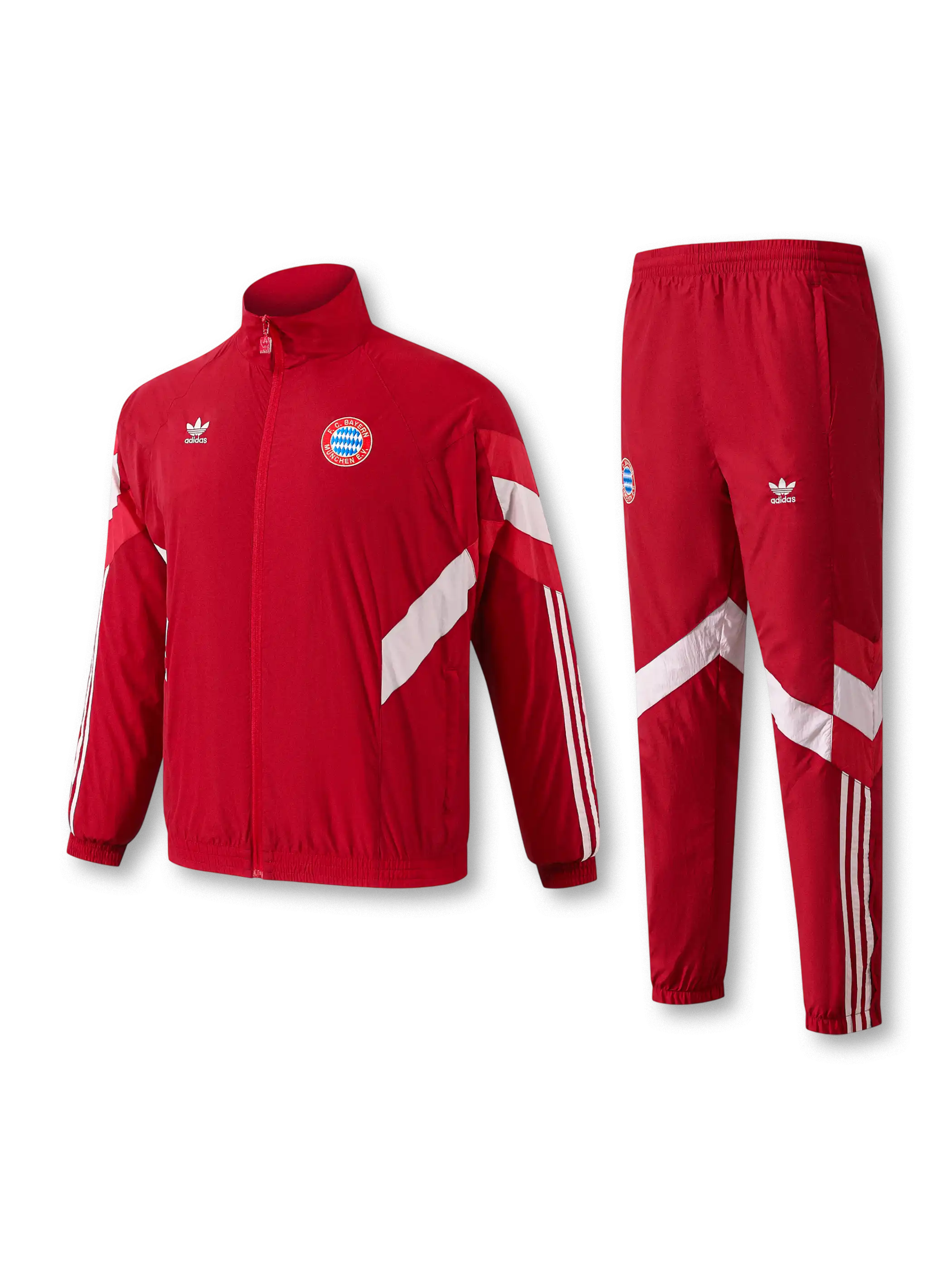 鮮烈なレッドにホワイトの斜め切替を組み合わせた90年代風デザインで、三葉草ロゴとクラブ章がクラシックな存在感を強める。軽量のポリエステル系素材が快適な着用感を実現し、袖と脚の3ストライプがスポーティーな印象を演出。トラックトップとパンツのシルエットは日常使いにも適した汎用性の高い構成となっている。