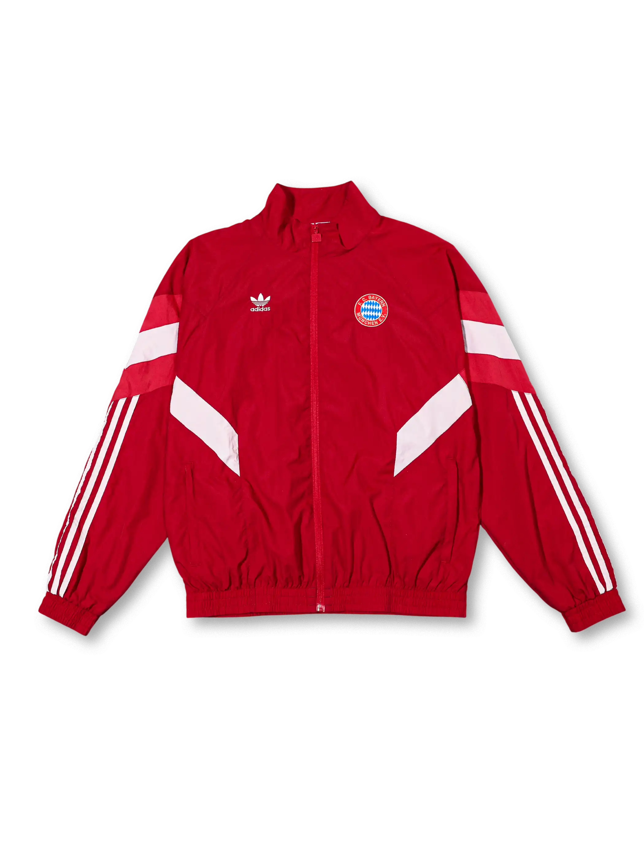 クラブ伝統のレッドとホワイトを基調に、三葉草ロゴと胸章を配した90年代風バイエルン・ミュンヘンのレトロジャージセット。