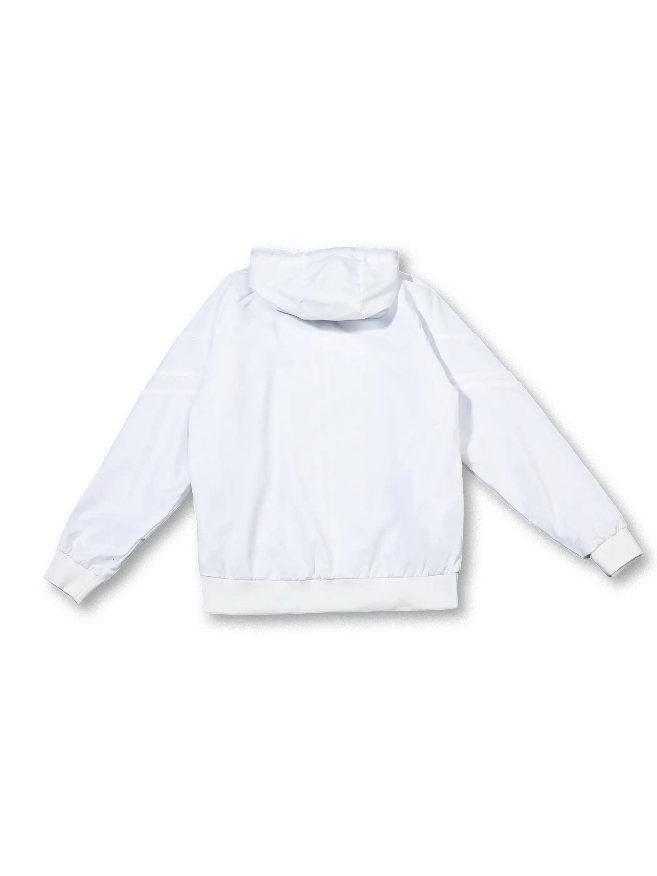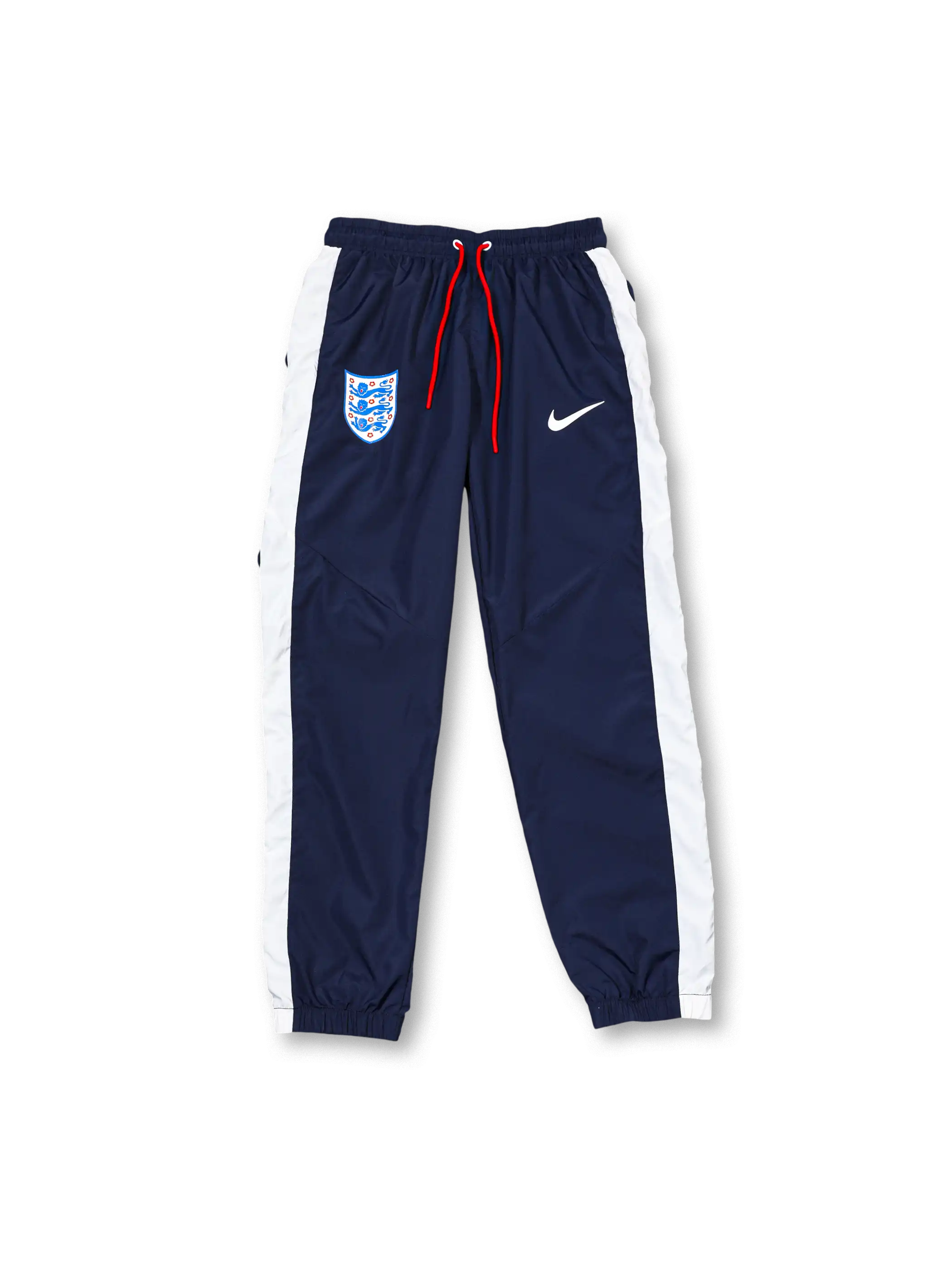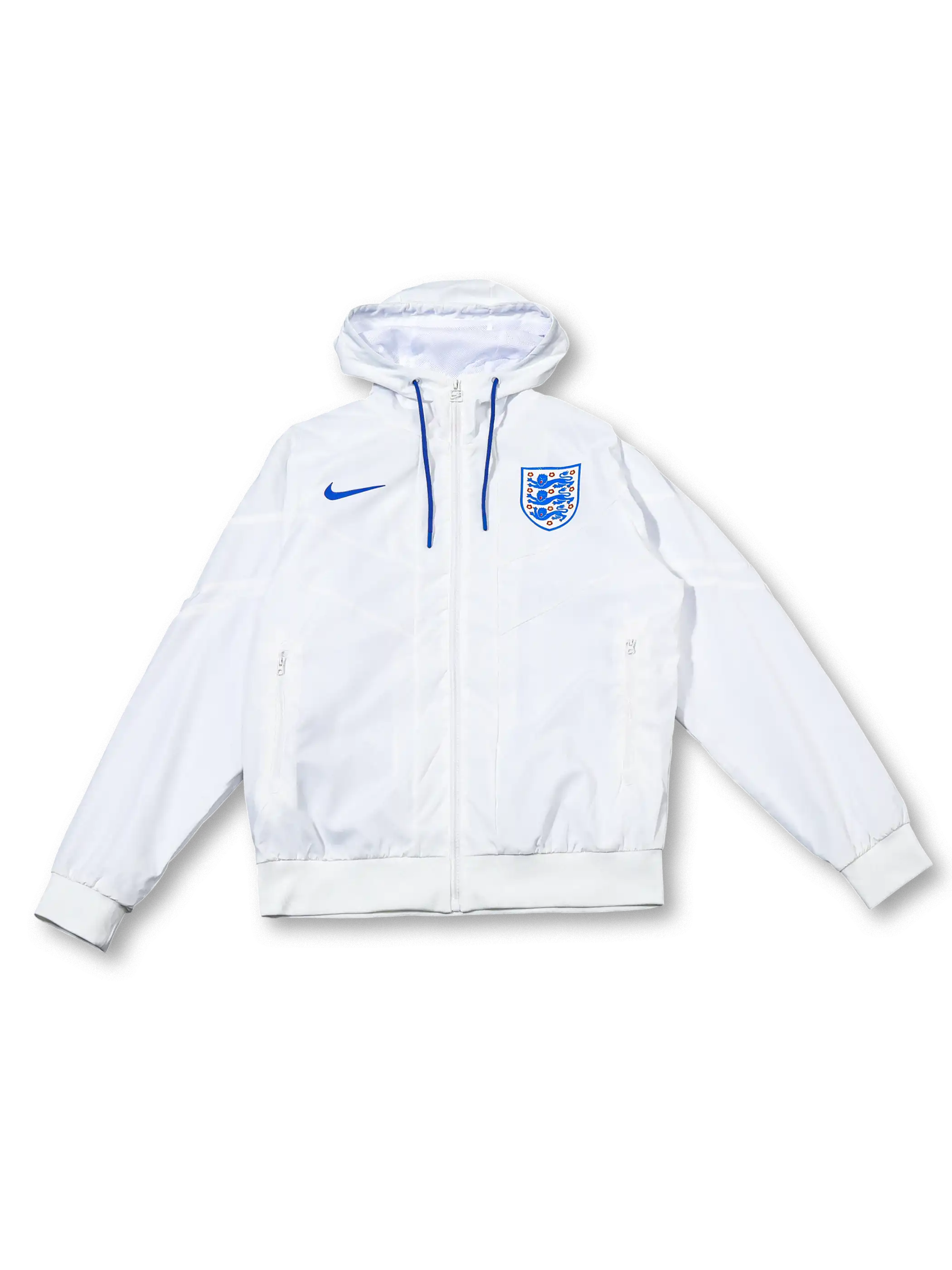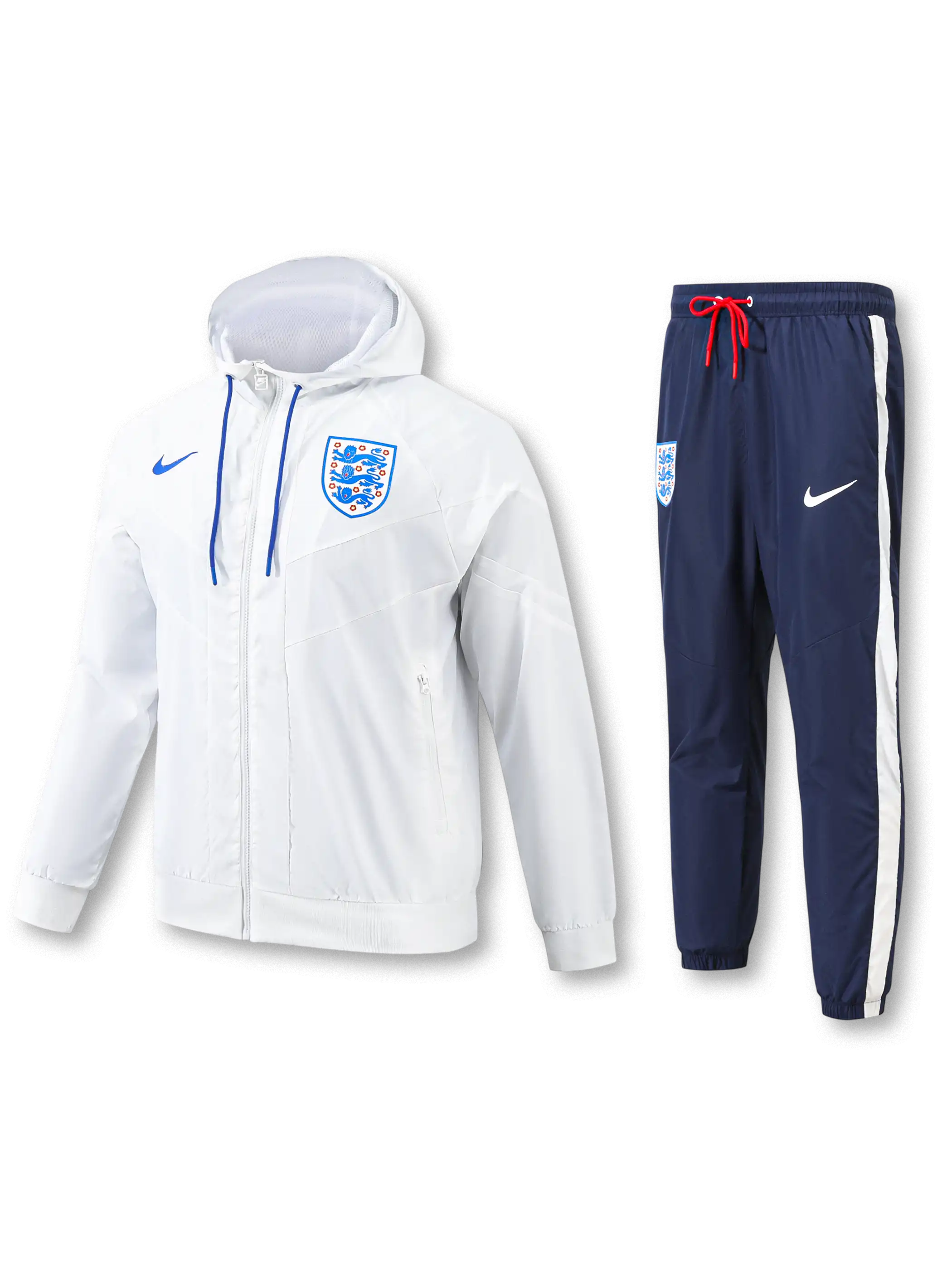 清潔感あるホワイトのフード付きジャケットとネイビーのトラックパンツで構成し、三獅子エンブレムとNikeスウッシュを明確に配置した端正なデザインで、軽量シェル素材により移動時の快適性を高めつつ、代表チームの象徴性を日常的にも取り入れられる構成となっている。
