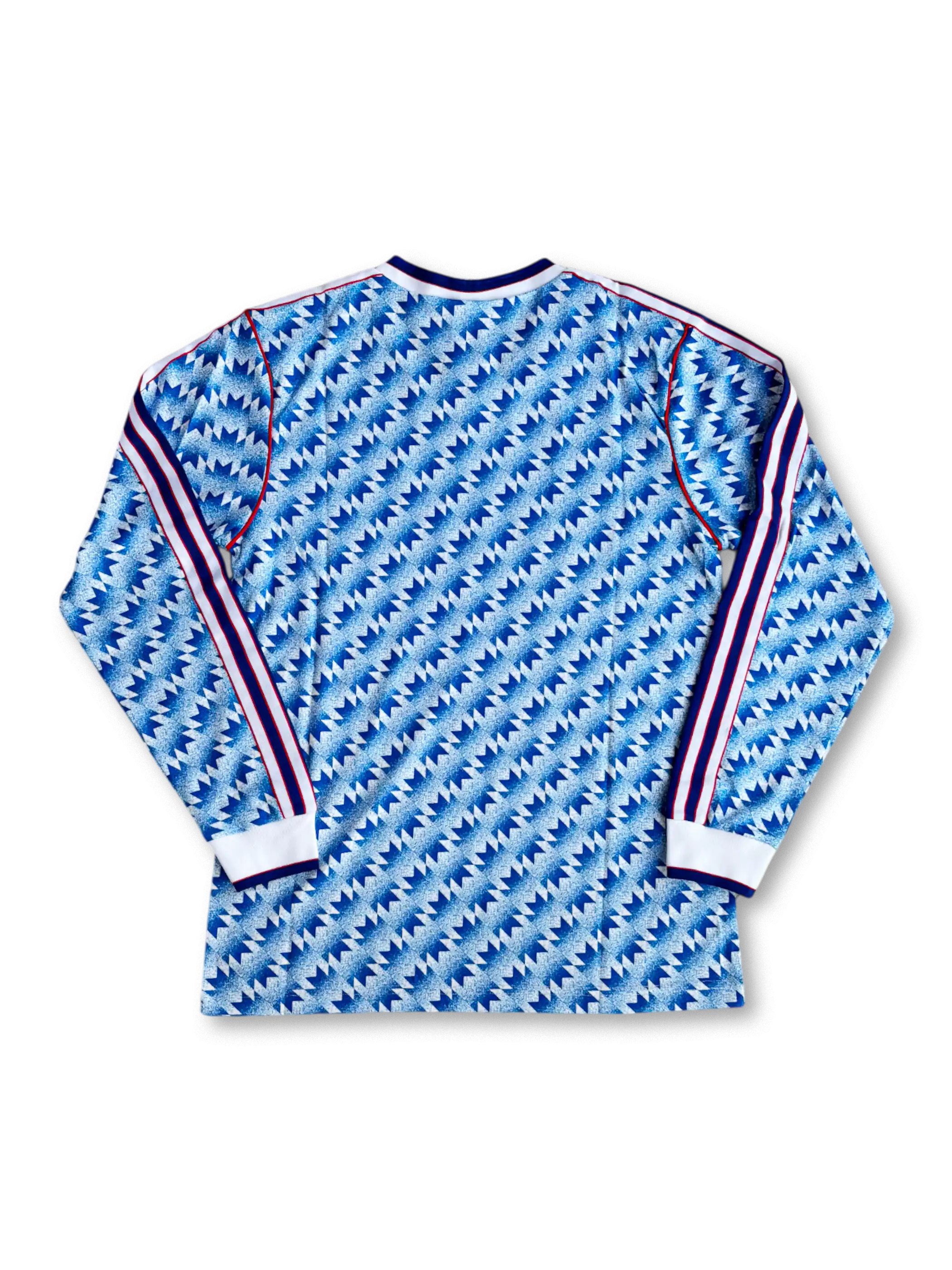 1990/92シーズン、FAカップ優勝を果たし黄金期の幕開けを告げたマンチェスター・ユナイテッドが着用した雪柄ブルーのアウェイ長袖ユニフォームは、クラブの復活を象徴する伝説的デザイン。