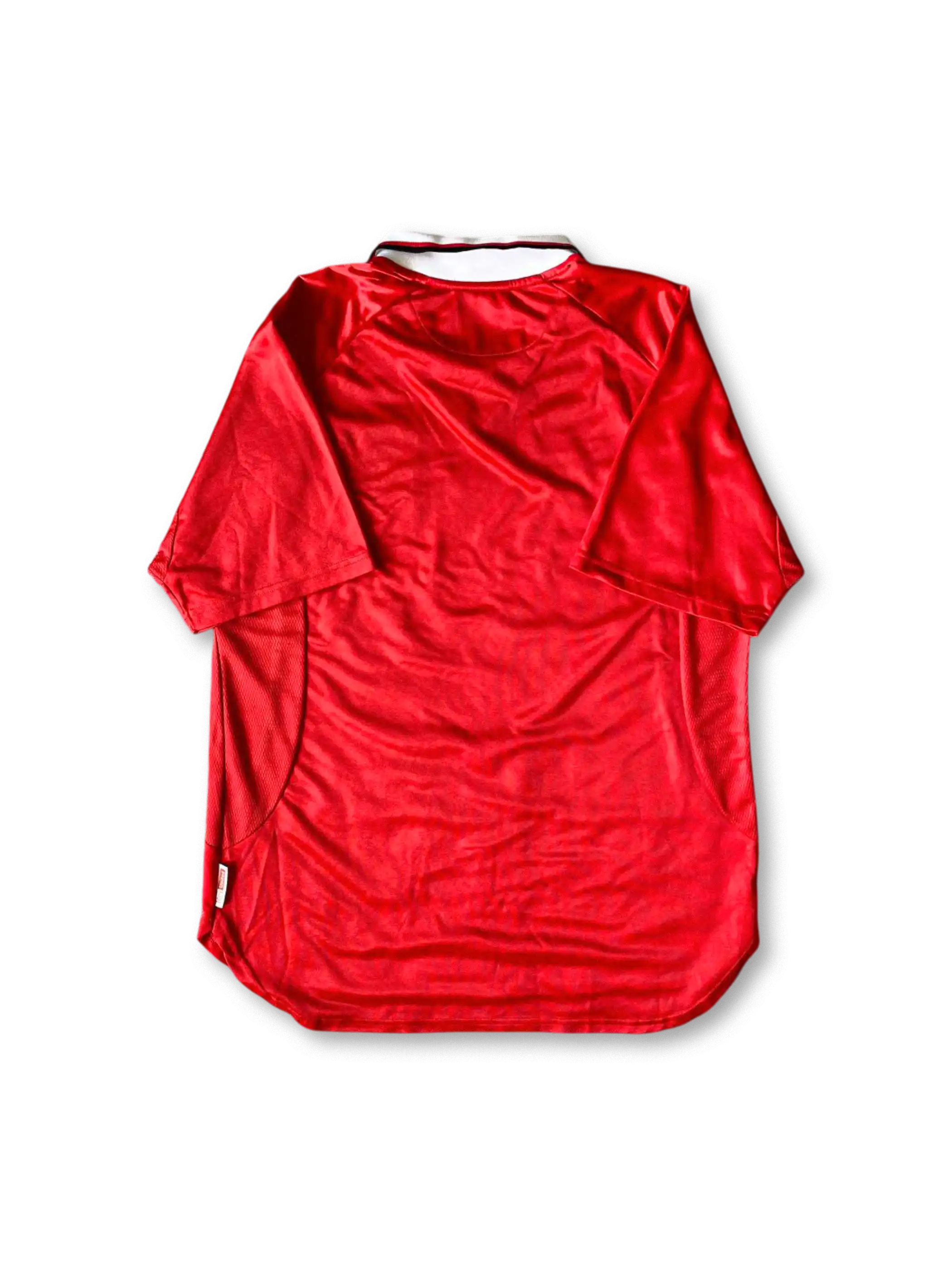 UMBRO製の白襟ポロに光沢レッドのジャカード、胸に“UEFA CHAMPIONS LEAGUE WINNERS 1999”の記念刺繍、立体ラバープリントのSHARP、刺繍クラブクレストを搭載。脇メッシュと吸汗速乾ポリエステルで通気性を確保し、90sのボックスシルエットとトーンオンのトロフィーモチーフがコレクション価値を高める。