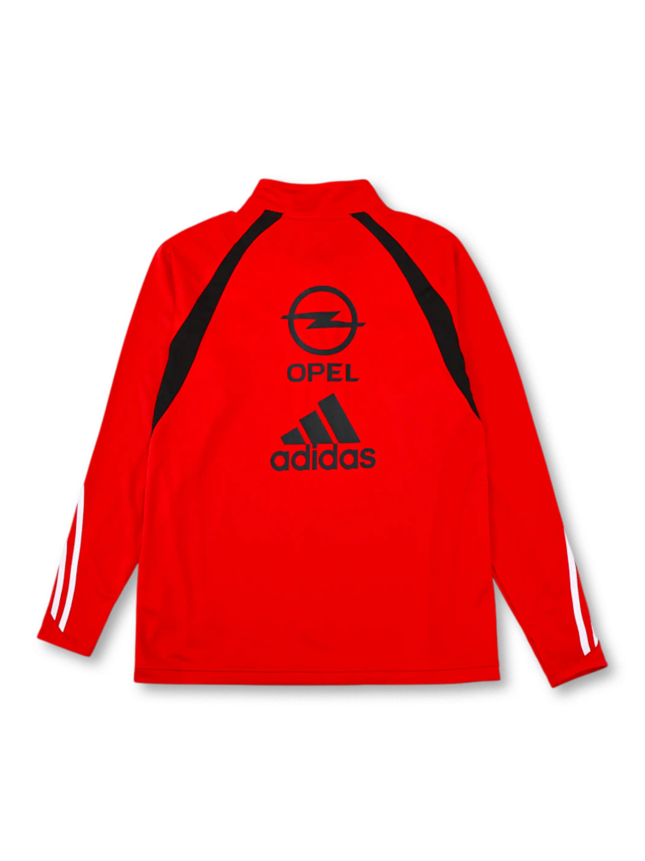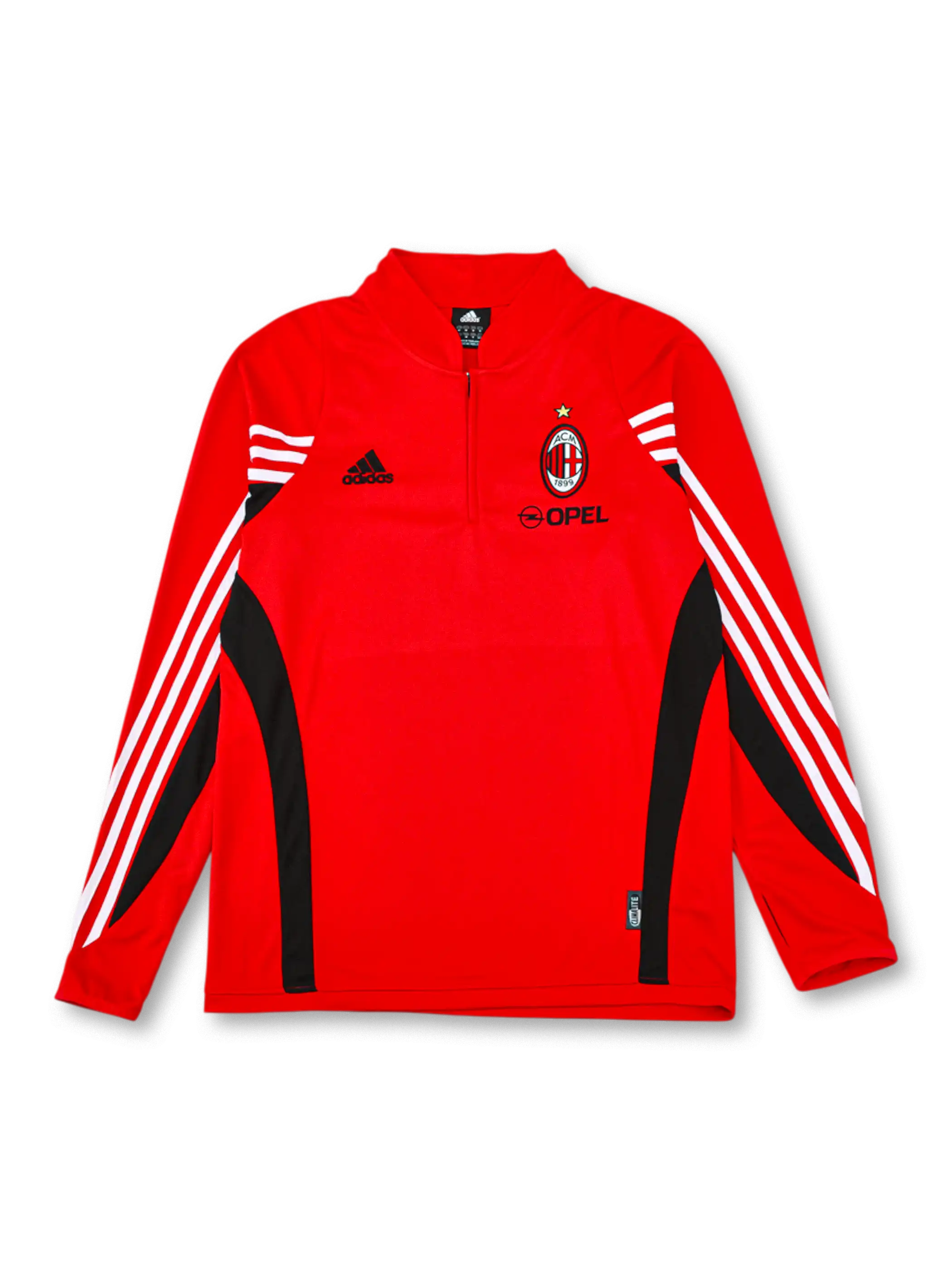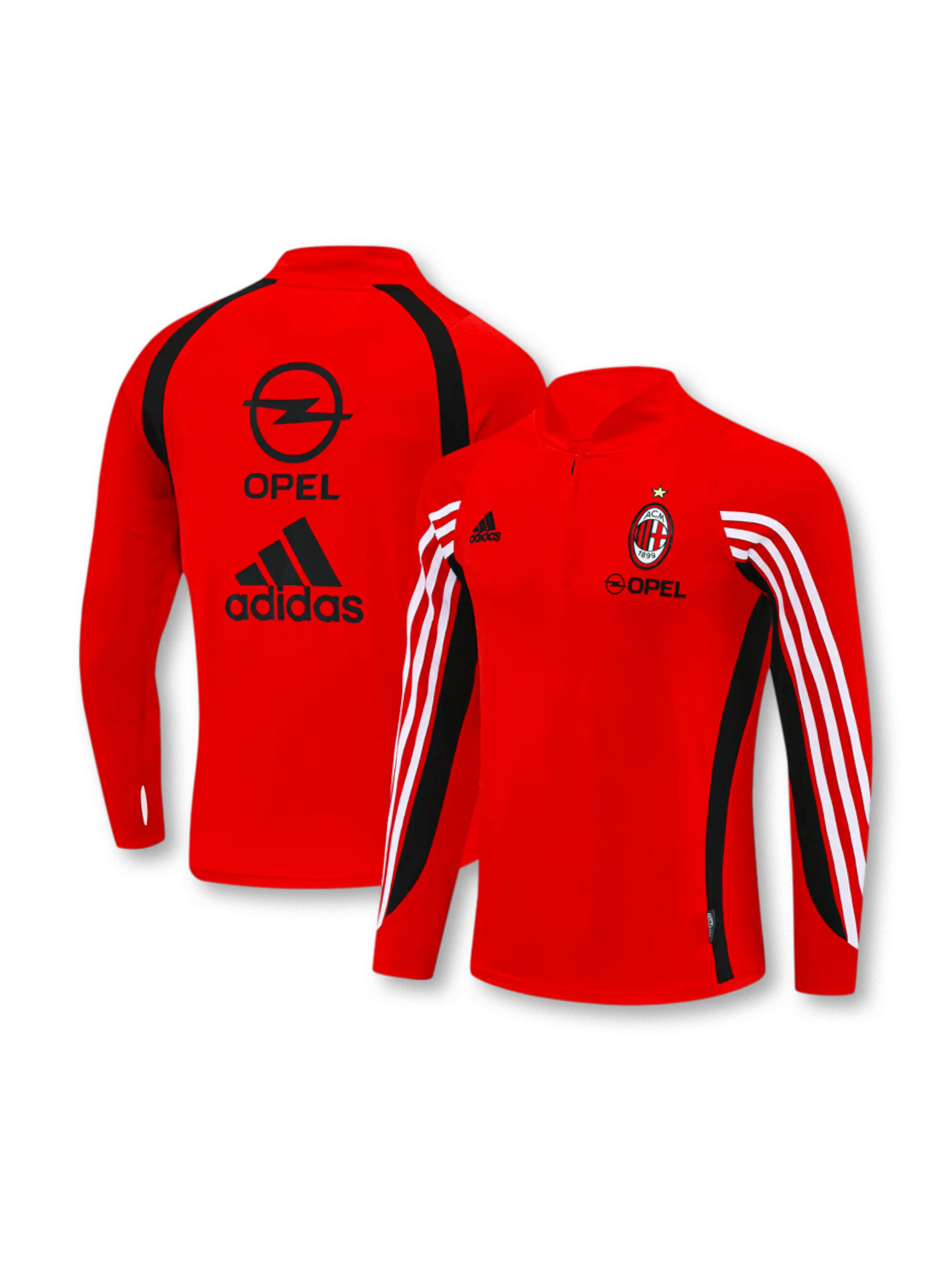 鮮やかなレッドを基調にブラックのサイドラインとホワイトのスリーストライプスを組み合わせたクラシックなデザイン。胸元にはOpelロゴとクラブエンブレム、adidasロゴを配置。ハーフジップ仕様で動きやすさと実用性を兼ね備え、公式トレーニングウェアとして支給された一着。2003-04シーズン、セリエAと欧州で躍動したミランを象徴するモデルであり、当時のadidasサプライ期を代表する稀少品。