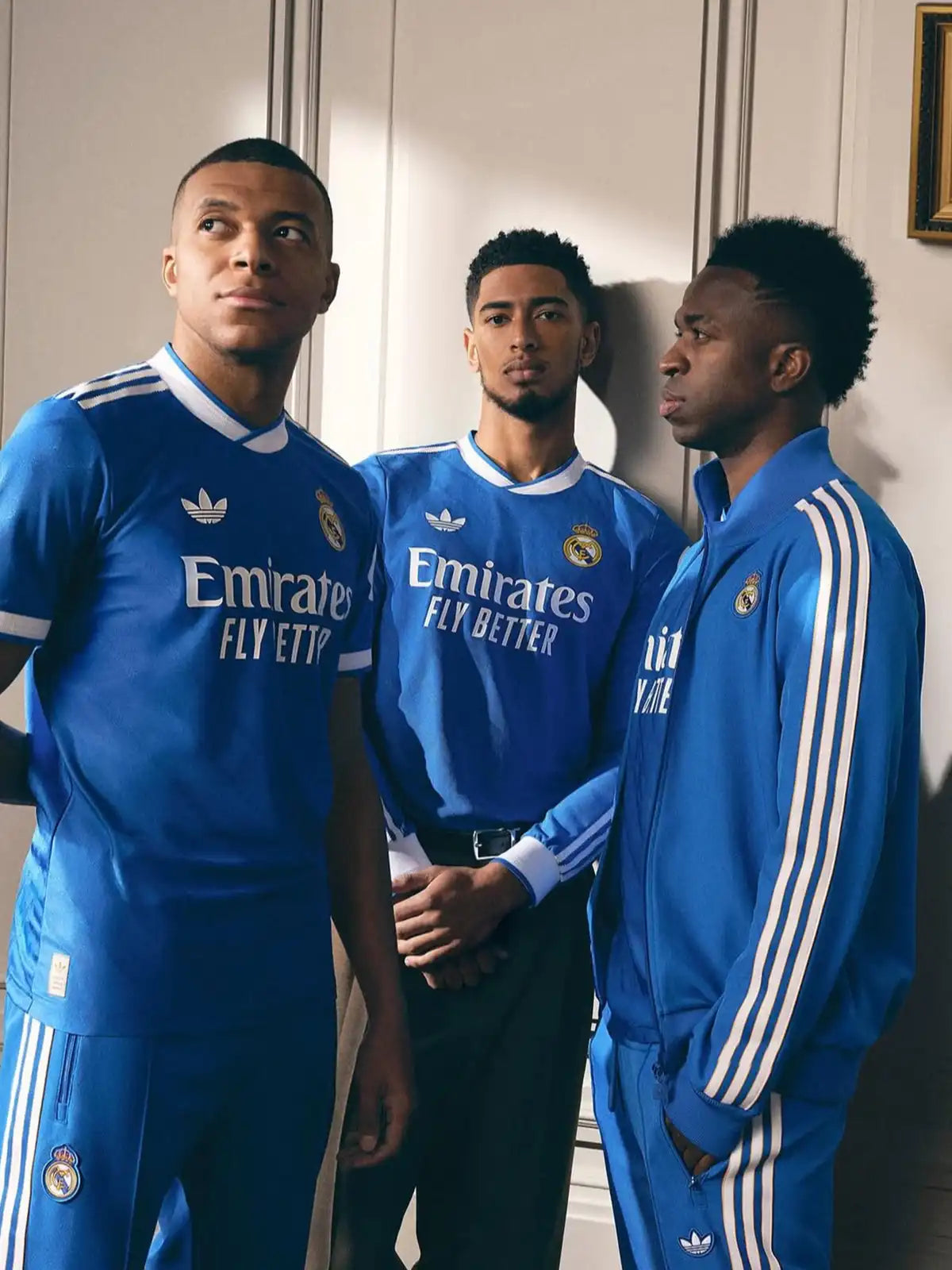 80年代のスタジアムスタイルを彷彿とさせるブルーを基調に、胸と腿部には刺繍仕様の三つ葉ロゴとクラブエンブレムを配置。アイコニックなスリーストライプスが肩から袖、パンツサイドに走り、オリジナルスらしいレトロなムードを表現しています。