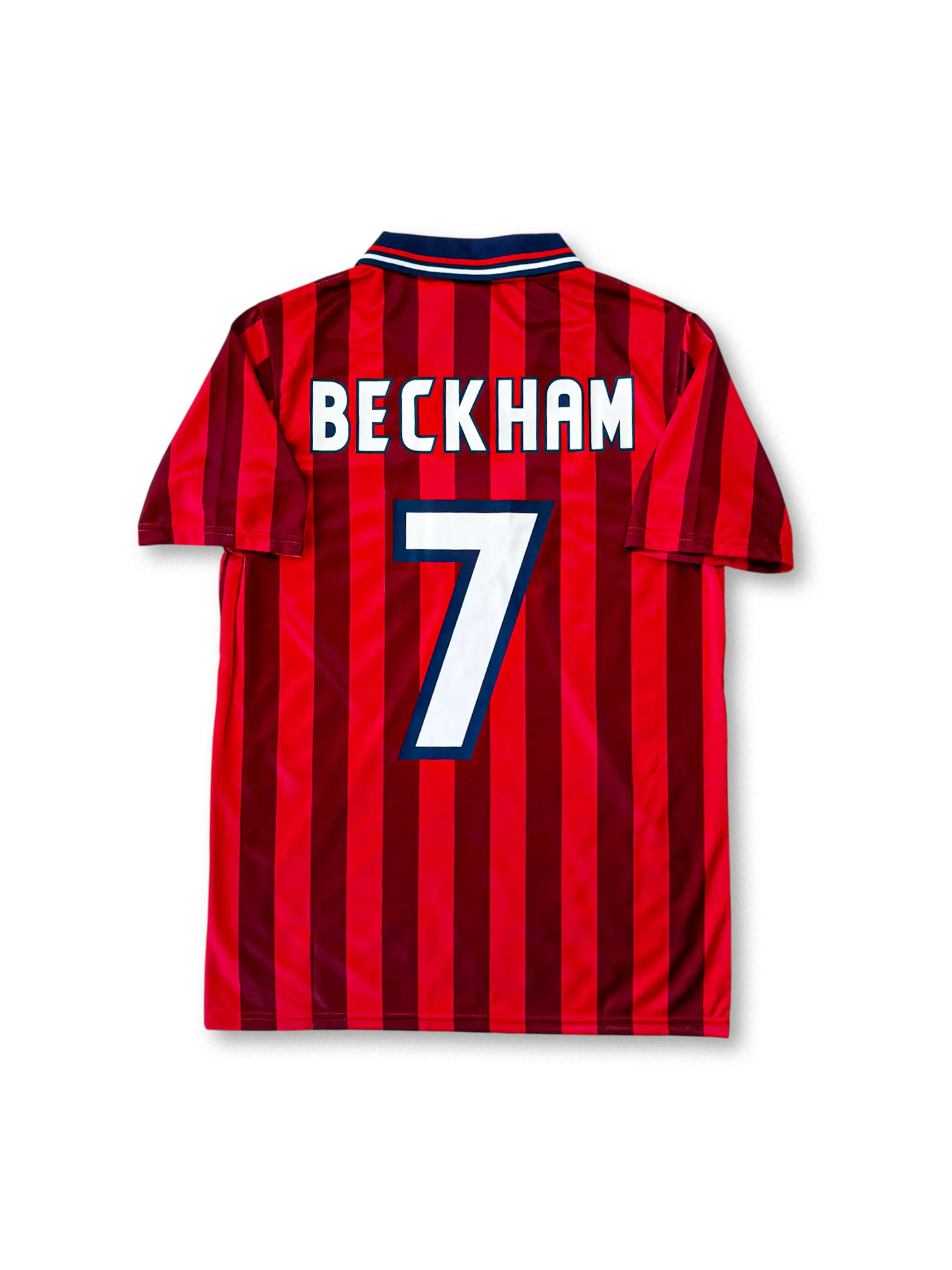 深みのあるレッドストライプに、中央の聖ジョージクロスをエンボスで重ねたデザインが特徴的なUMBRO製アウェイモデル。襟付きクラシックスタイルにネイビーとホワイトのトリムを施し、英国的エレガンスを強調。胸中央の「UMBRO」ロゴとエンブレムの配置バランスも美しく、デイヴィッド・ベッカムが背番号7として着用した時代を象徴するユニフォーム。90年代後半のイングランド代表デザインの中でも特に完成度の高い一着。
