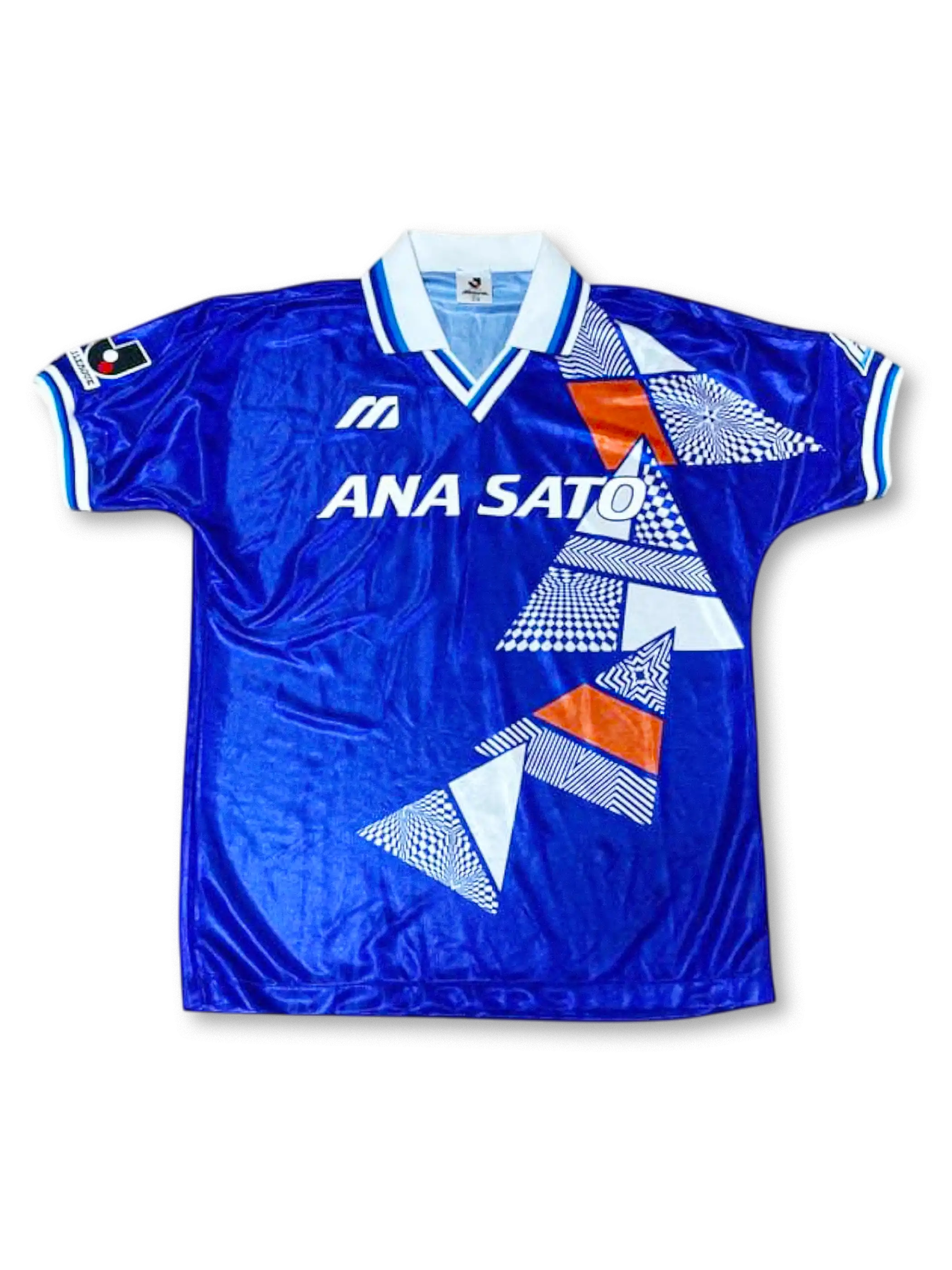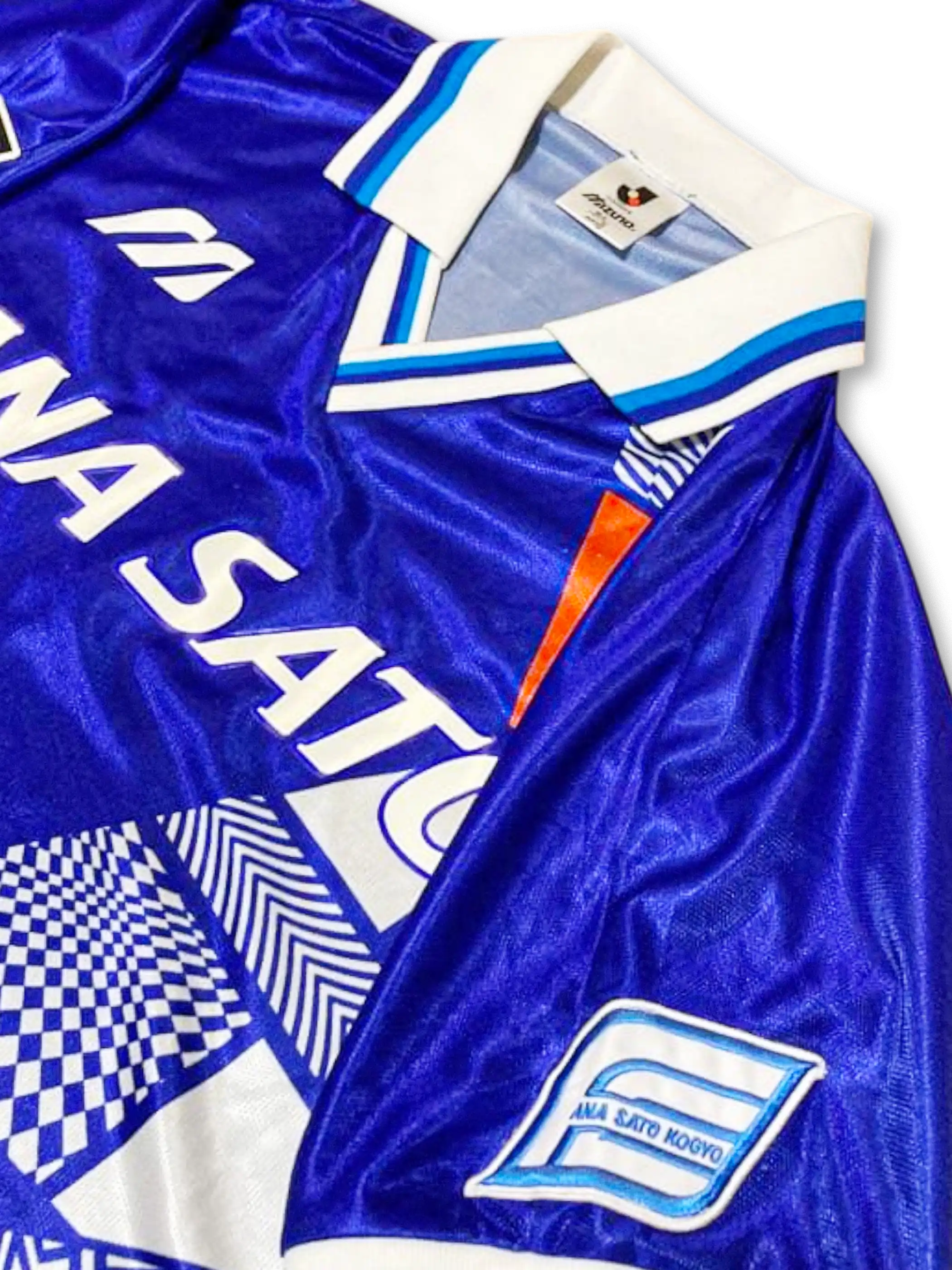 ANA(全日空)とSATOのダブルスポンサーが並ぶ象徴的デザインで、幾何学模様のトライアングルグラフィックが印象的。ブルーを基調とした光沢ポリエステル素材に、当時のMizunoロゴとJリーグパッチが並ぶ90年代特有の風格。