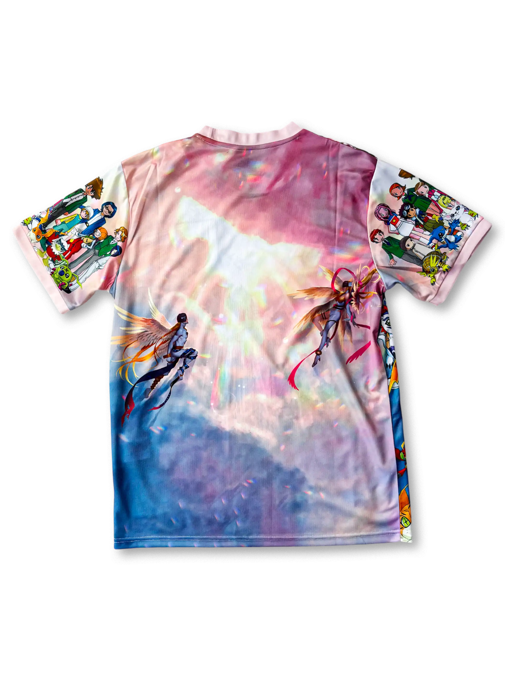 背面にはホーリーエンジェモンとエンジェウーモンが翼を広げ、デジタルワールドの希望を象徴する幻想的なアートが広がる。ピンクとブルーの柔らかなグラデーションは温かさと夢を表現し、観賞用にもファッションアイテムとしても成立するコレクターズアイテム。