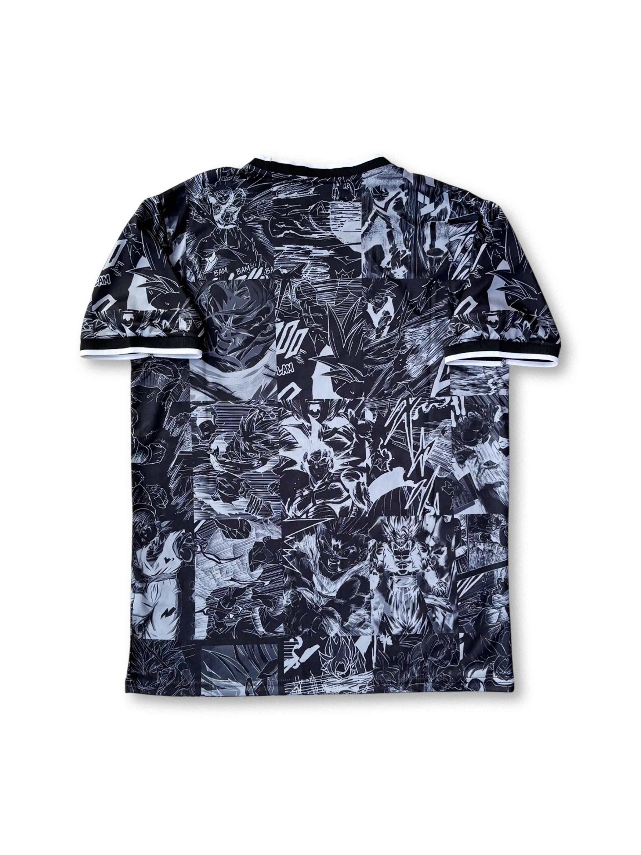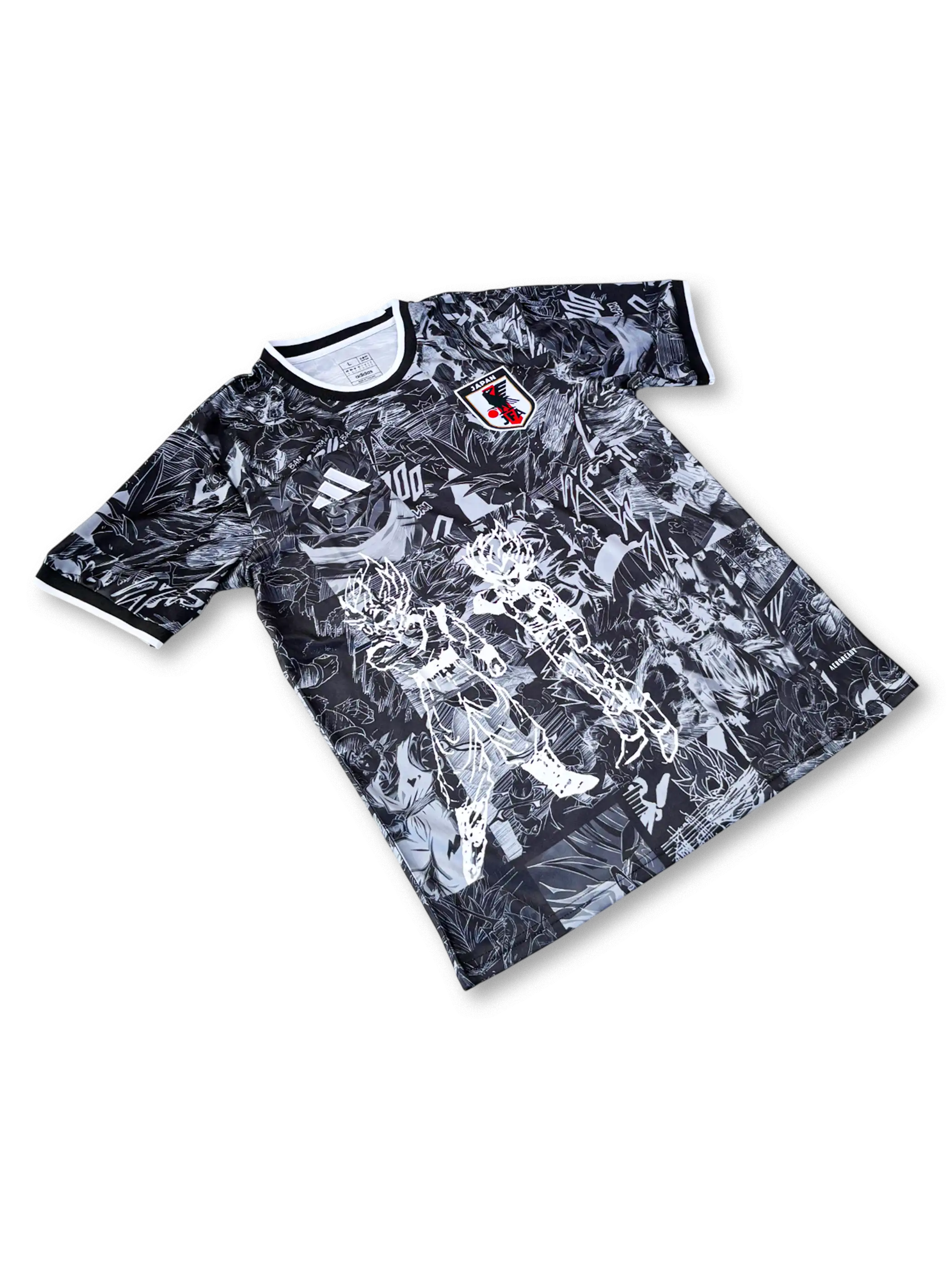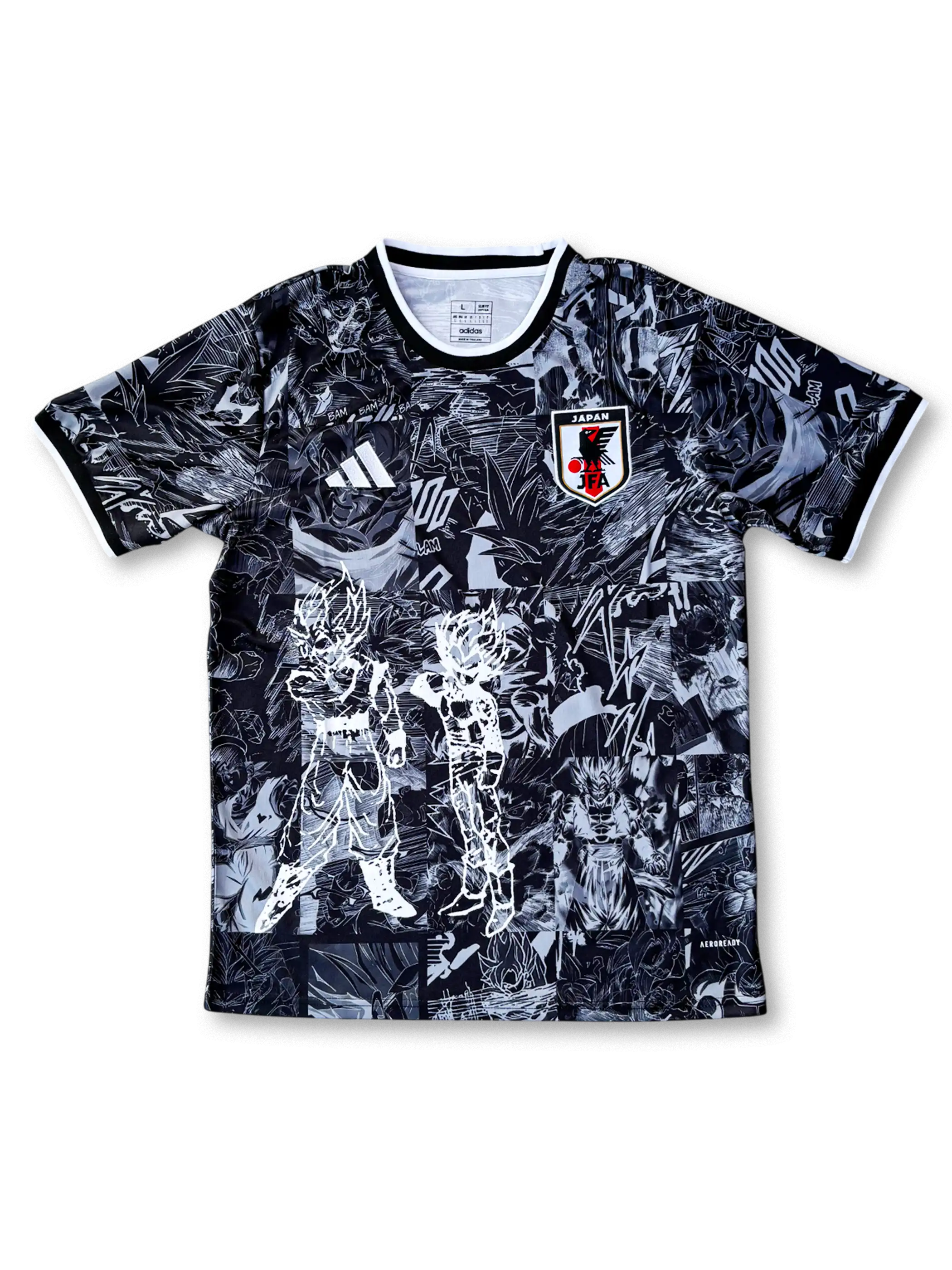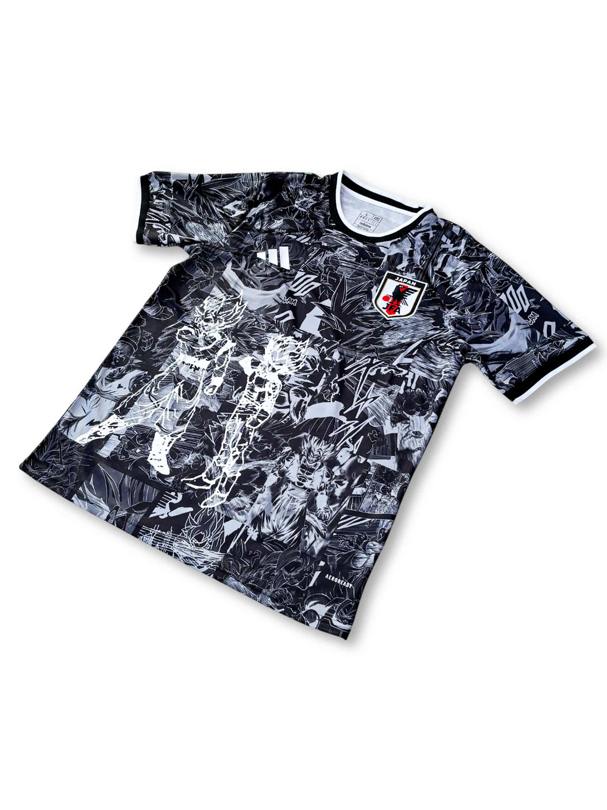 《ドラゴンボール》の世界を日本代表の象徴として再構築したモノクロデザイン。悟空とベジータの姿を白のシルエットで配置し、闘志と友情の共鳴を表現。背景には戦闘シーンのコマを緻密にレイアウトし、漫画的な奥行きを再現。adidasのAEROREADY素材による高い通気性と軽量性を備え、デザイン性と機能性を兼ね備えたアートピース。コレクションとしても高い完成度を誇る一着。