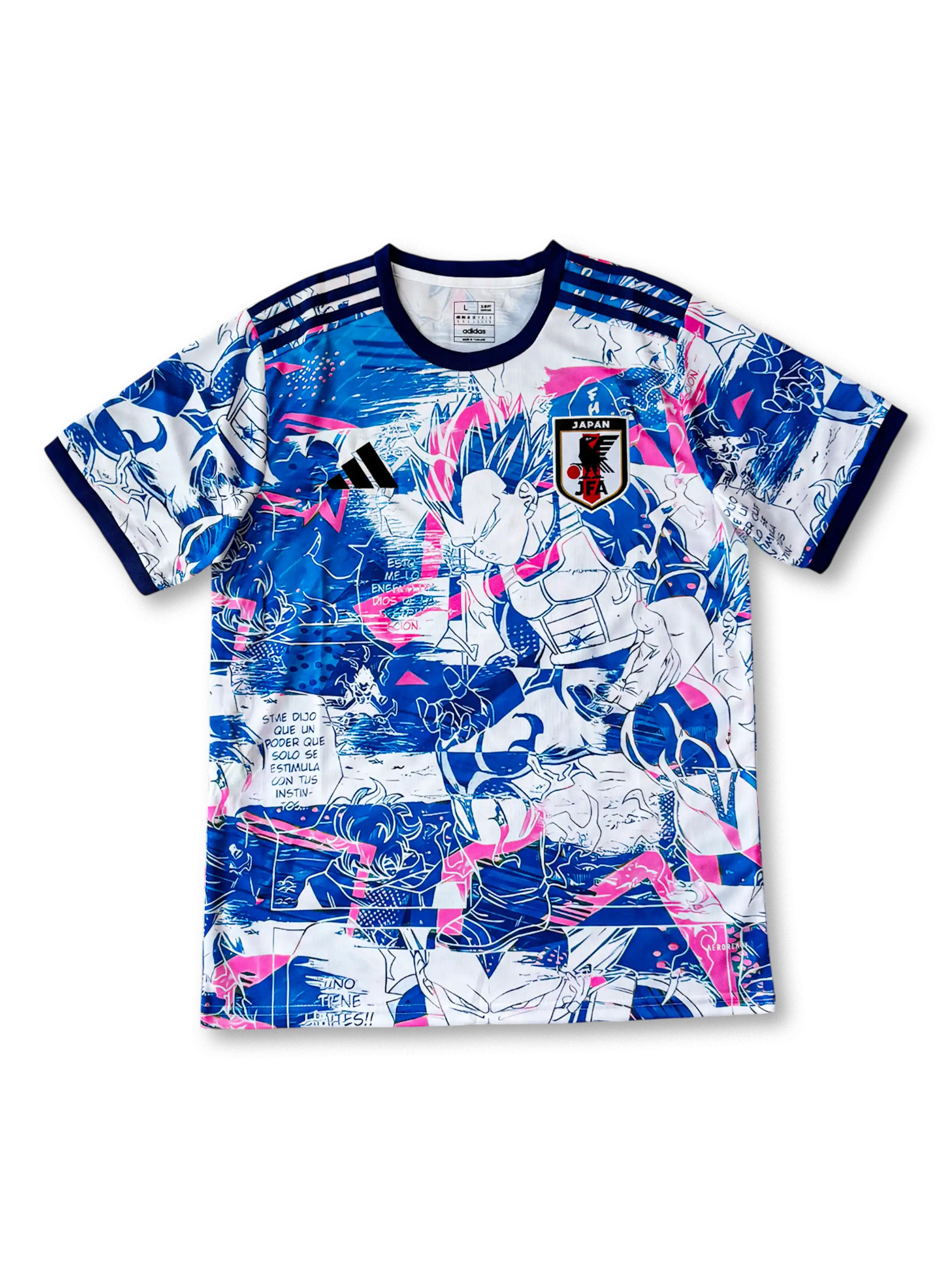 ブルーとピンクを基調としたハイエネルギーなグラフィックで、ベジータの超サイヤ人ブルー形態を中心に迫力ある戦闘シーンをデザイン。肩のスリーストライプにはクラシックな日本代表カラーを採用し、エネルギーの爆発と精神的覚醒を象徴するビジュアルに仕上げられている。adidas製の軽量素材が快適な着心地と通気性を確保。ファッション・カルチャー・スポーツが交差する特別仕様の一着。
