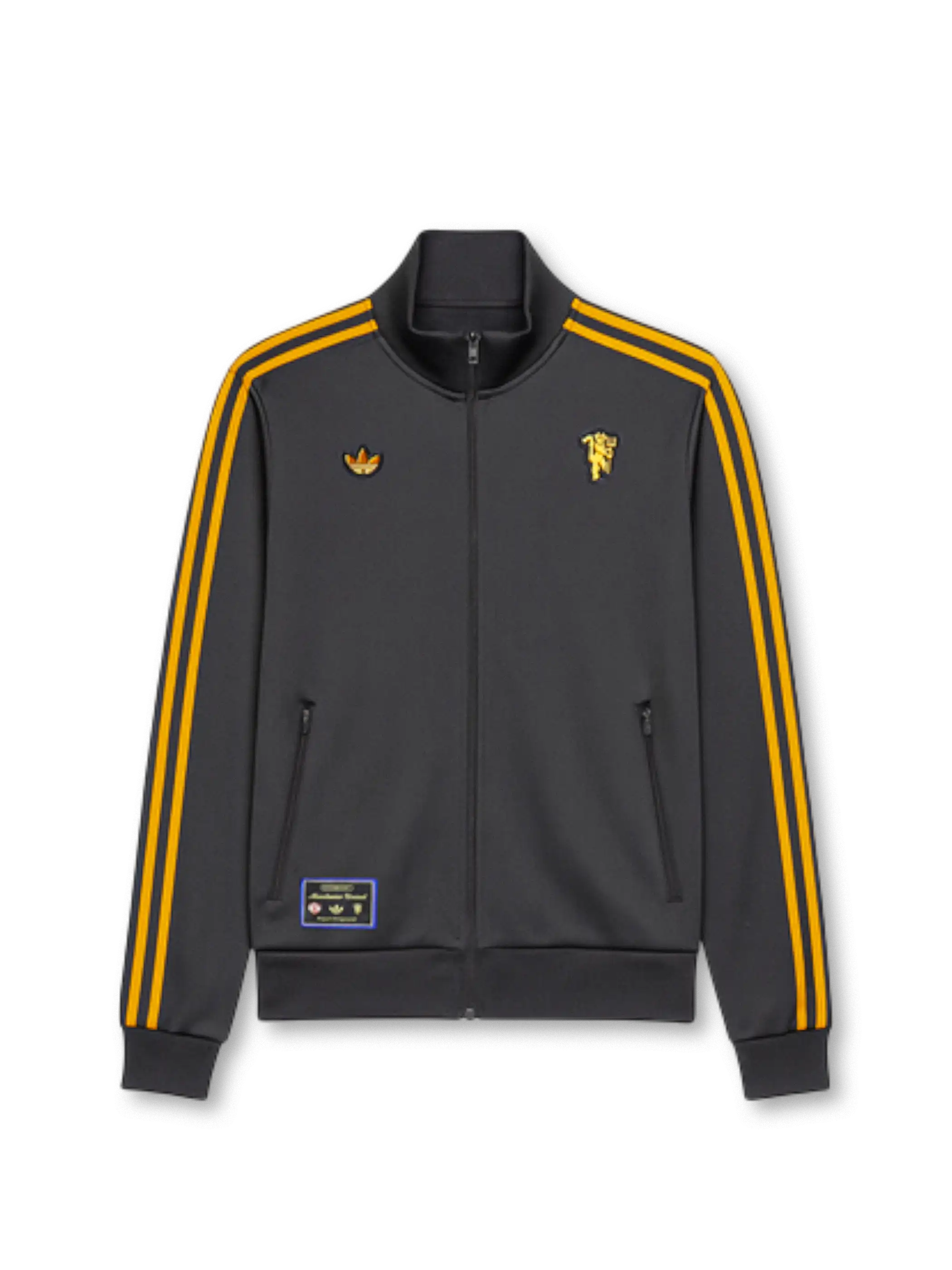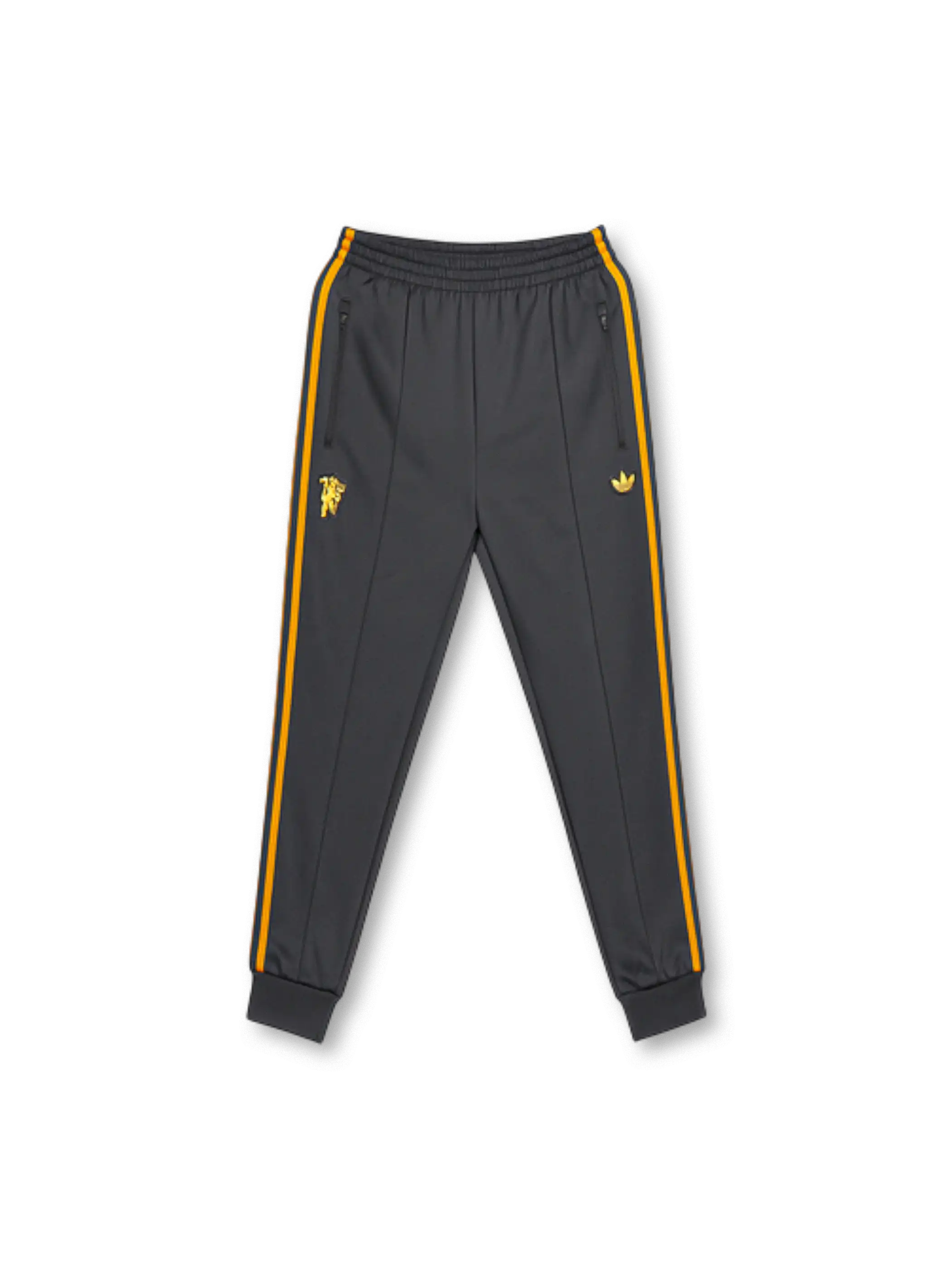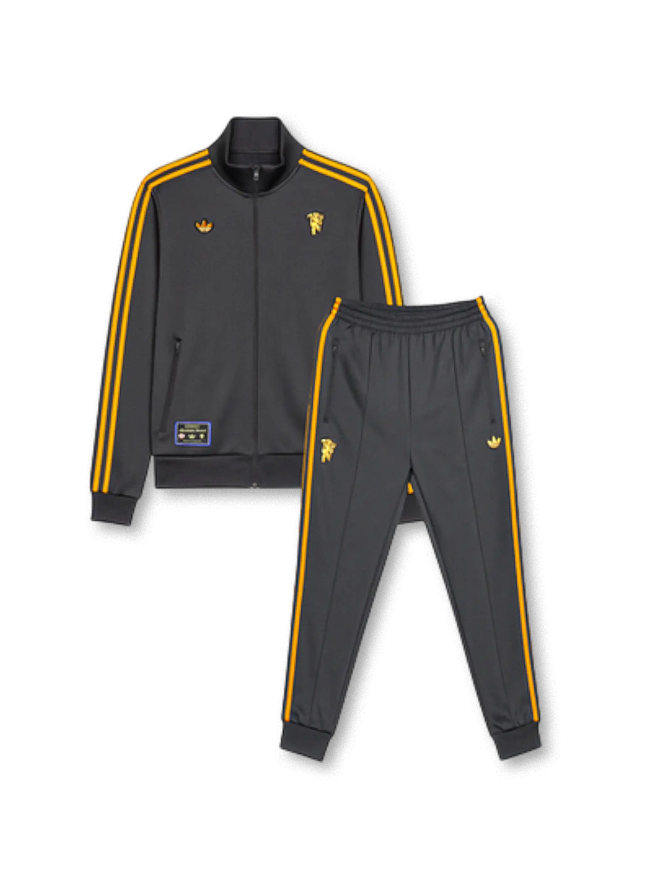 クラブエンブレムとトレフォイルロゴを左右に配したシンプルかつ象徴的なデザイン。チャコールグレーのボディにゴールドの3ストライプが映える構成で、袖からパンツ裾まで統一されたラインがクラブの一体感を演出。吸湿速乾性のあるポリエステル素材を採用し、トレーニングからデイリーユースまで快適に着用可能。上下セットアップ仕様で、スタイル完成度の高い一着。