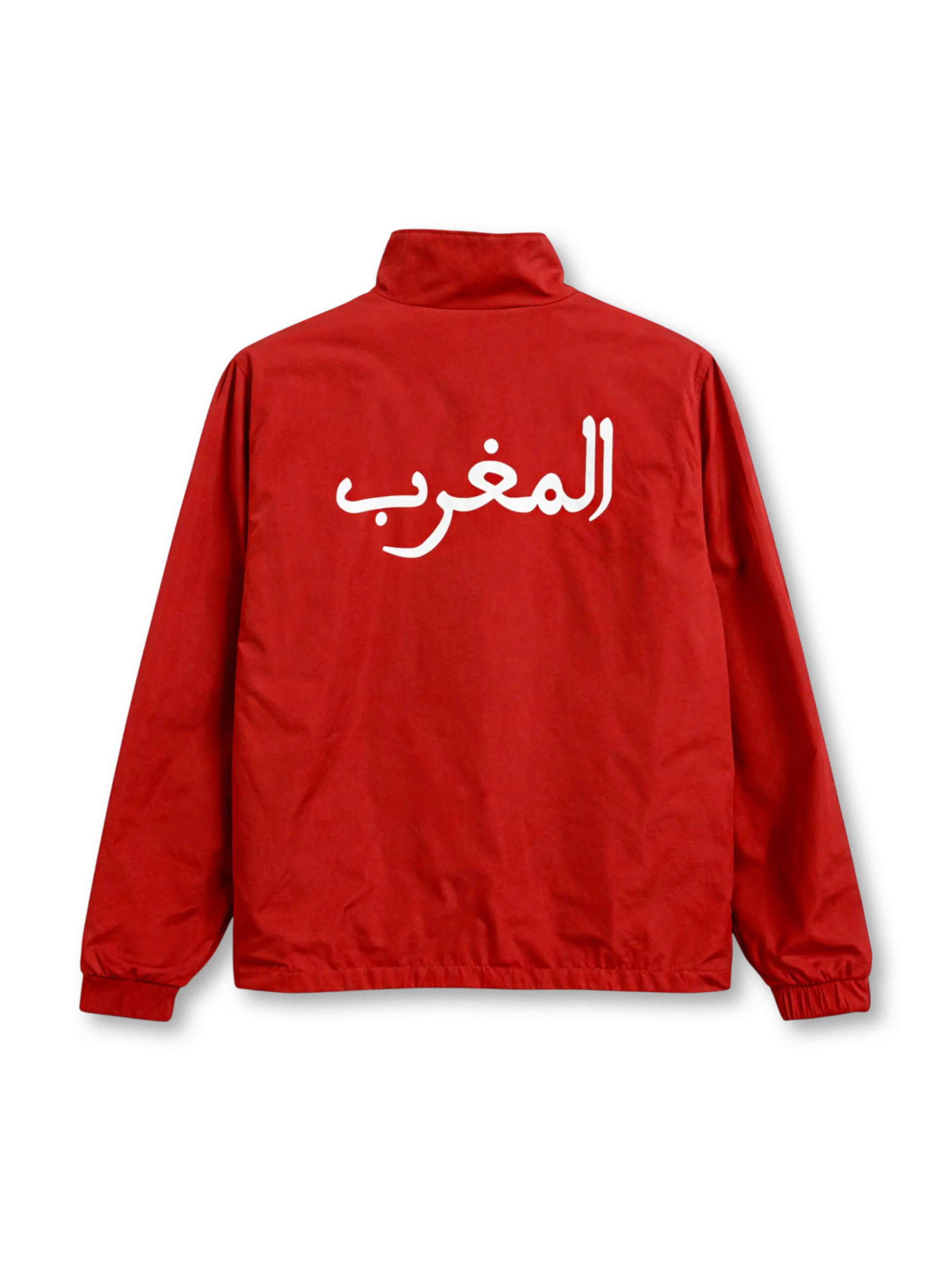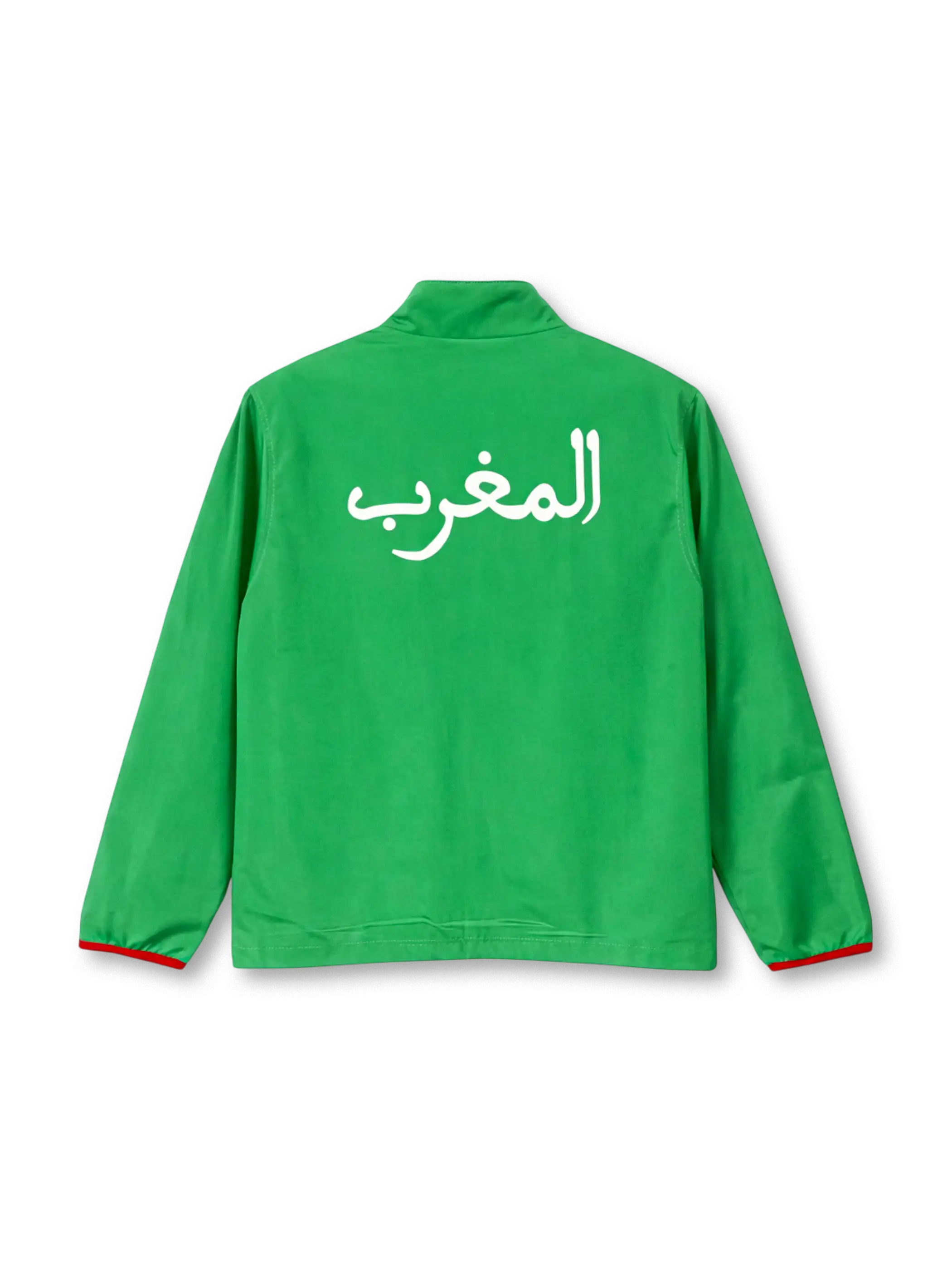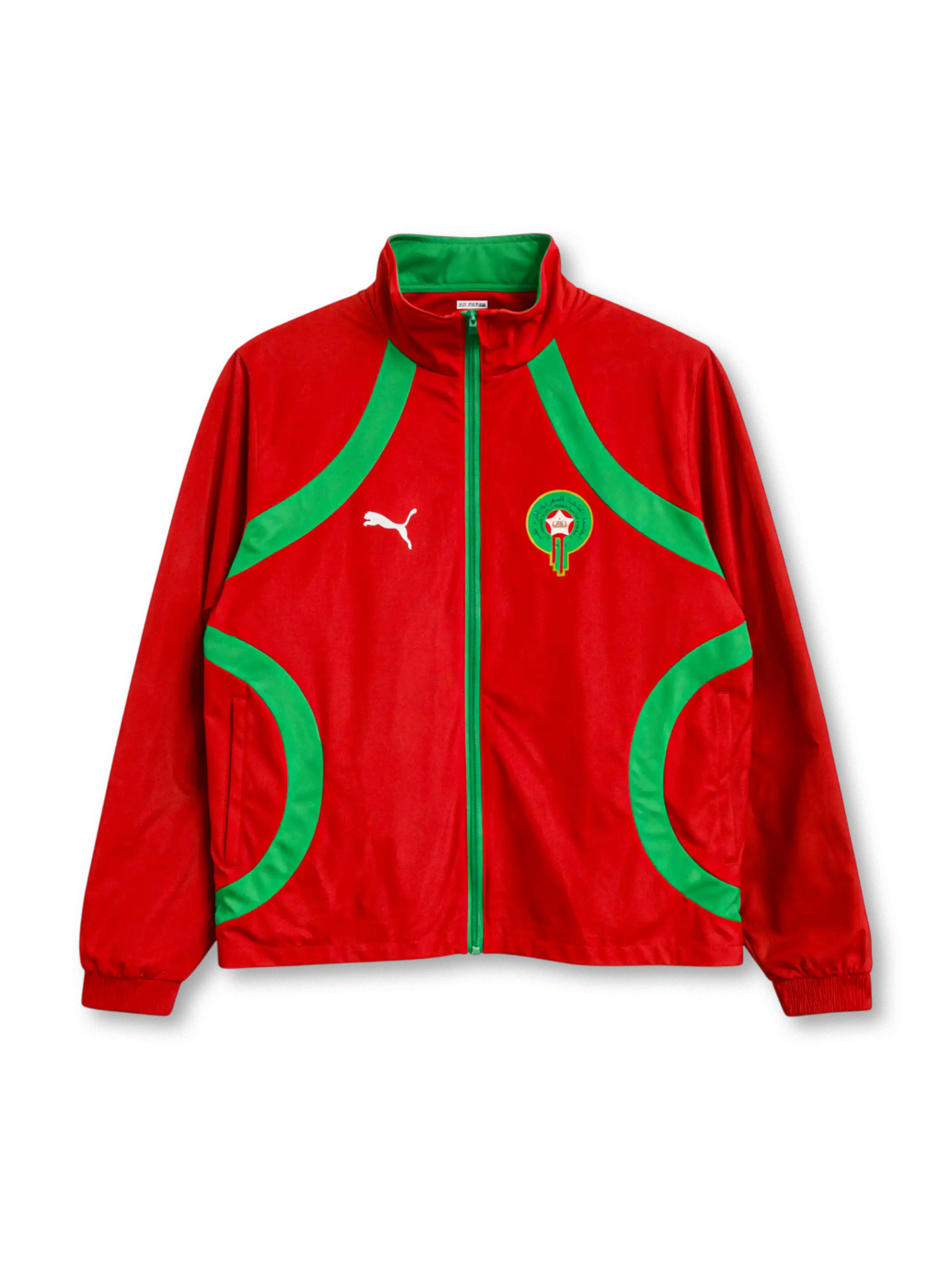 片面はグリーン基調にレッドのカーブ切替とPumaロゴ、モロッコ代表エンブレムを配置し、もう片面はレッド基調にグリーンの切替とグリーンジップでコントラストを強調した両面仕様です。スタンドカラー+フルジップ、左右ポケット付きで、気分やスタイリングに合わせて“色”を切り替えられる構成。背面にはアラビア語「المغرب」のプリントが入り、チームアイデンティティを文字要素でも示しつつ、ポリエステル系素材として軽量でレイヤリングしやすい着用感にまとめています。