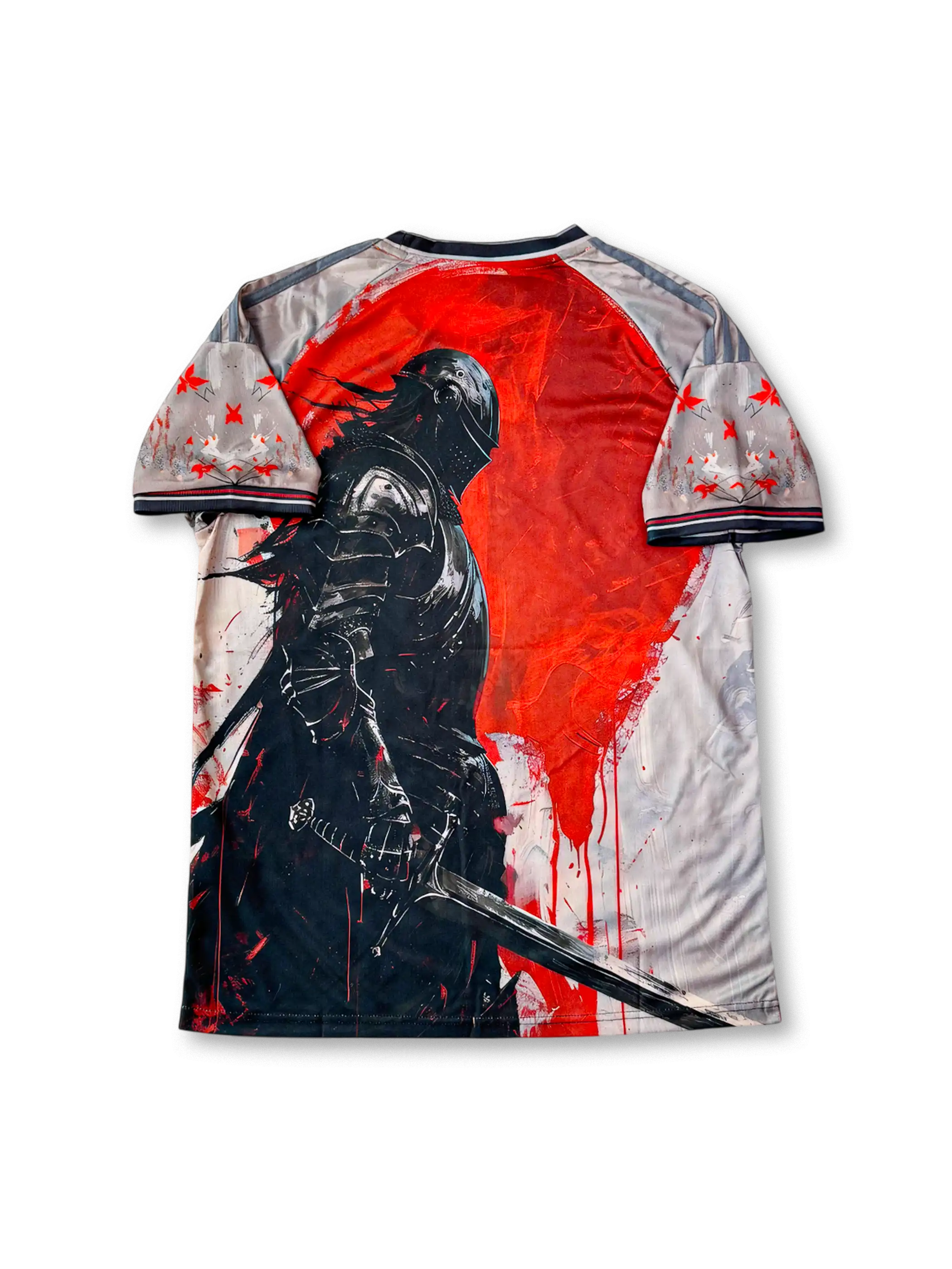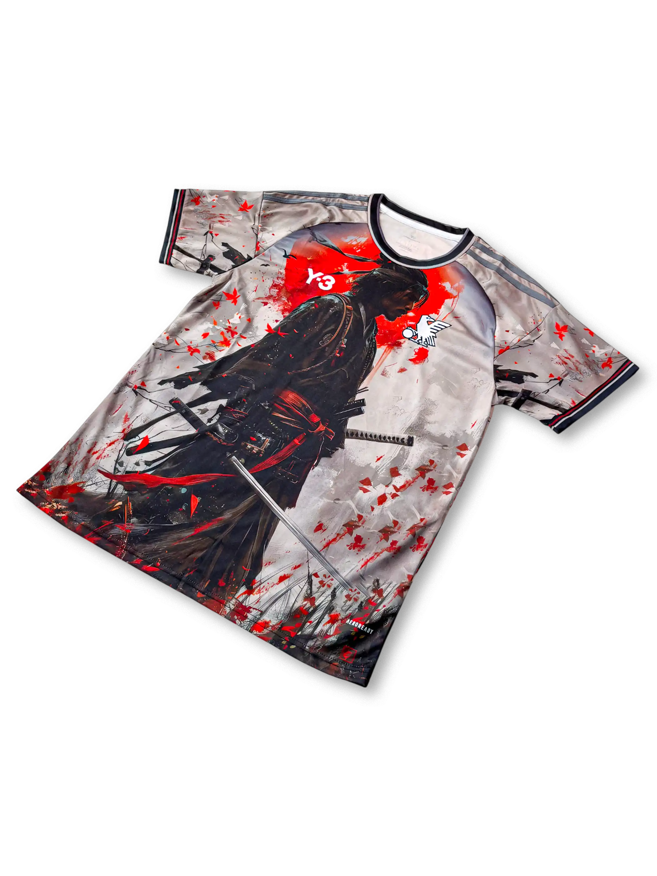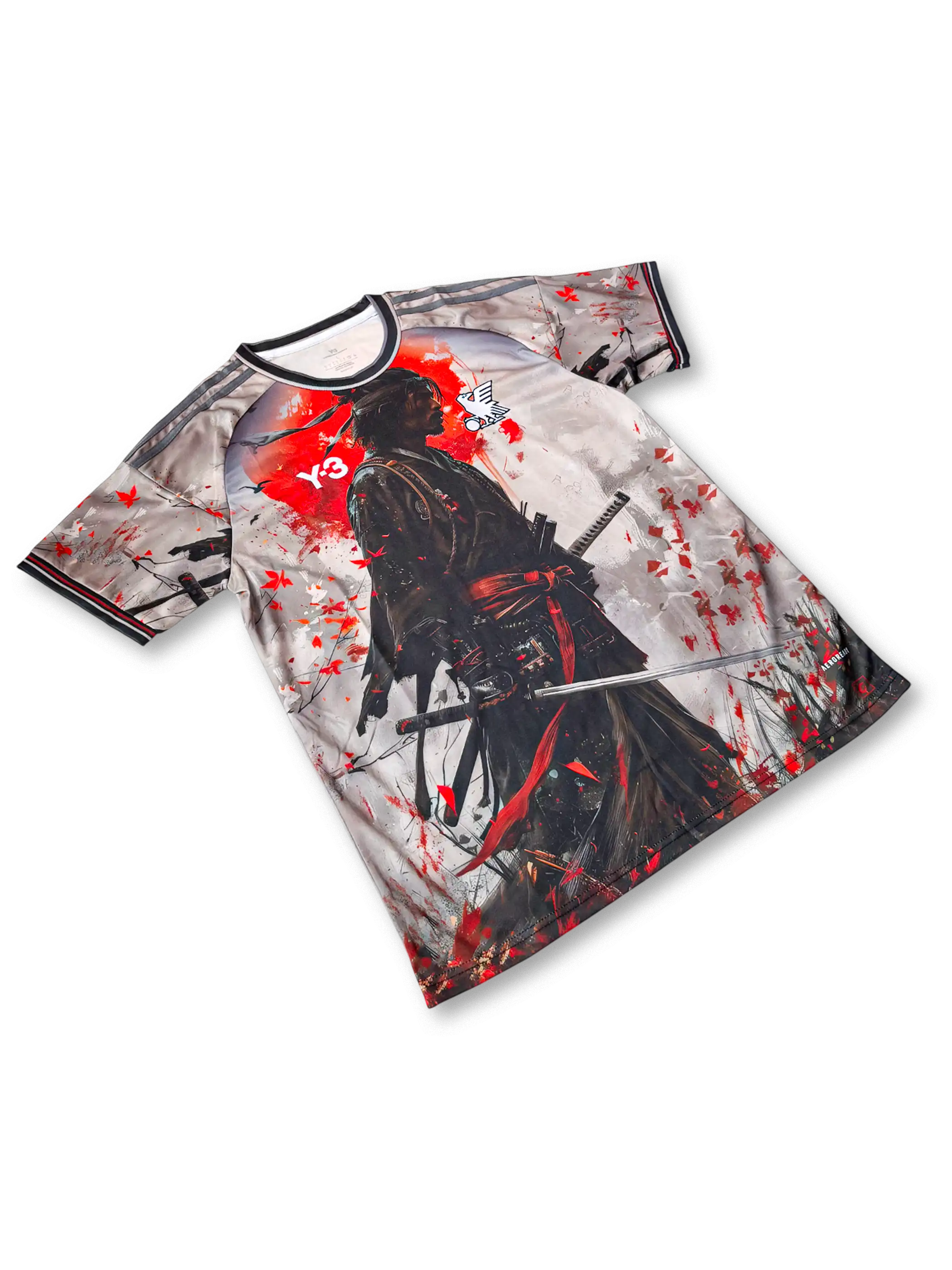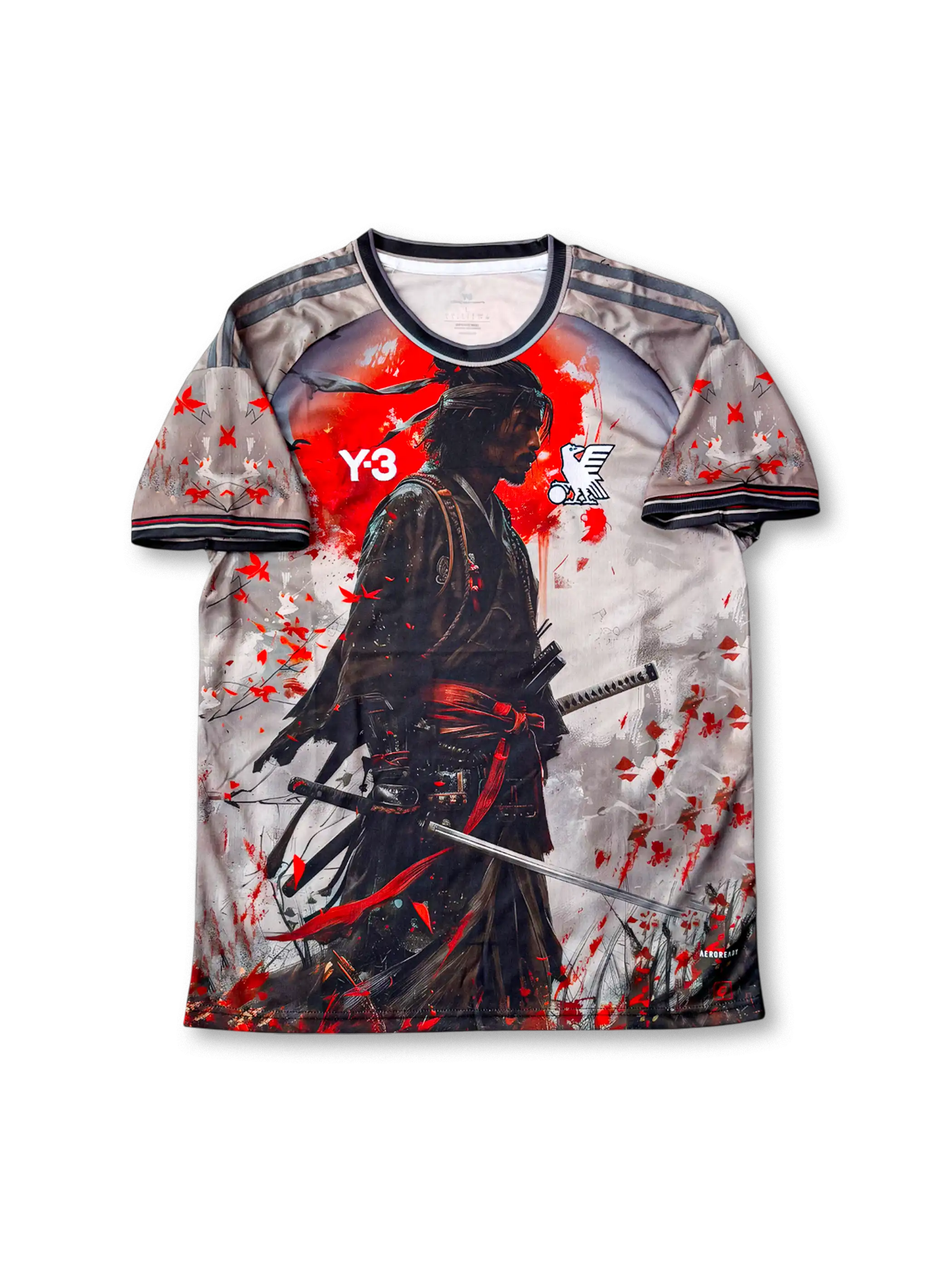 墨絵調の武士を大きく配置し、背面には燃えるような赤円を重ねた構成で、Y-3 風のアーティスティックな表現を採用した特別仕様。散らされた紅葉、墨飛沫、重厚な刀の描写がデザイン全体に奥行きを与え、胸には日本サッカー協会エンブレムを配置したコンセプトモデルとして強い視覚的存在感を持つ。