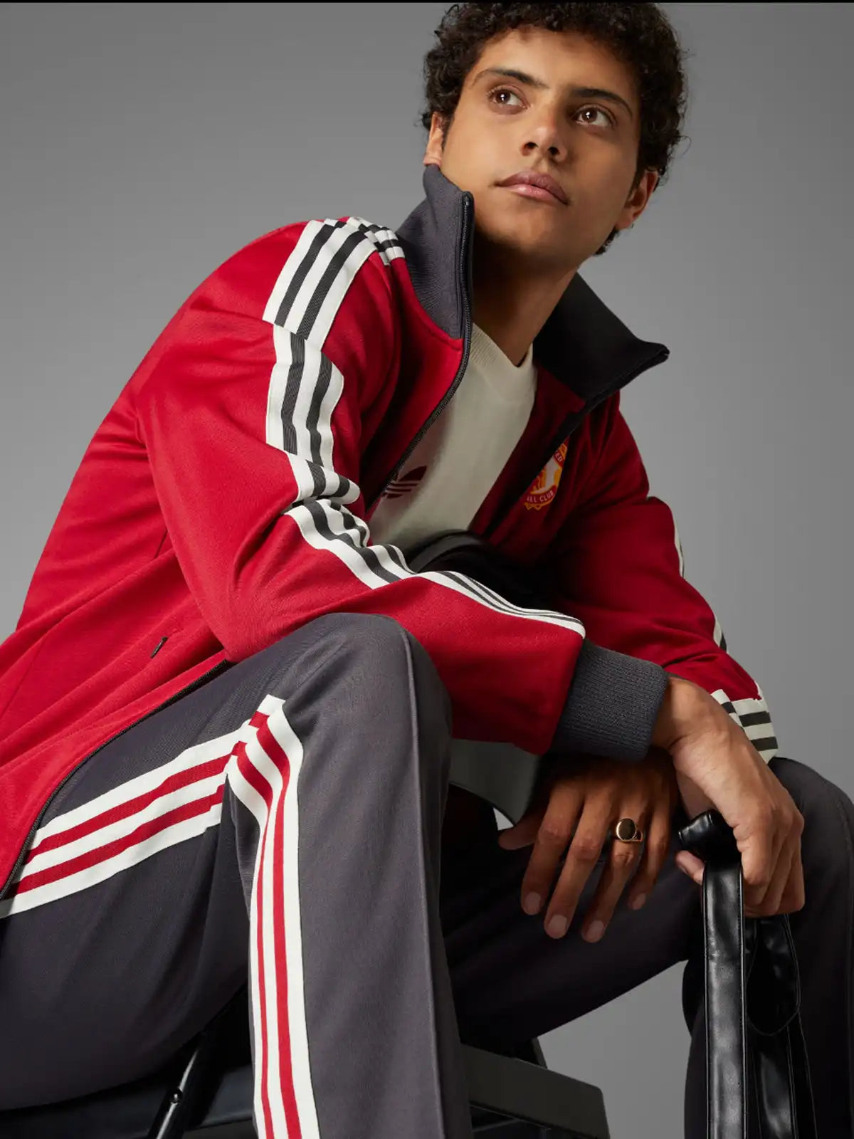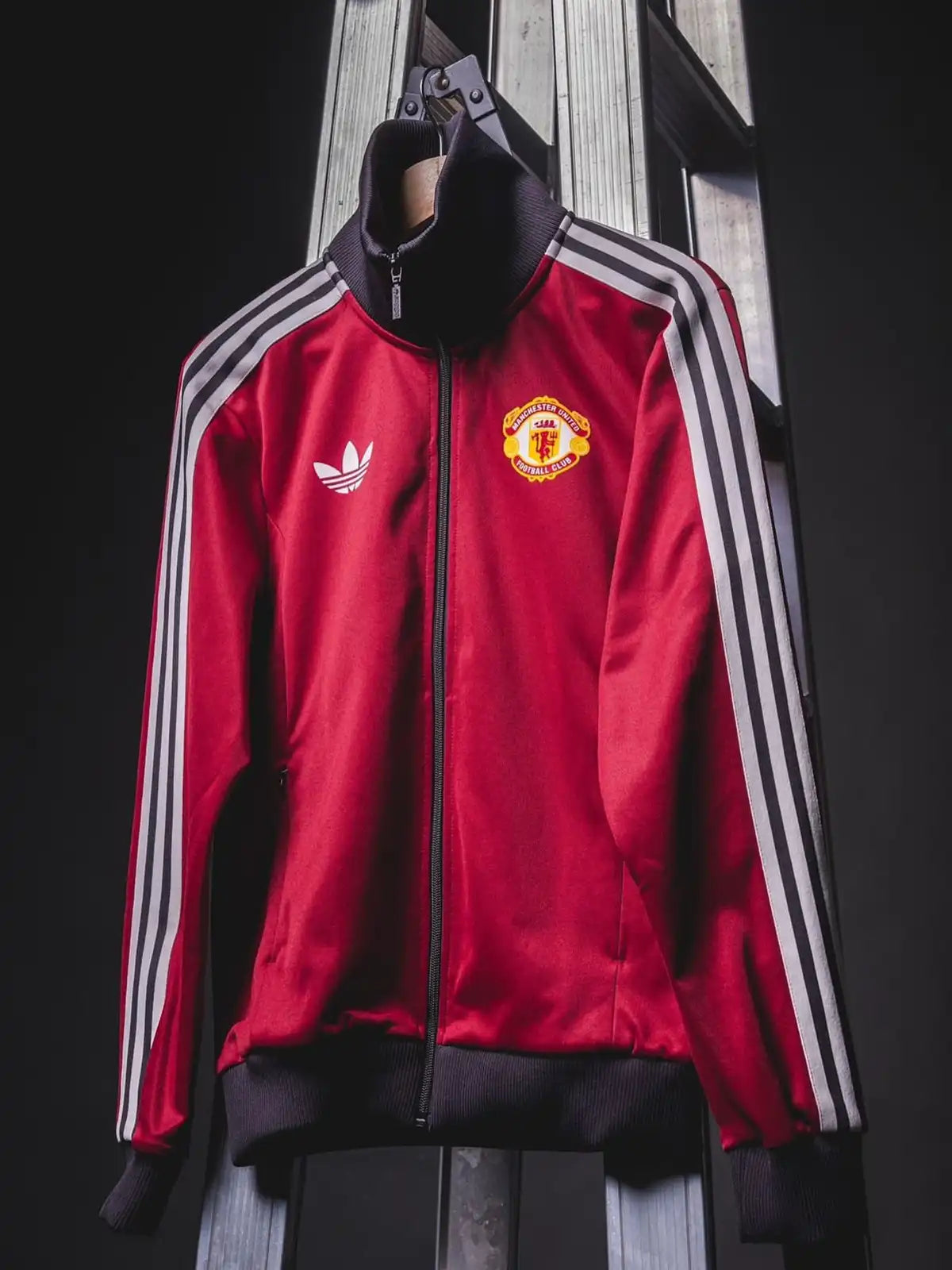 ジャケットは象徴的なレッドにブラックの襟と三つ葉ロゴを配し、パンツはクラシックなストレート基調で両者にスリーストライプスをあしらった構成となり、滑らかなトラック素材と刺繍エンブレムの組み合わせが往年のadidasとユナイテッドのアーカイブ感を強調しつつ日常着としての快適性も確保している。