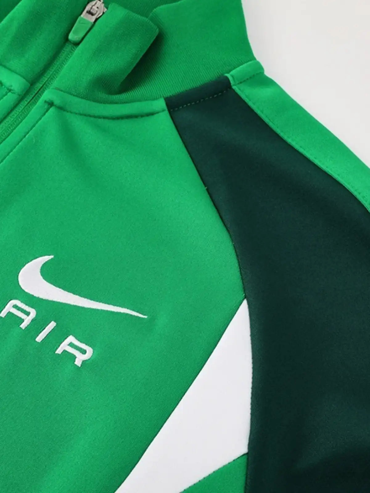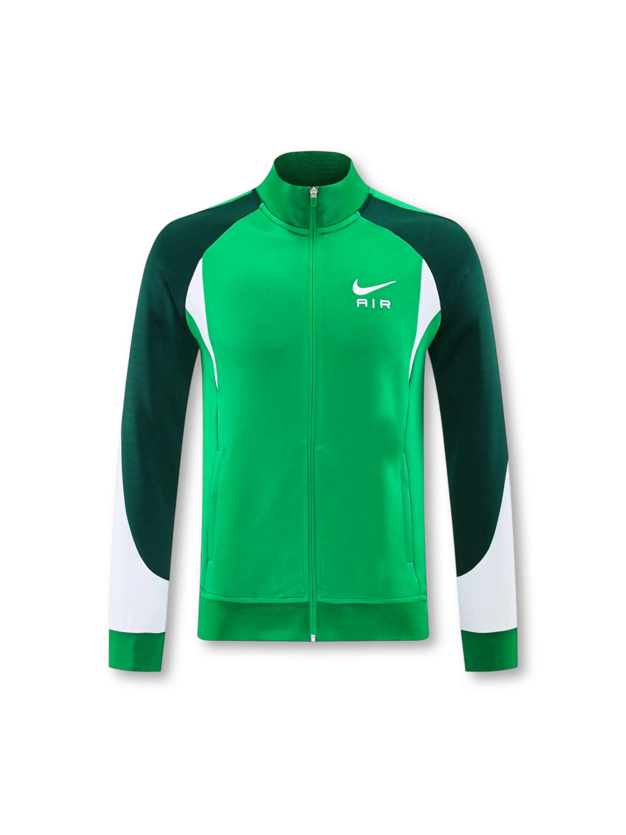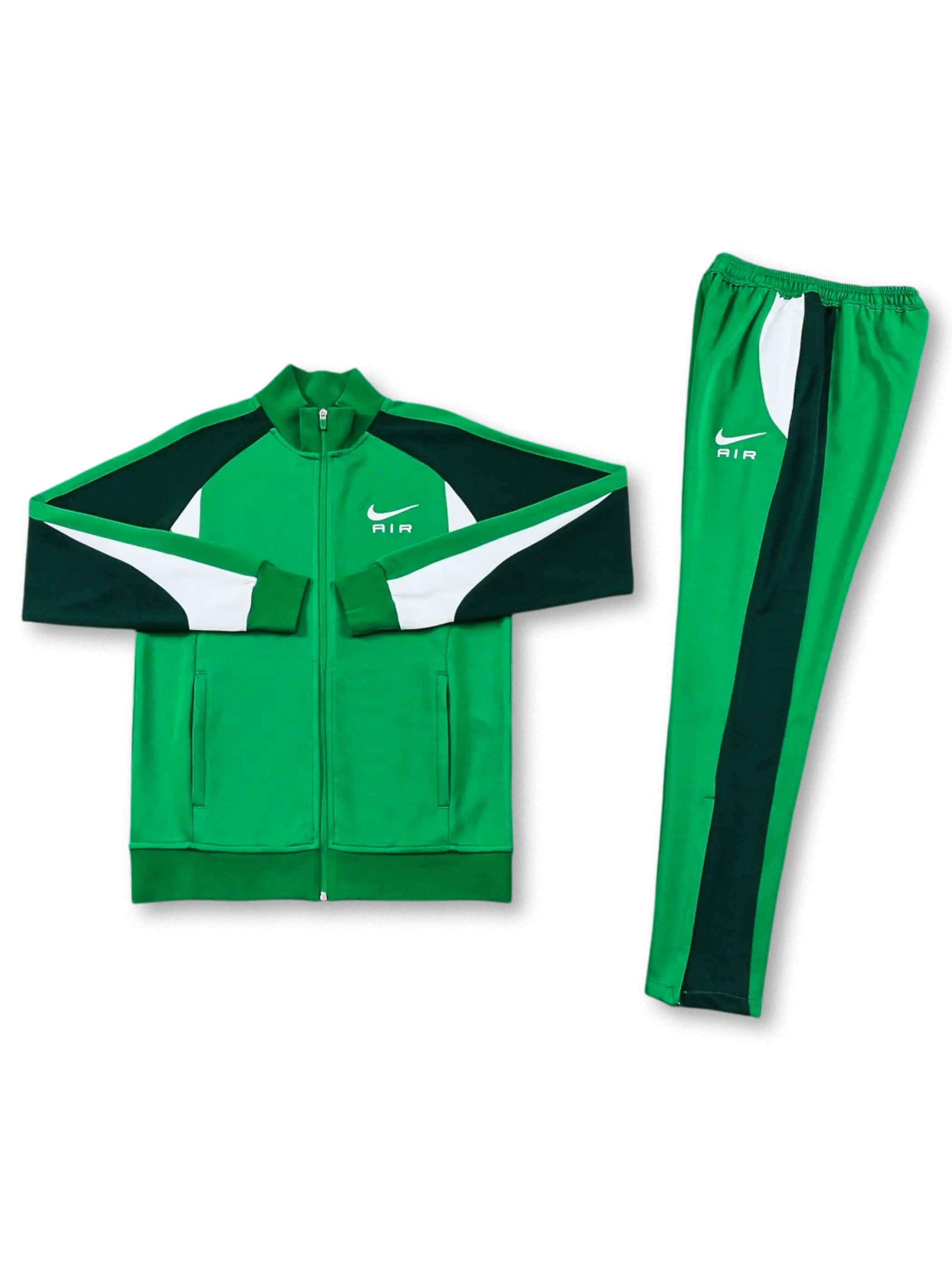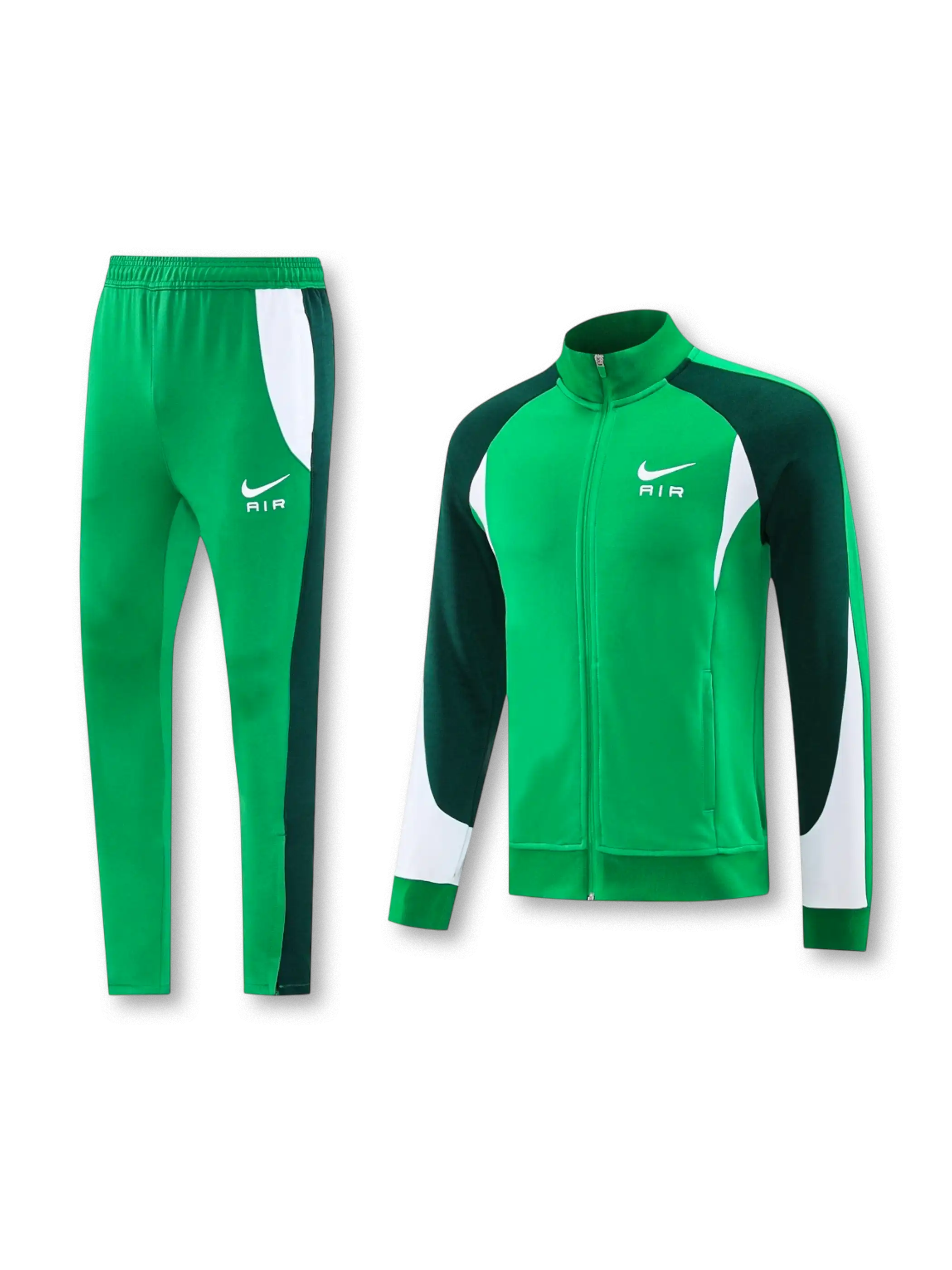 スタンドカラーのフルジップジャケットとロングパンツのセット。ジャケットは胸元にスウッシュ+AIR表記を入れ、袖から身頃にかけて濃色切替と白ラインを配置した構成。フロントはジップポケット付きで携行品を収めやすい仕様です。パンツは左腿にスウッシュ+AIR表記、サイドに濃色切替を通し、裾はジップ付きで着脱と足元の収まりを調整しやすい設計。移動・街着・軽い運動まで用途を選びにくいセットアップ。