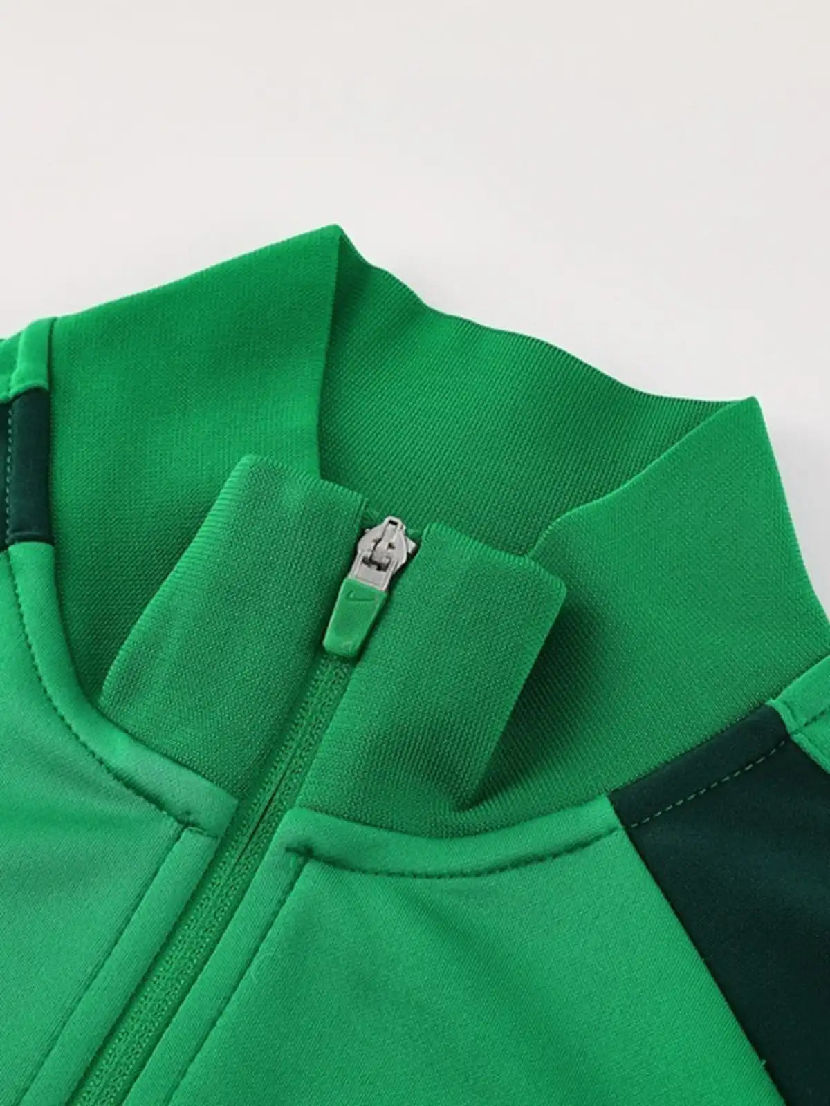 グリーン基調に濃色切替と白ラインを配した、フルジップ上下セット。