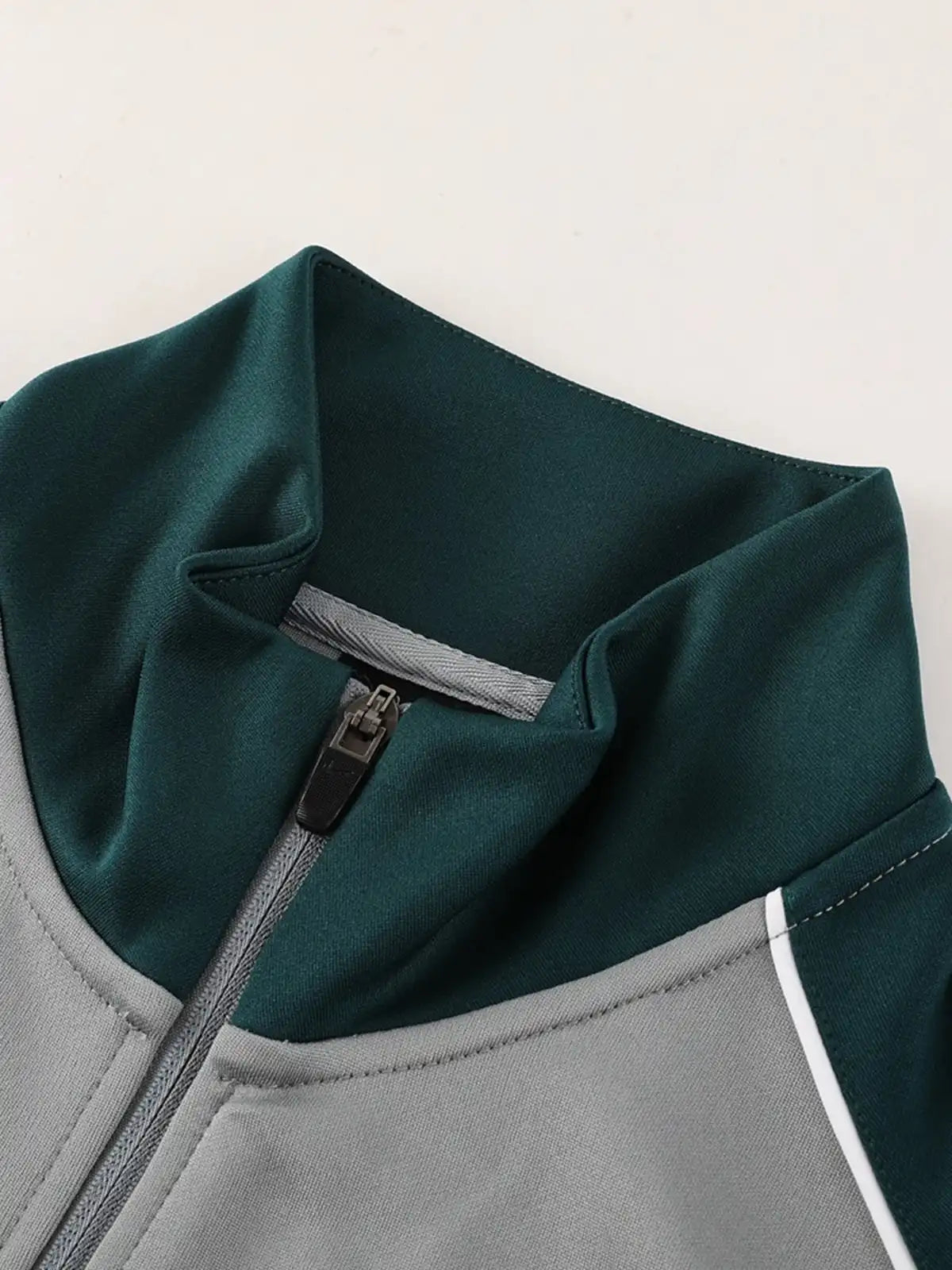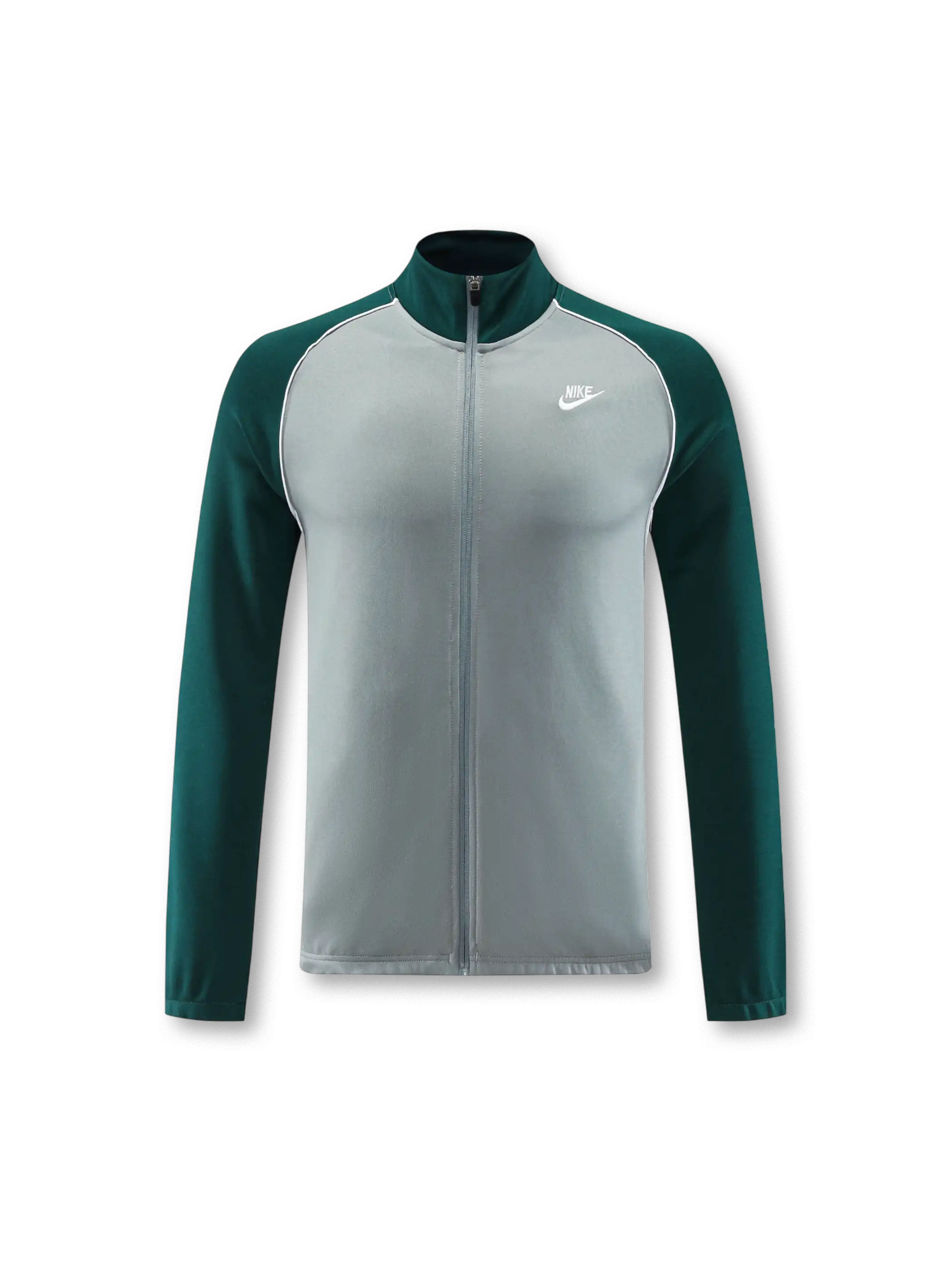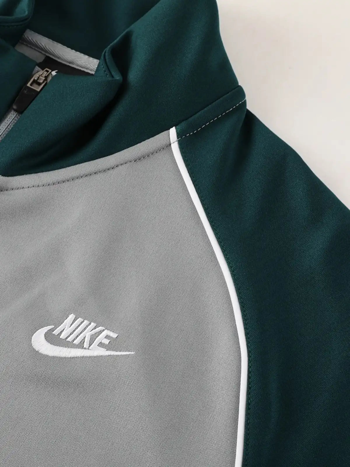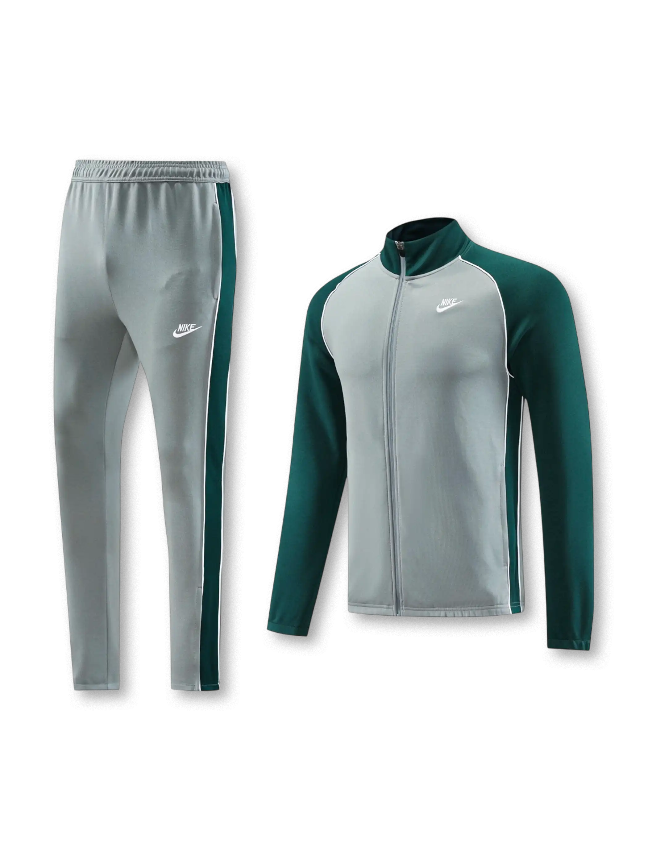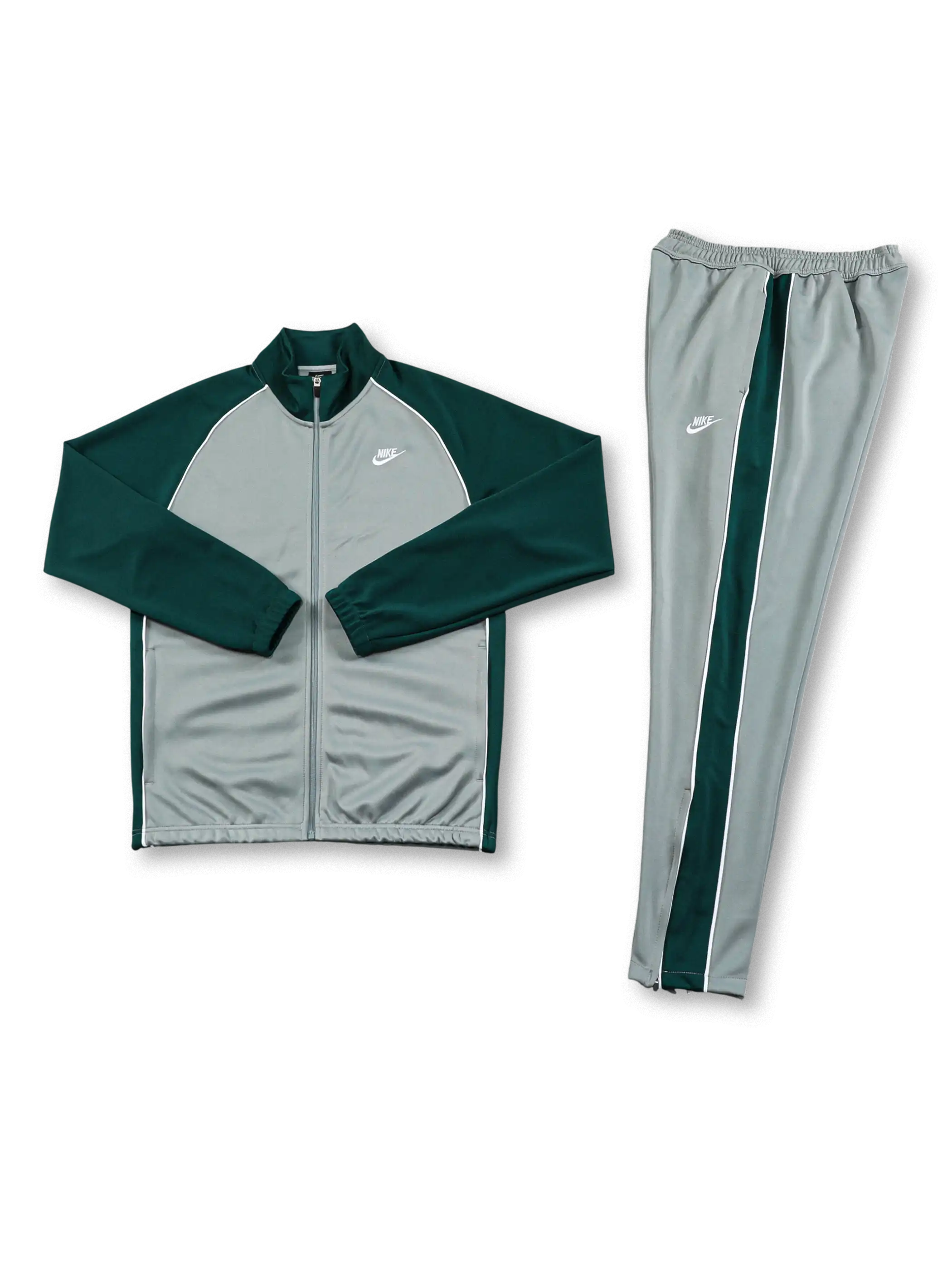 ライトグレーとダークグリーンのコントラストで構成された、Nikeらしい機能美を備えたシンプルデザインのトラックセット。