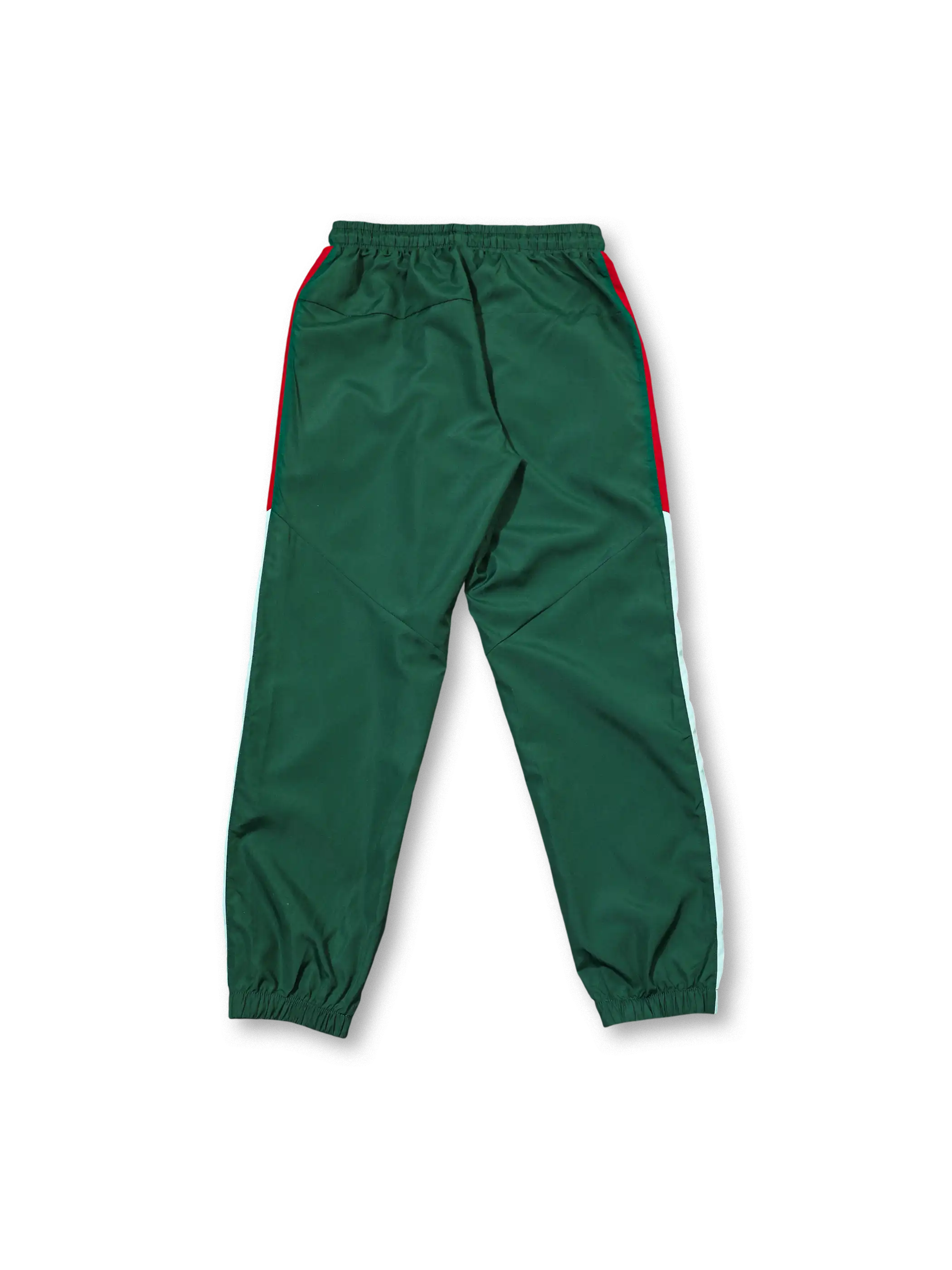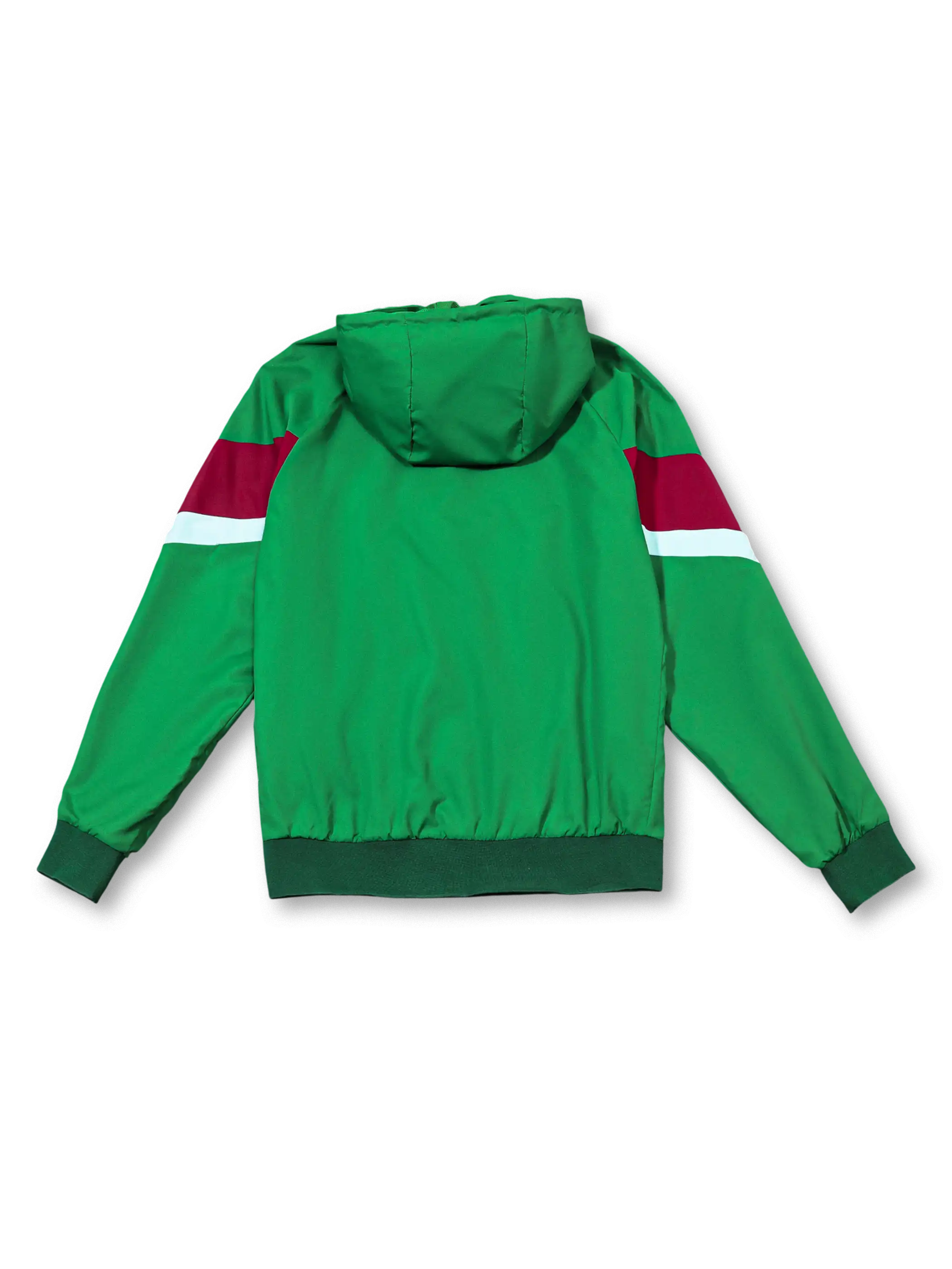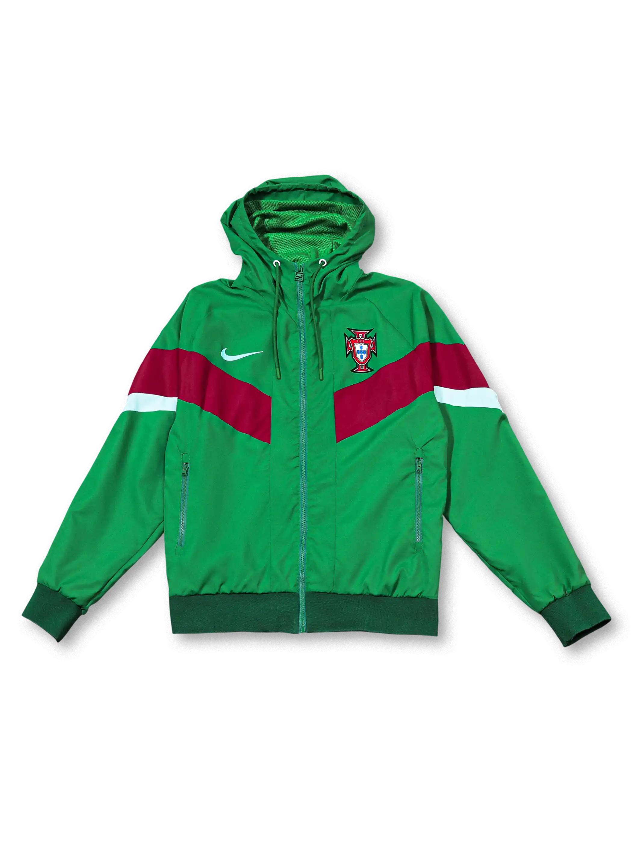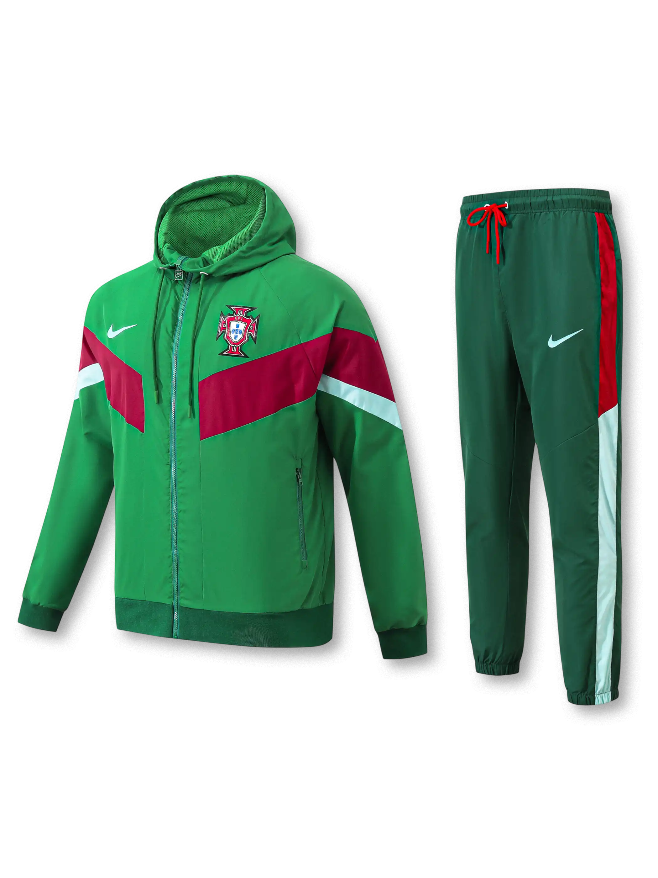 象徴的なグリーンを基調に胸部へレッドとホワイトの切り替えを入れたデザインで、軽量シェル素材を用いたフード付きジャケットと同色パンツで構成し、代表エンブレムの刺繍とNikeスウッシュを明確に配置することで、移動着や屋外トレーニングに適した機能性とポルトガル代表らしい色彩表現を両立している。