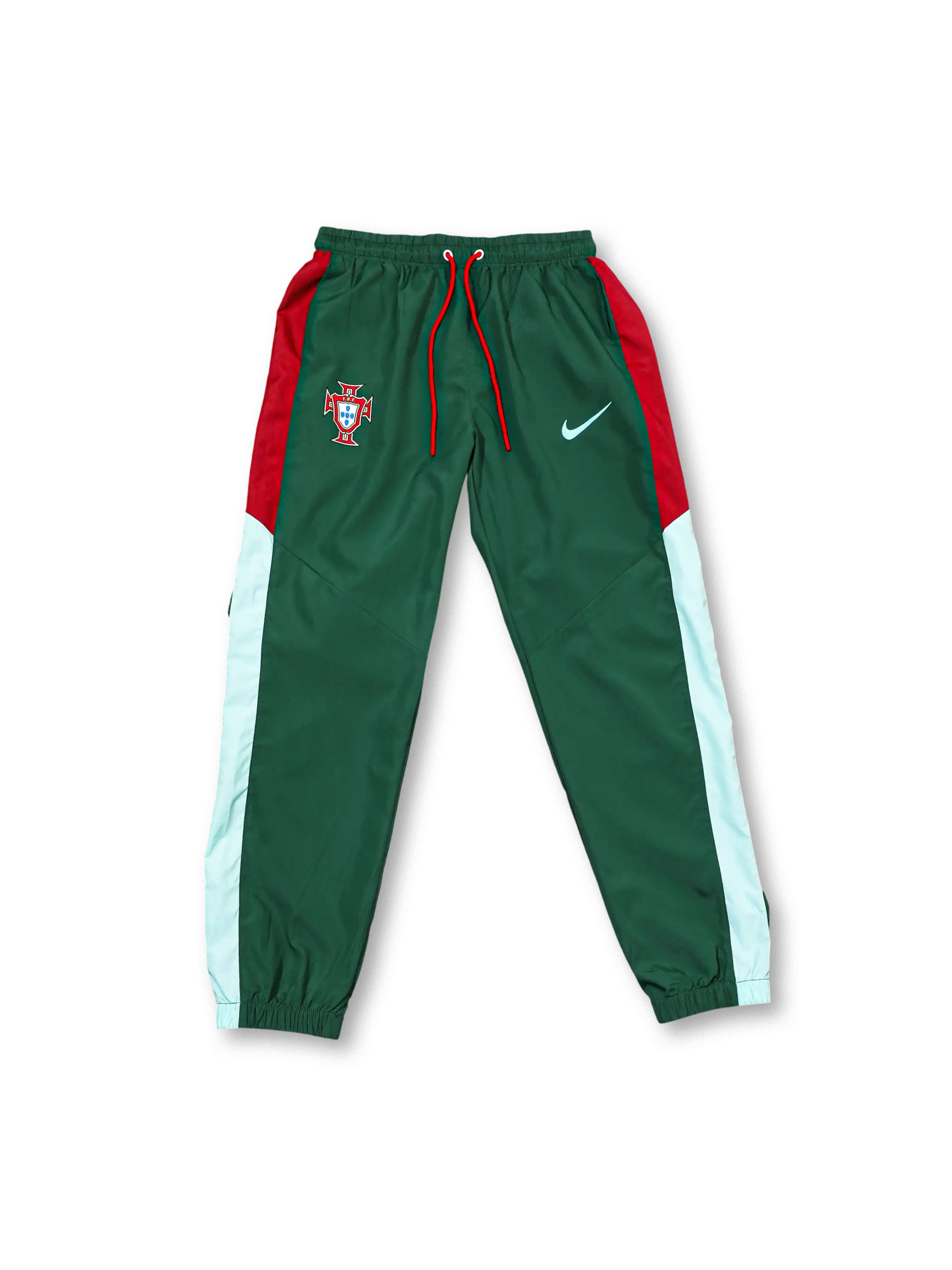 ポルトガル国旗を象徴するグリーンとレッドを軸に構成し、代表エンブレムとNikeスウッシュを配した実用的なトレーニング用セットアップ。