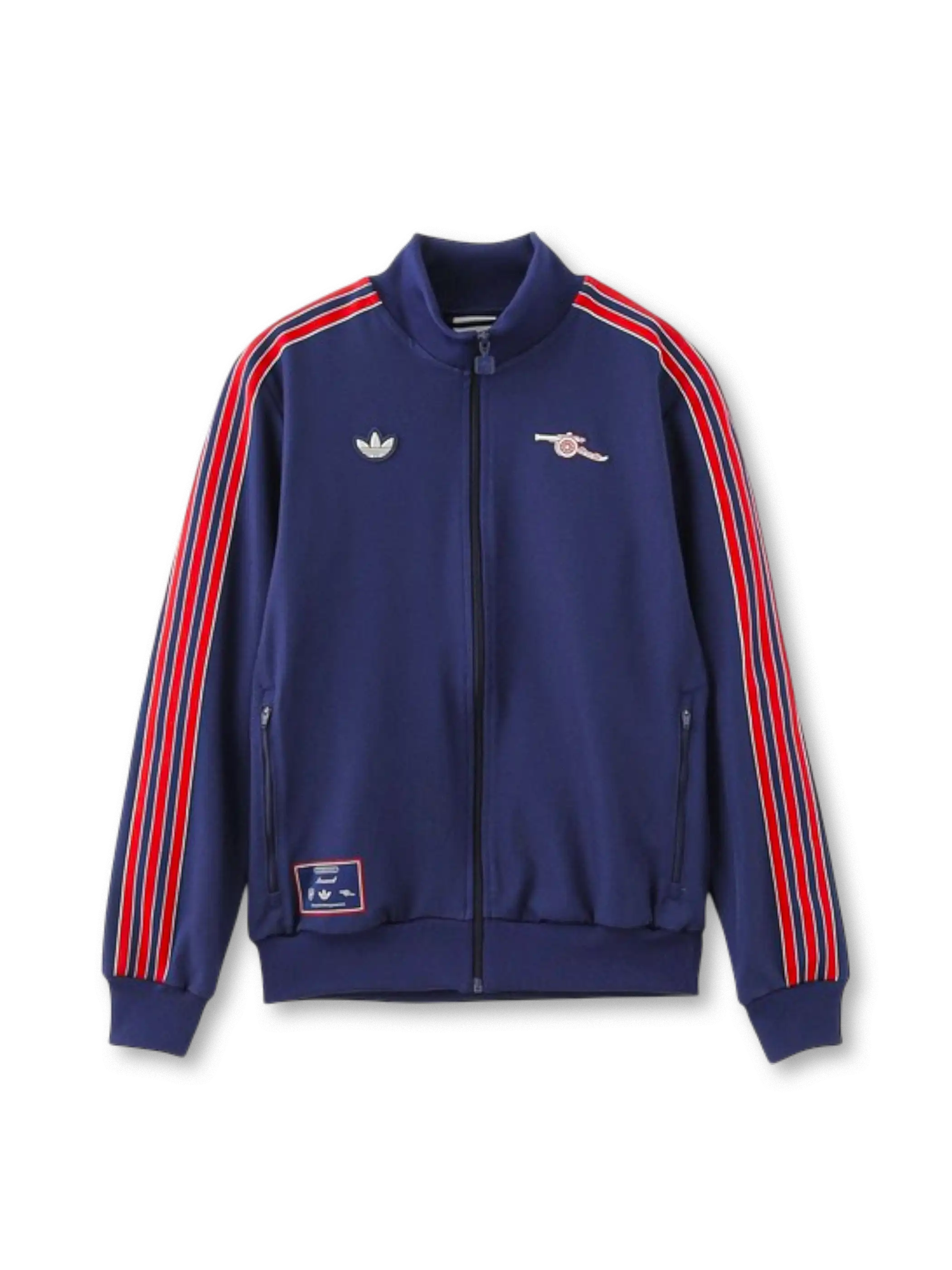 ネイビーカラーを基調にレッドラインを配したトラックジャケットとパンツの上下セットで、縫製によるクラブモチーフと織りネームが特徴。スリムで流れるようなシルエット設計により動きやすさを確保し、再生素材を一部に採用することで日常使用に適した快適性と環境配慮を両立している。
