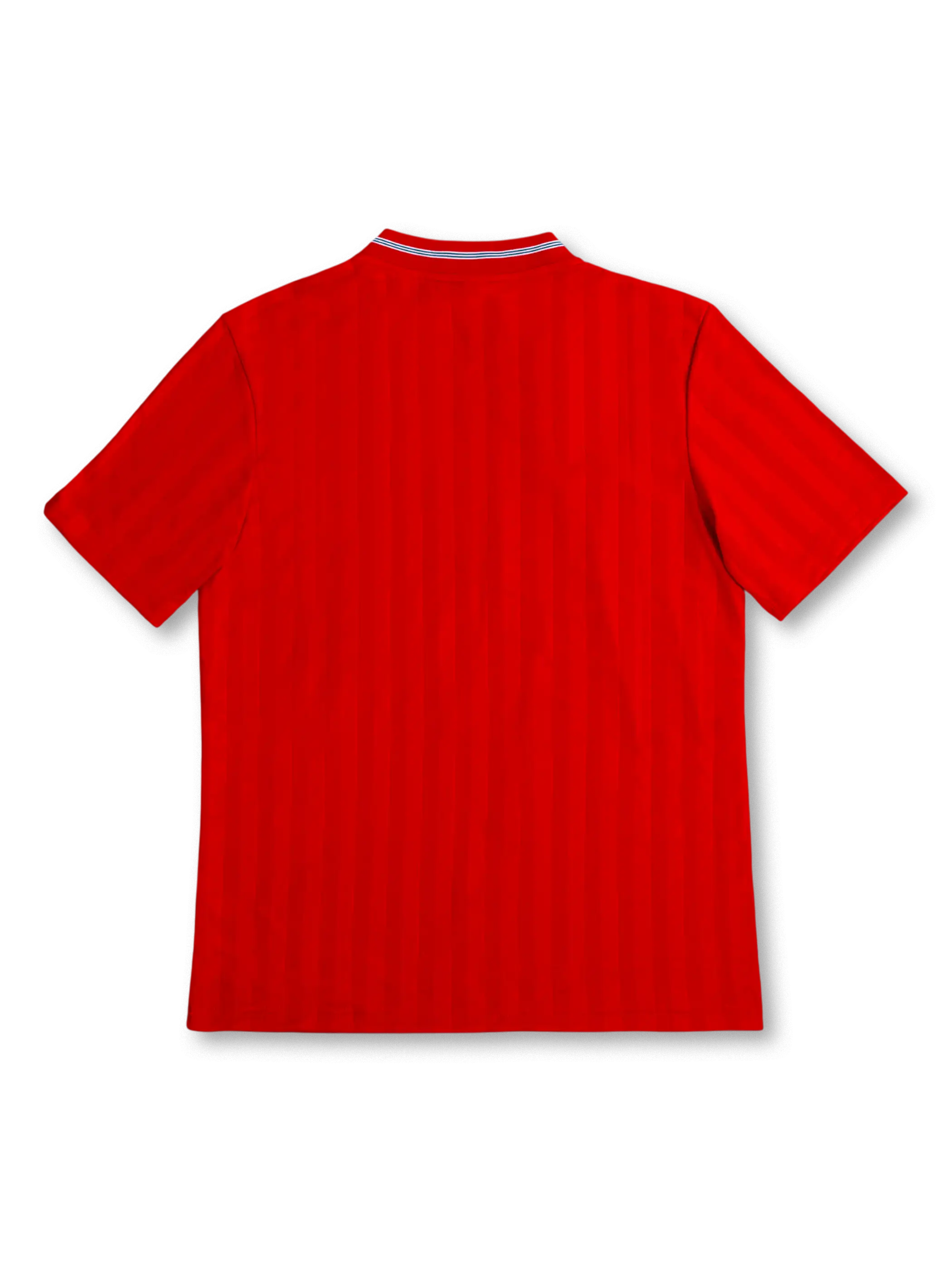 鮮やかなレッドを基調に細かなストライプ織り柄を配したミニマルなデザインで、胸には旧仕様のスリーレオパードエンブレムを刺繍し、アンブロ特有のVネックとシンプルなカッティングが80年代代表モデルらしいクラシックな雰囲気を保つ一着。