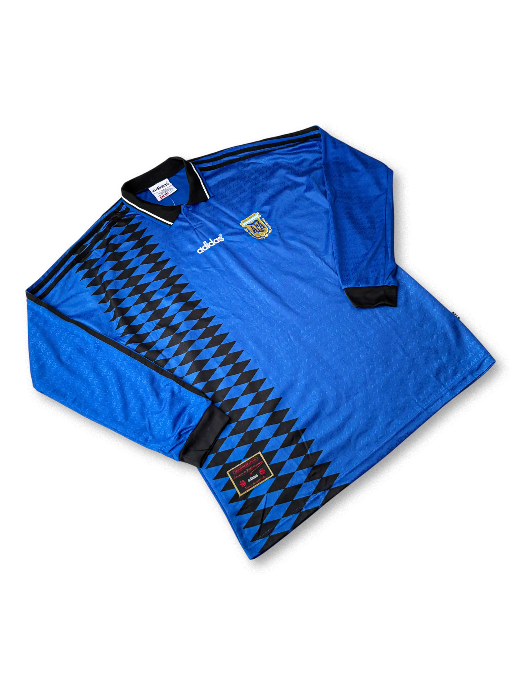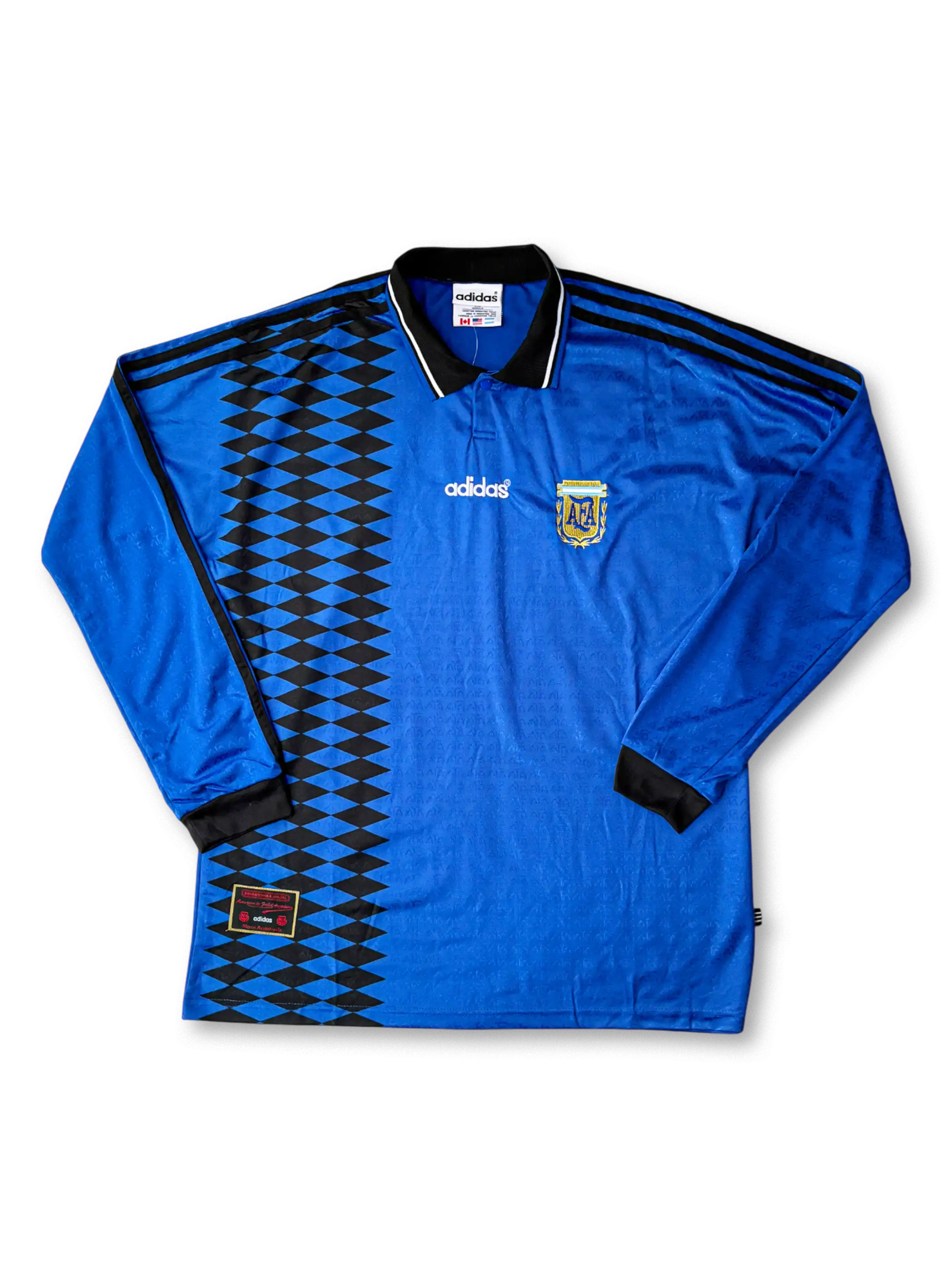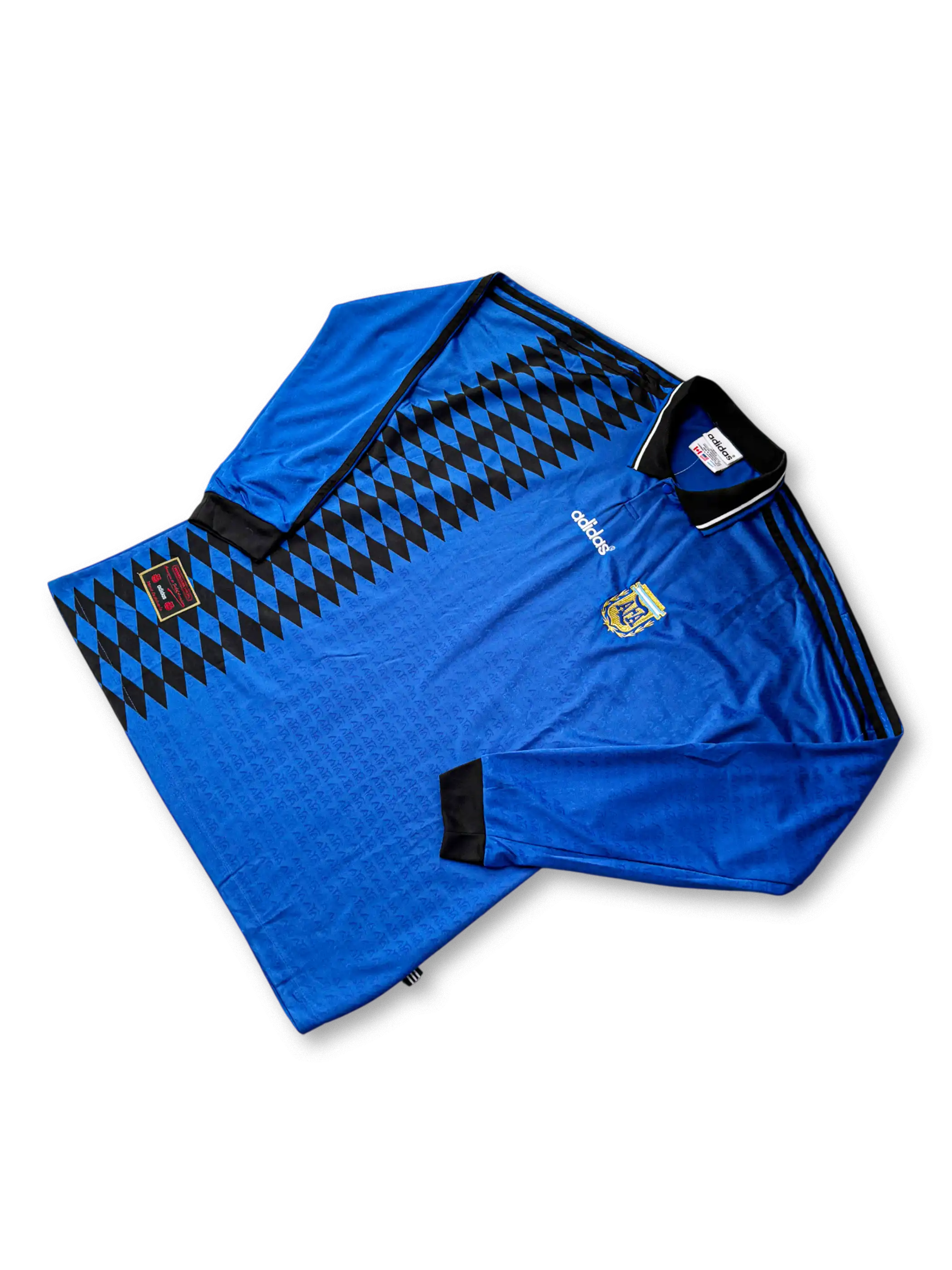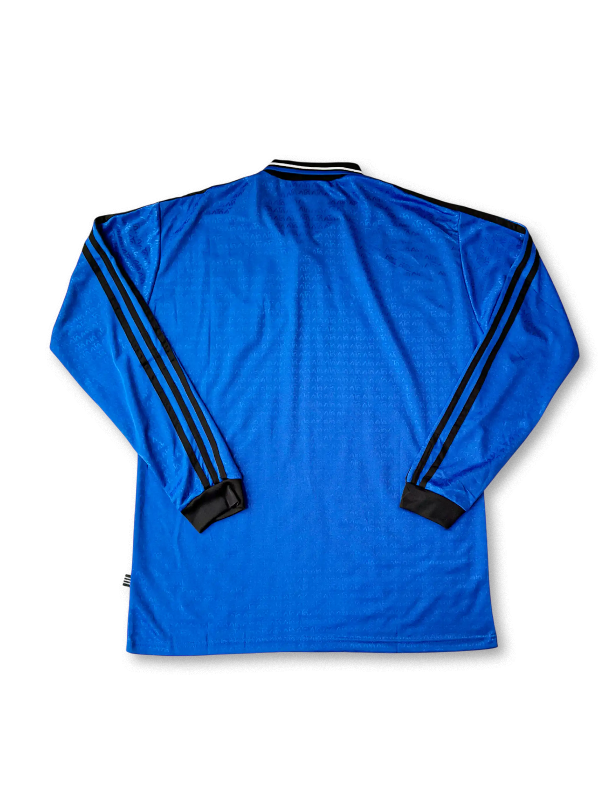 ブルー基調にブラックの幾何学グラフィックを配した特徴的デザインで、AFAエンブレムとトレフォイルロゴが刺繍で施され、90年代アディダスの象徴的ディテールが際立つ。長袖仕様のためシルエットが美しく、当時のアウェイキットとして現存数が少なくコレクション価値が高い一着。