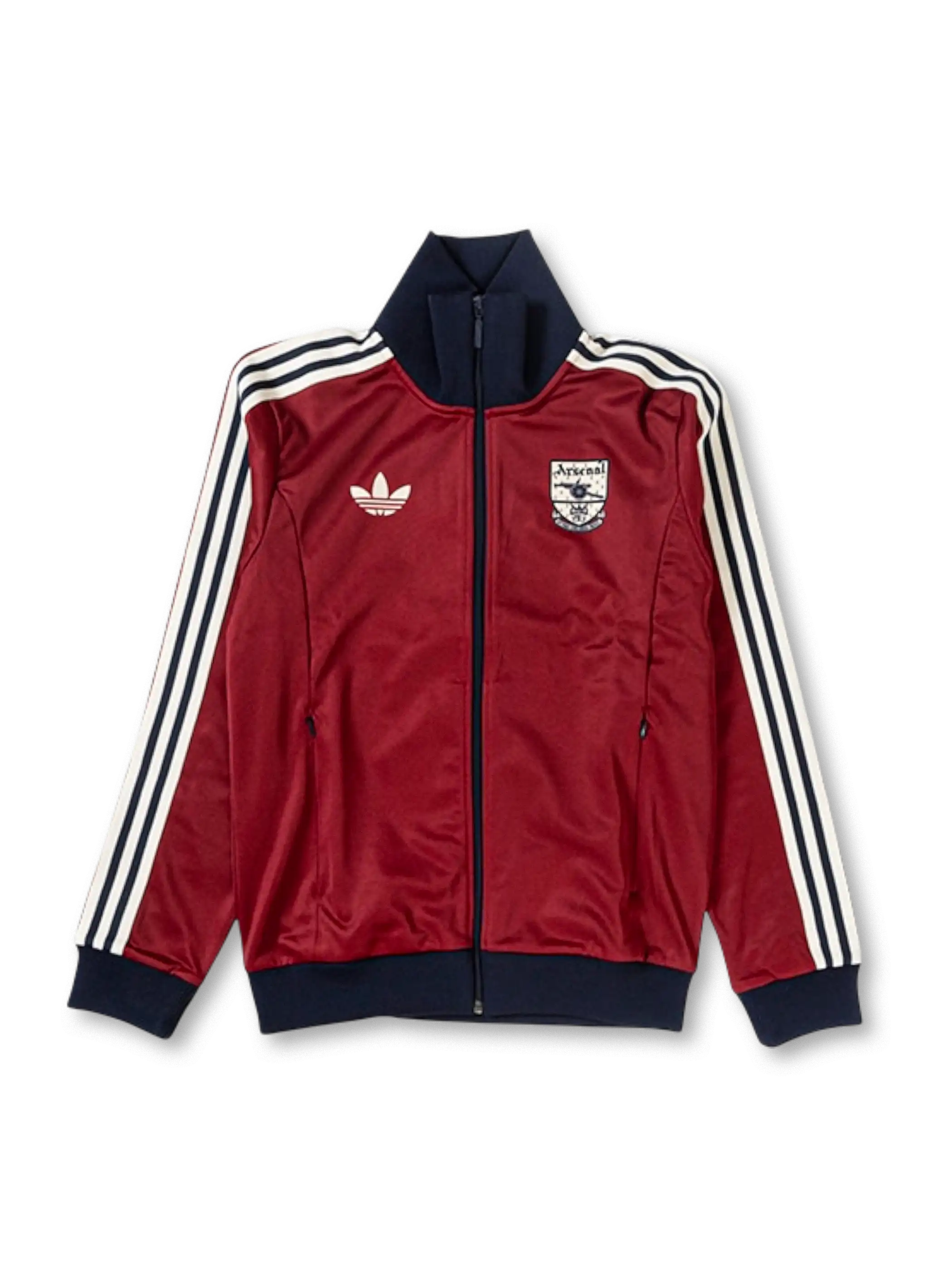 レッドを基調としたトラックジャケットとネイビーのロングパンツによる上下セットで、クラブモチーフとトレフォイル調デザインを配置。肩から袖にかけたストライプ構成とリブ仕様がクラシックな印象を強め、修身シルエットにより日常使いしやすいバランスに仕上げられている。