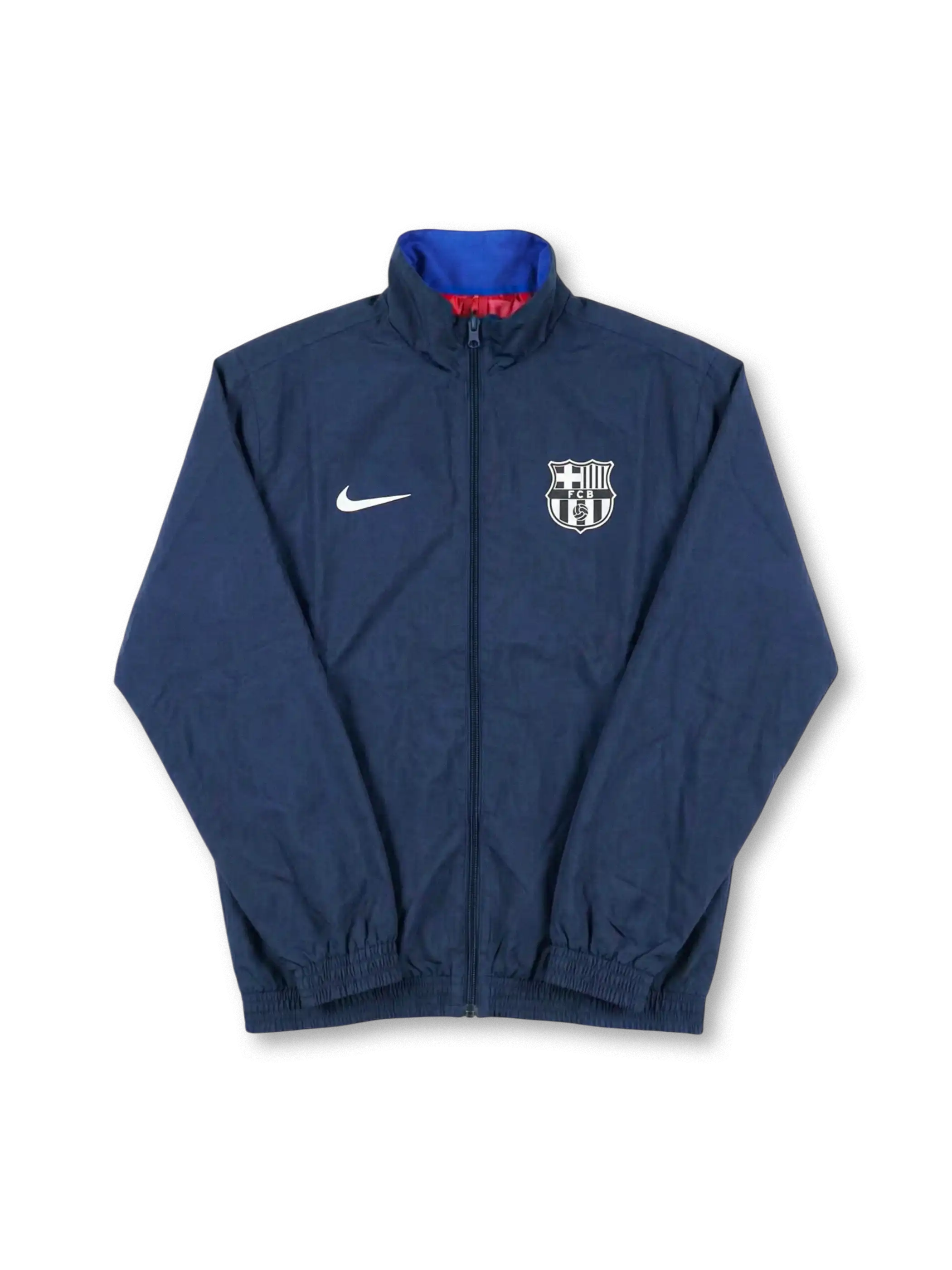 赤青ストライプに抽象的な都市モチーフを重ねた総柄デザインと、落ち着いたネイビートーンの両面を切り替えて着用できるリバーシブル構成が特徴で、刺繍クラブエンブレムとスウッシュが90年代のNikeスポーツアパレルらしい簡潔な配置でまとめられ、軽量繊維による扱いやすさと当時のクラブ文化を示す復刻的要素を併せ持つ。