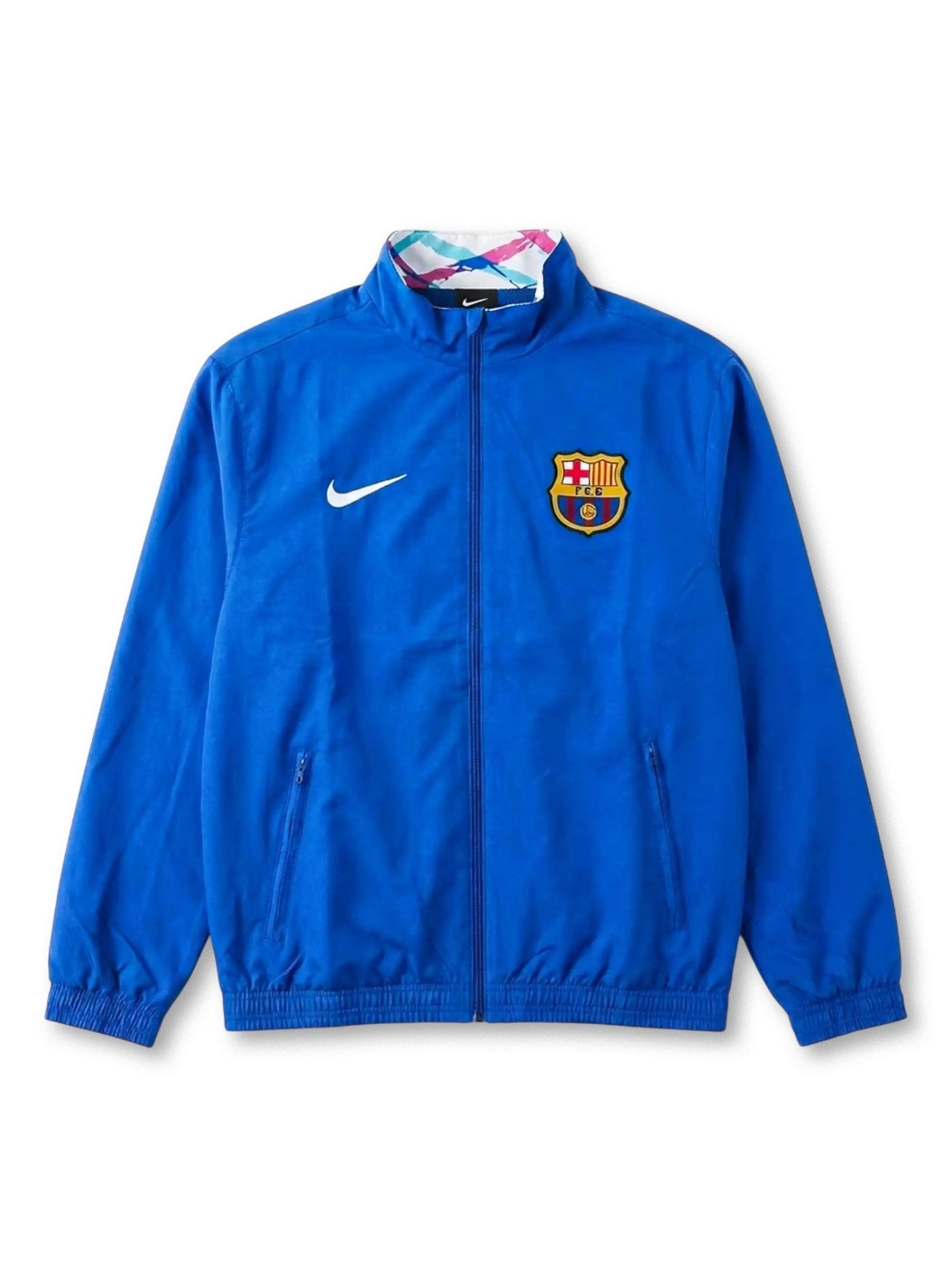 クラブ初期ナイキ時代を想起させる抽象スプラッシュ柄とソリッドブルーを両面で切り替えられる、1992年前後の意匠を再現したリバーシブルトラックジャケット。