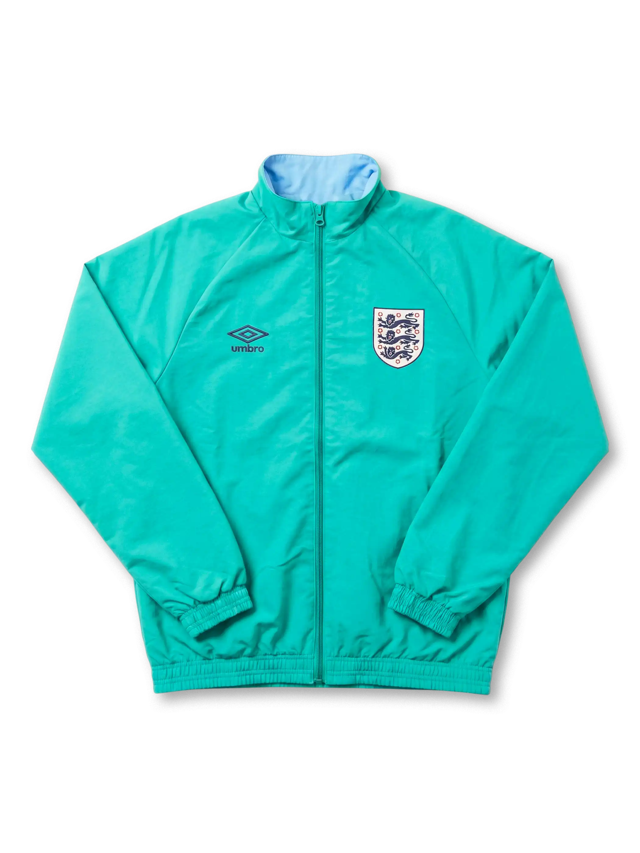 アクア系の90年代らしい発色を用いたアウェイスタイルに、裏面ではスリースライオンを大胆に配置した総柄デザインが映えるリバーシブル仕様で、Umbroロゴとエンブレムをシンプルにまとめつつ軽量シェル素材が快適な着用感と高い視覚的インパクトを両立する構成。
