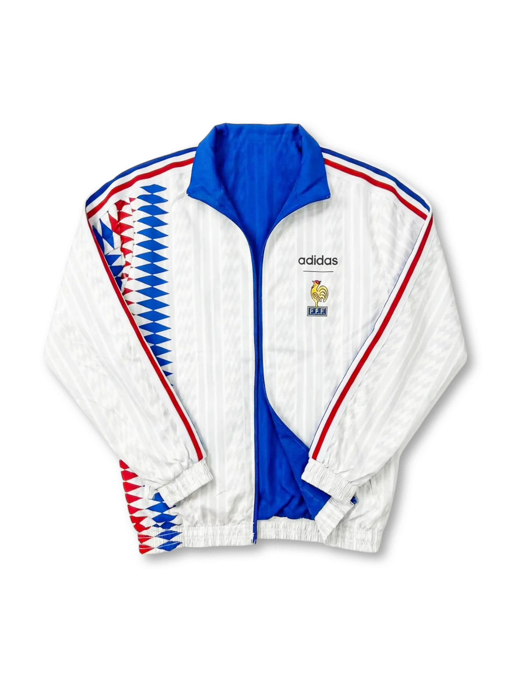 象徴的なトリコロールと連続した幾何学パターンを肩から脇に配したデザインで、ホワイト面とブルー面の双方に90年代特有のジャカード調ストライプを施し、胸にトレフォイルロゴとFFFエンブレムを組み合わせることで、当時の美学を忠実に再現したリバーシブル構造が特徴となっている。