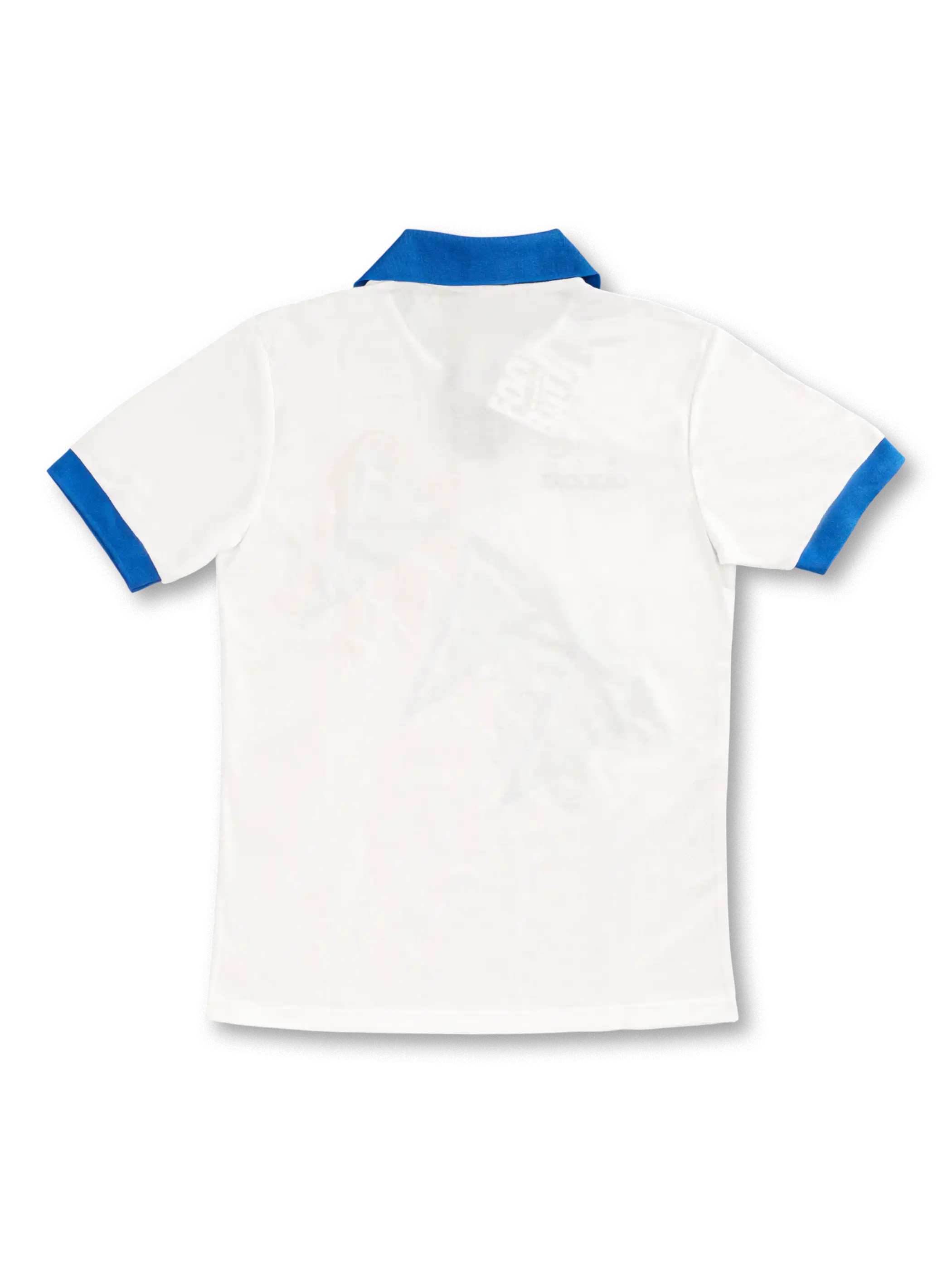 ホワイトを基調にイタリア国旗カラーを大胆に再構築した抽象グラフィックを前面に配し、当時のdiadoraらしい手描き風デザインが存在感を放つ一着で、襟と袖口には鮮やかなブルーを採用し、軽量素材とクラシックなシルエットが90年代特有の躍動感を感じさせる希少モデルです。