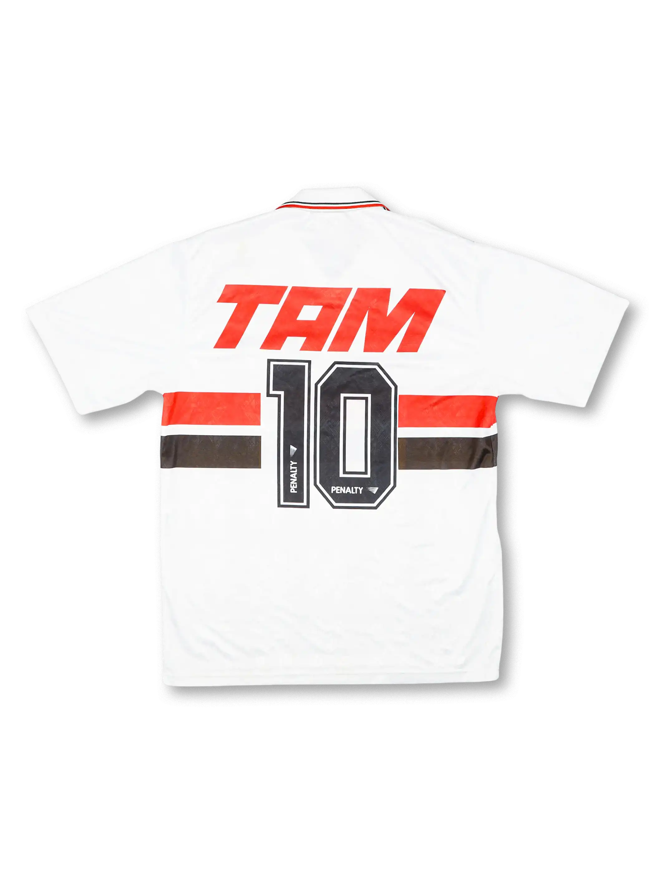 ホワイトを基調に胸元へクラブ伝統の赤・白・黒ストライプを大胆に配したPenalty製のクラシックデザインで、V字襟と細ラインのトリコロールディテールが90年代の特徴を明確に示す。胸と背面に大きく配置された「TAM」スポンサーが当時のブラジルサッカー文化を象徴し、10番仕様はチームのプレーメイカーを思わせる希少な一枚として評価される。