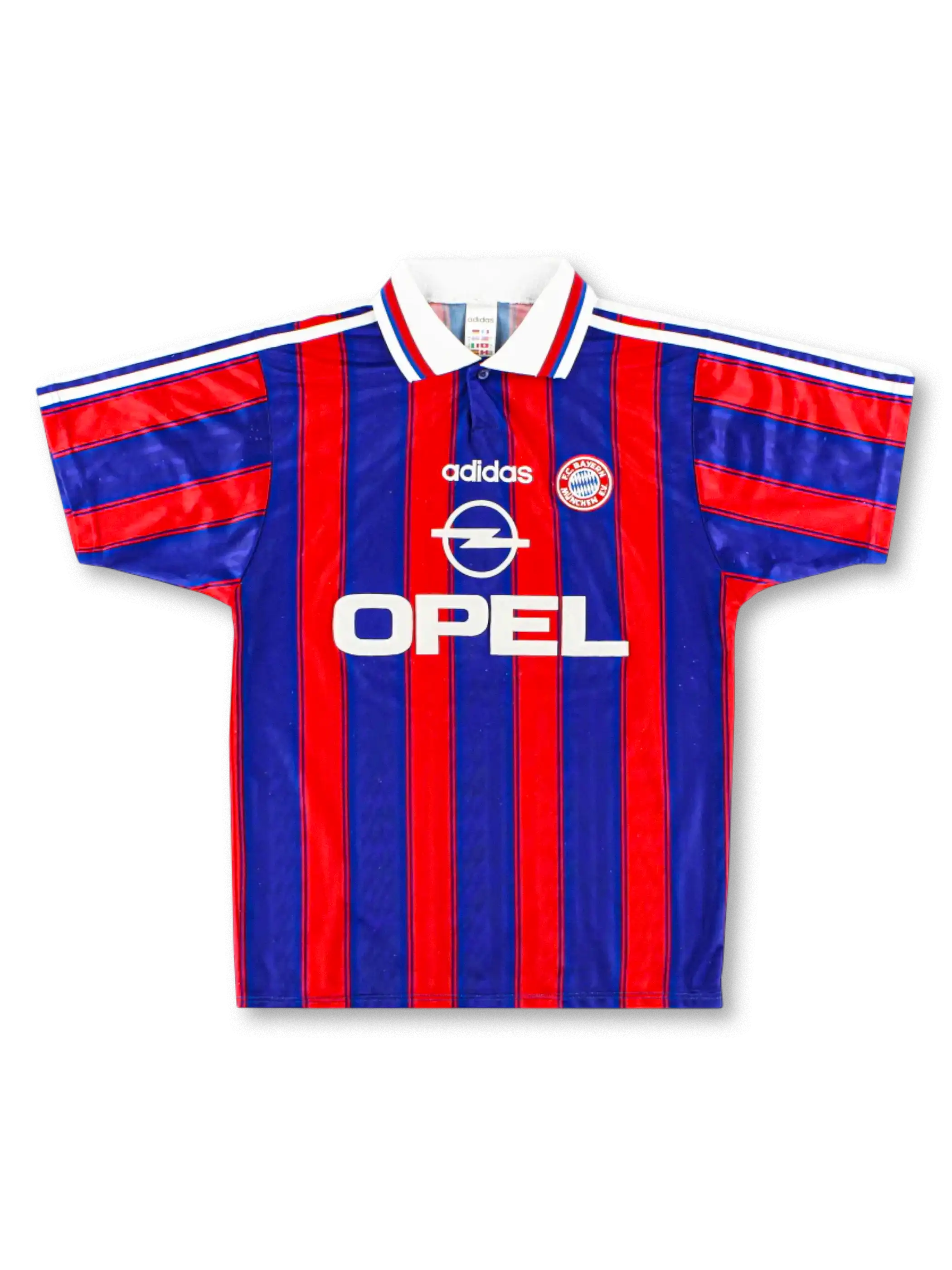 深いブルーと鮮やかなレッドの縦ストライプに、白い襟と三本線を組み合わせたミッド90sを象徴するデザイン。胸にはOPelスポンサーとアディダスロゴが並び、背面には「KLINSMANN 18」が大きくプリント。光沢のあるポリエステル生地が90年代ならではの存在感を演出し、クラシックなカットと色彩がバイエルン黄金期の雰囲気を体現する一着。