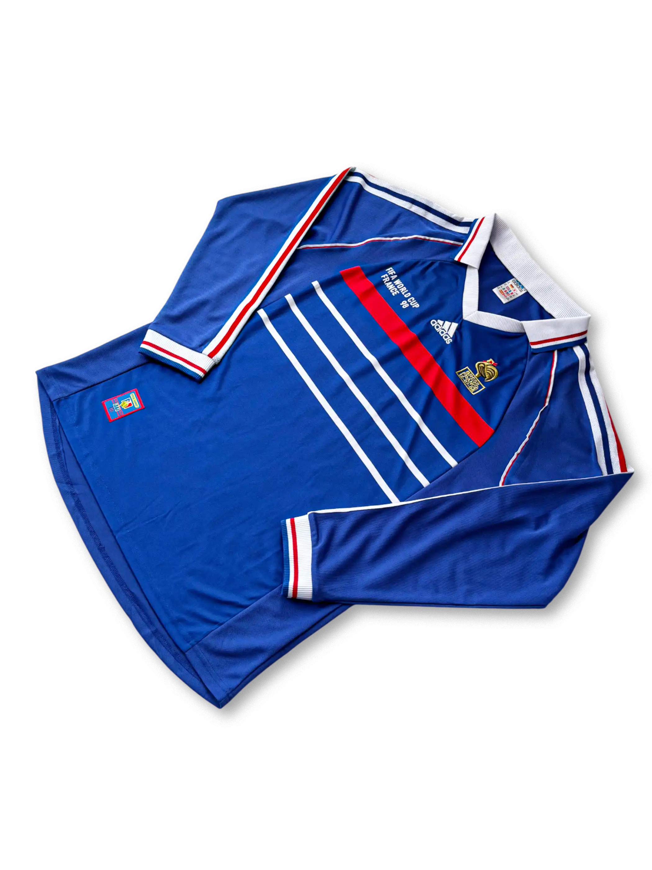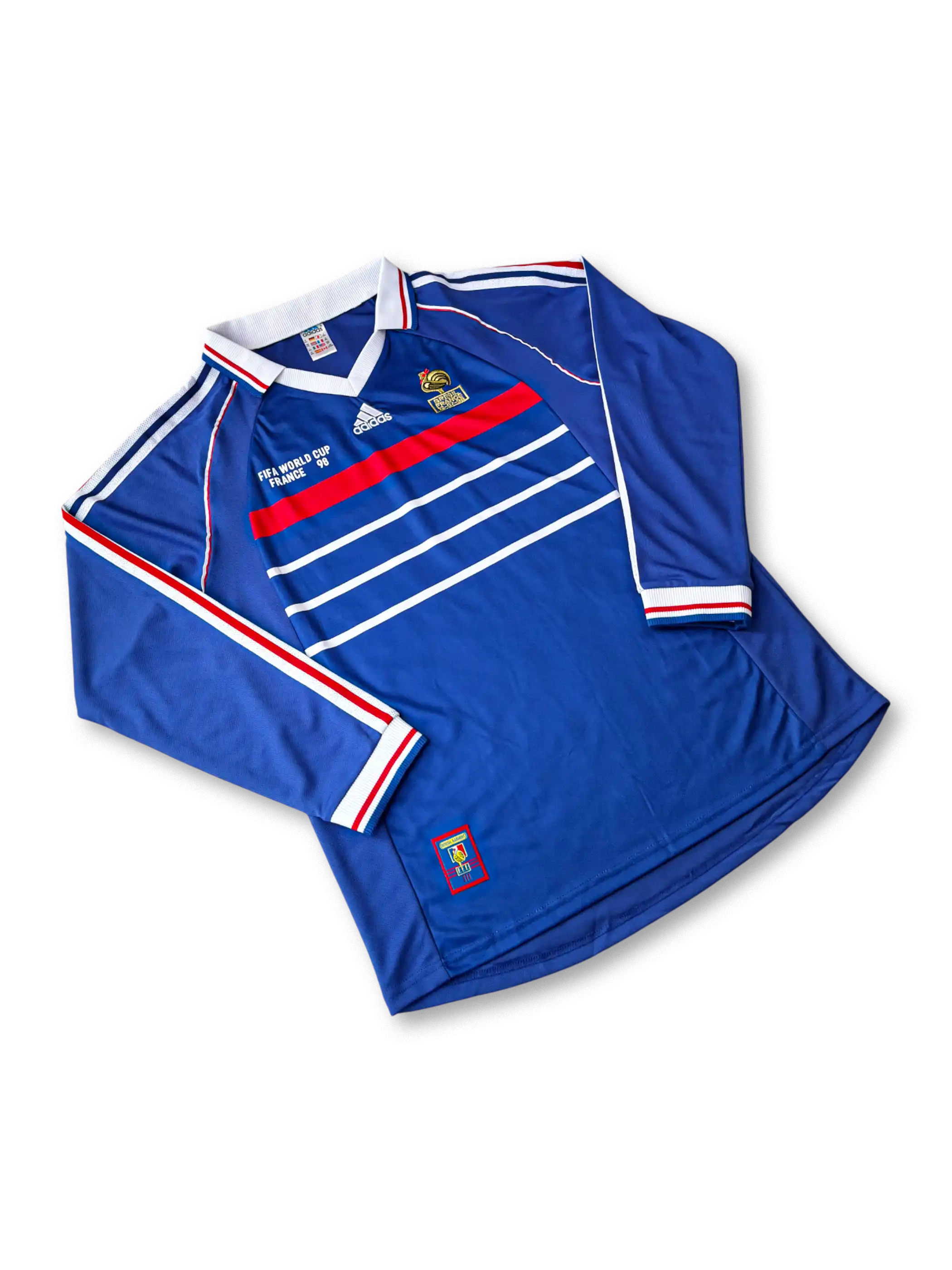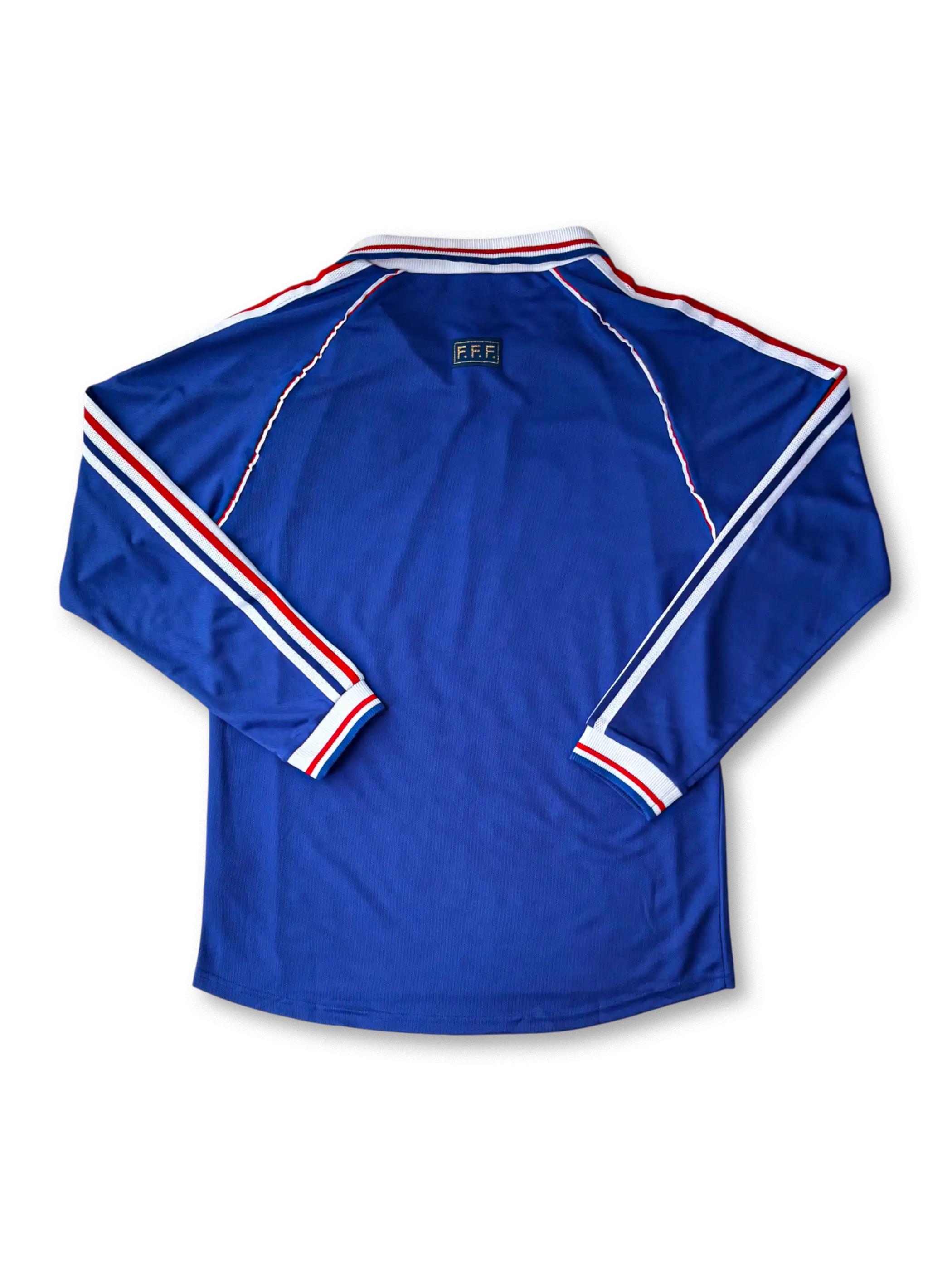 1998年フランス大会専用に設計されたホーム長袖モデルで、象徴的な青基調と胸部レッドライン、FFF刺繍が特徴のクラシック仕様。