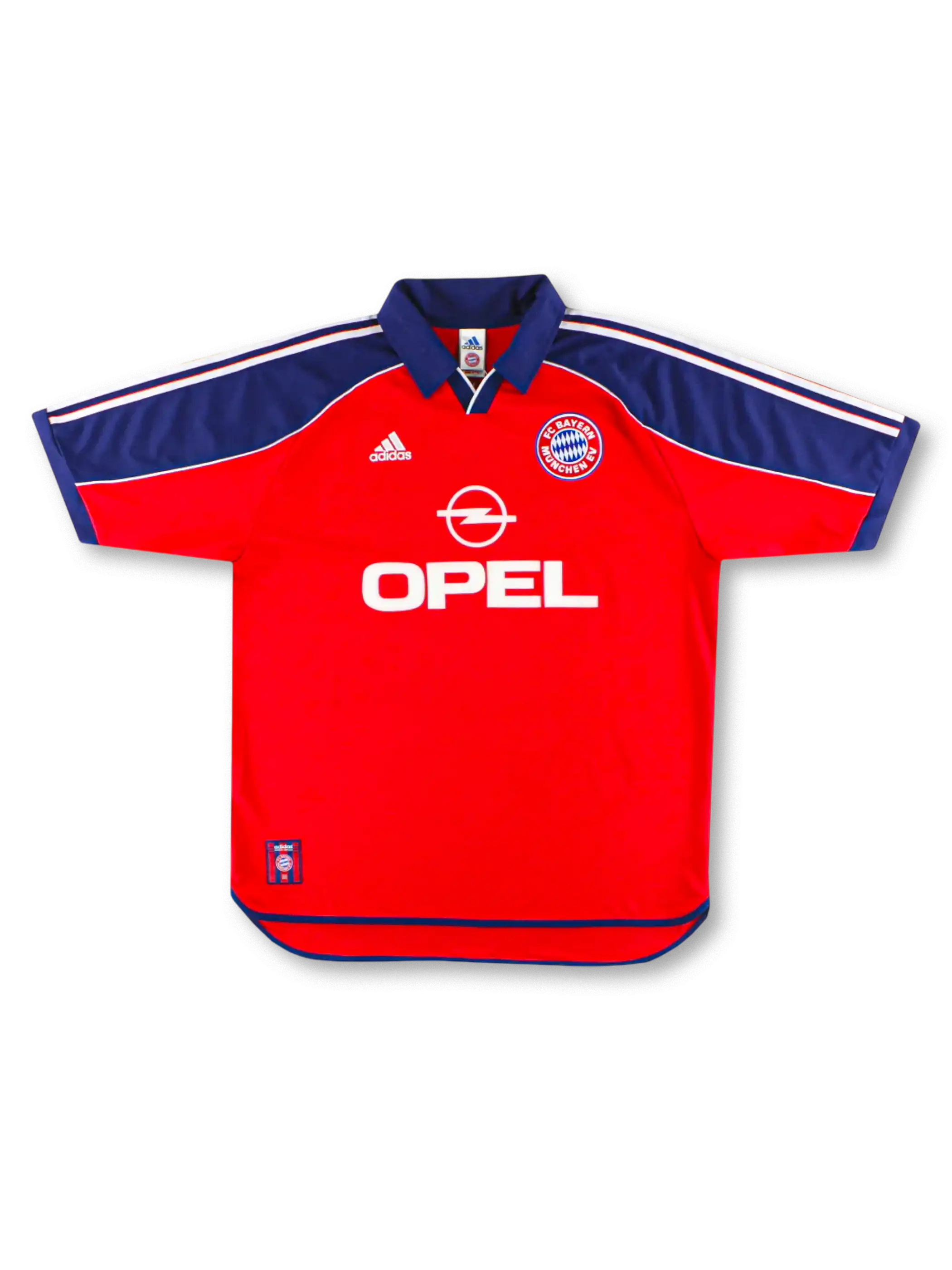 鮮やかなレッドをベースに、肩から袖へと大胆に走るネイビーの切替が印象的なデザイン。OPELスポンサー、トレフォイルから現行ロゴへ移行後のadidas刺繍ロゴ、クラブエンブレムの組み合わせが、90年代後期のバイエルンらしい存在感を放つ。袖と襟のネイビー配色がユニフォーム全体に締まりを与え、クラブの近代化が進む時代のアイコニックな一着となっている。